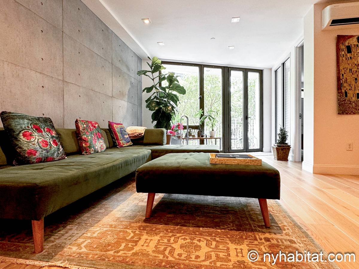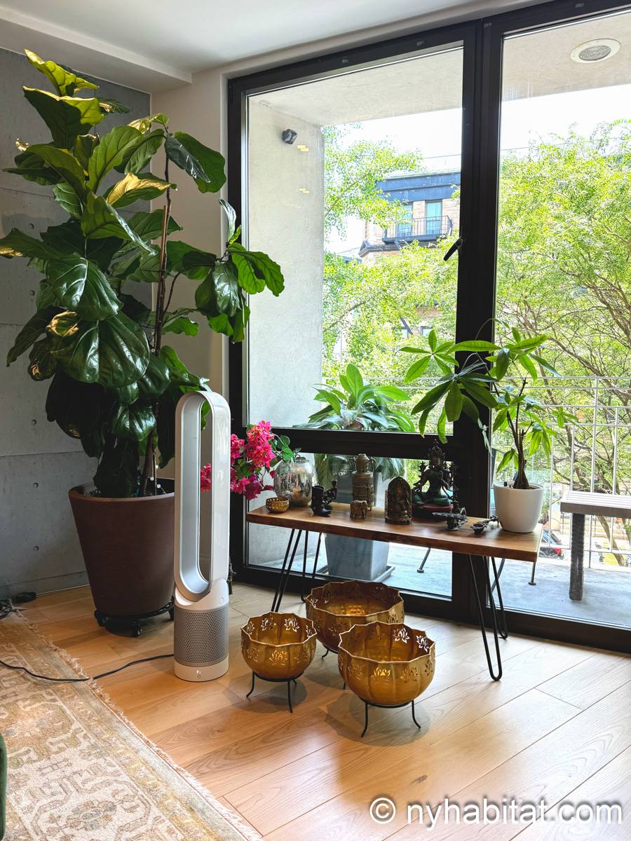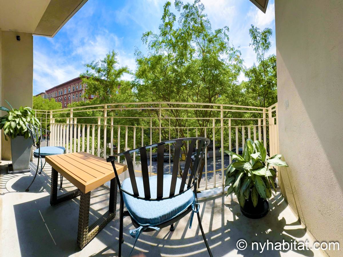 Step inside and you will find a living room with hardwood floors, air conditioning and a sofa. There is access to the balcony here, where there are chairs and a view of greenery. The bedroom also has hardwood floors, air conditioning, and a sofa. You will find a double-size bed to sleep on and a ceiling fan. The bathroom has a walk-in shower with a rainfall showerhead.