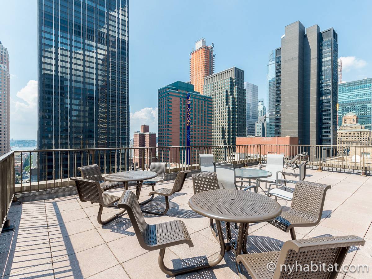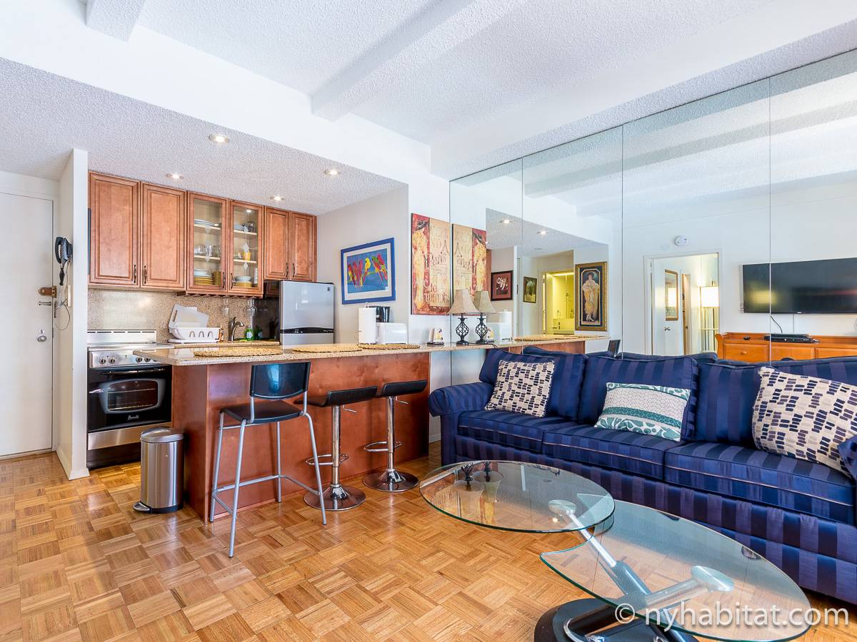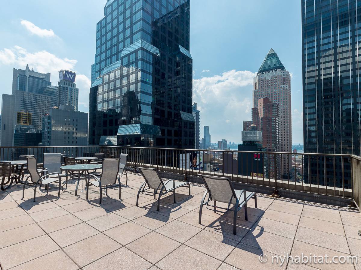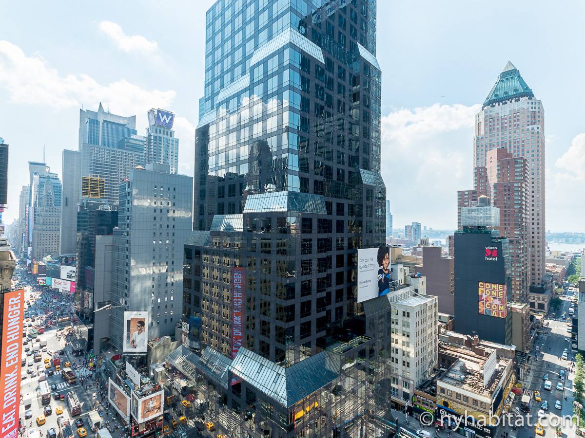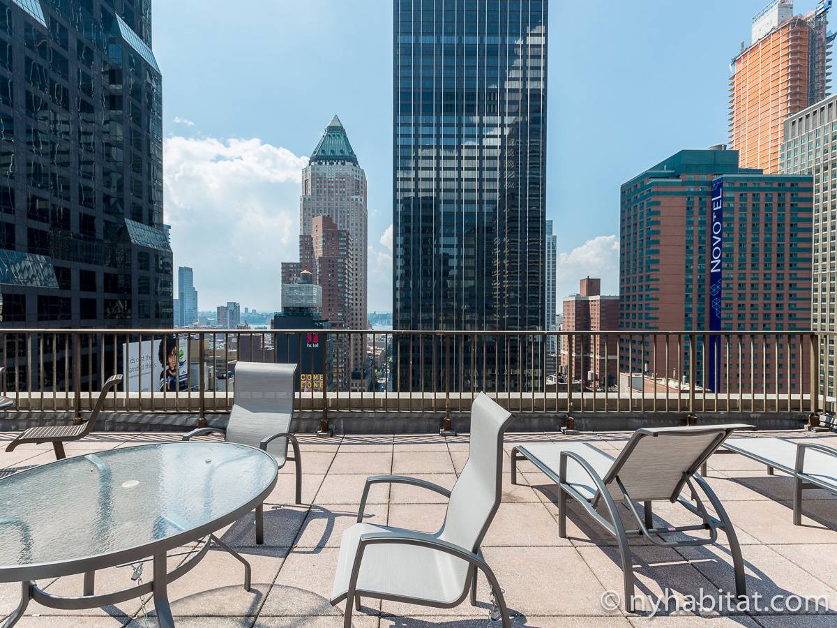 Welcome to this fully furnished one bedroom apartment New York City. You will find it in bustling Midtown West, in the heart of Manhattan, at the corner of 51st Street and 7th Avenue. It is located on the 15th floor of a high-rise building with elevator, doorman and concierge, laundry facilities, a gym and a rooftop terrace.