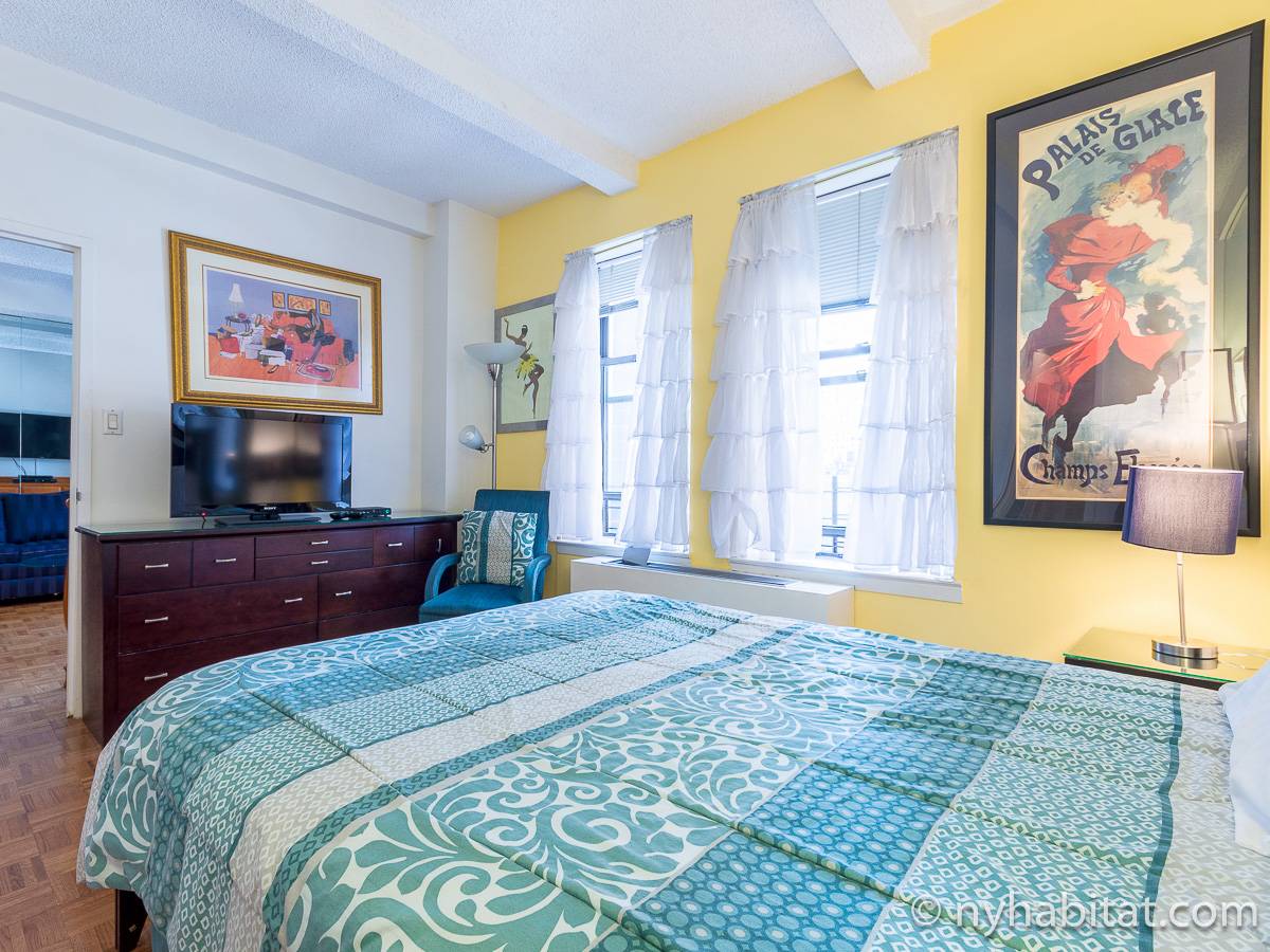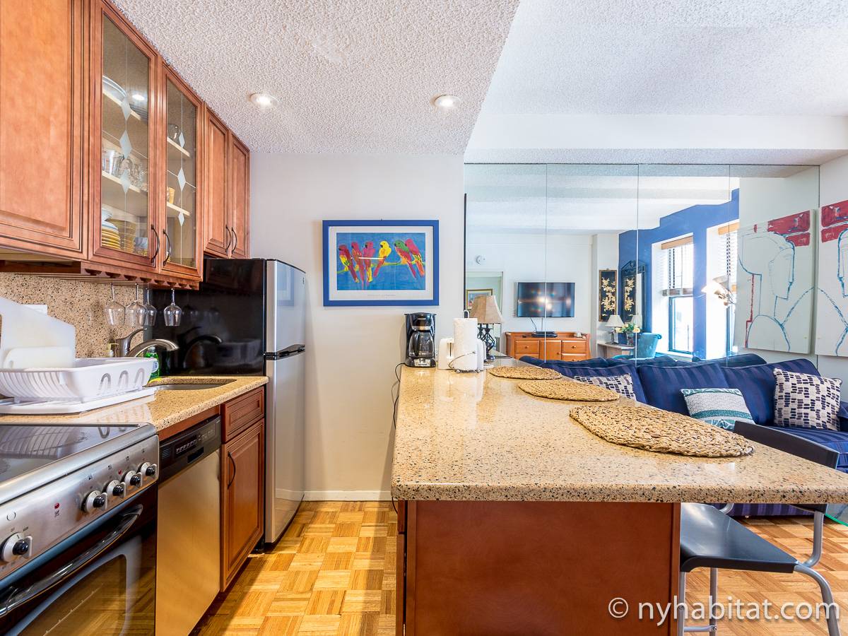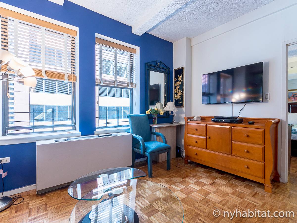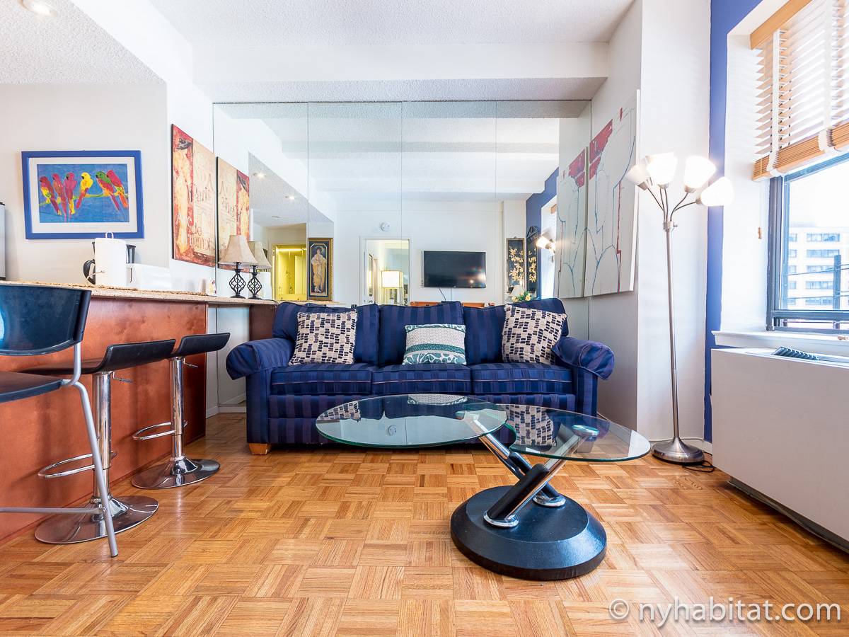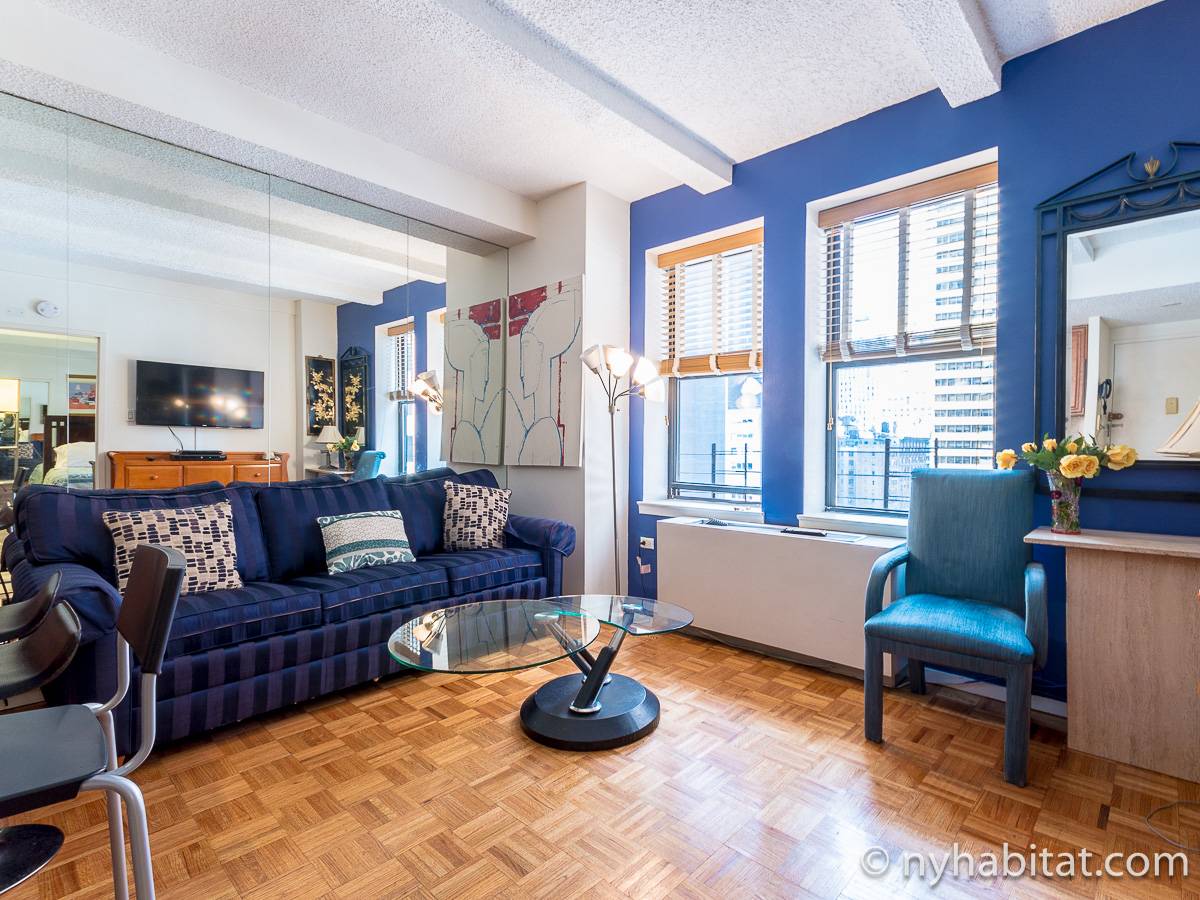 Welcome to this fully furnished one bedroom apartment New York City. You will find it in bustling Midtown West, in the heart of Manhattan, at the corner of 51st Street and 7th Avenue. It is located on the 15th floor of a high-rise building with elevator, doorman and concierge, laundry facilities, a gym and a rooftop terrace.