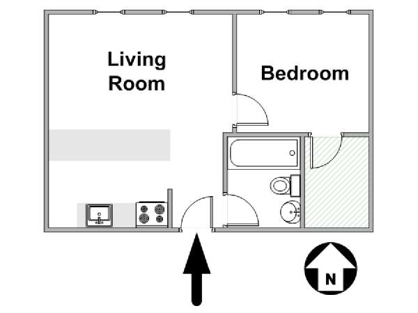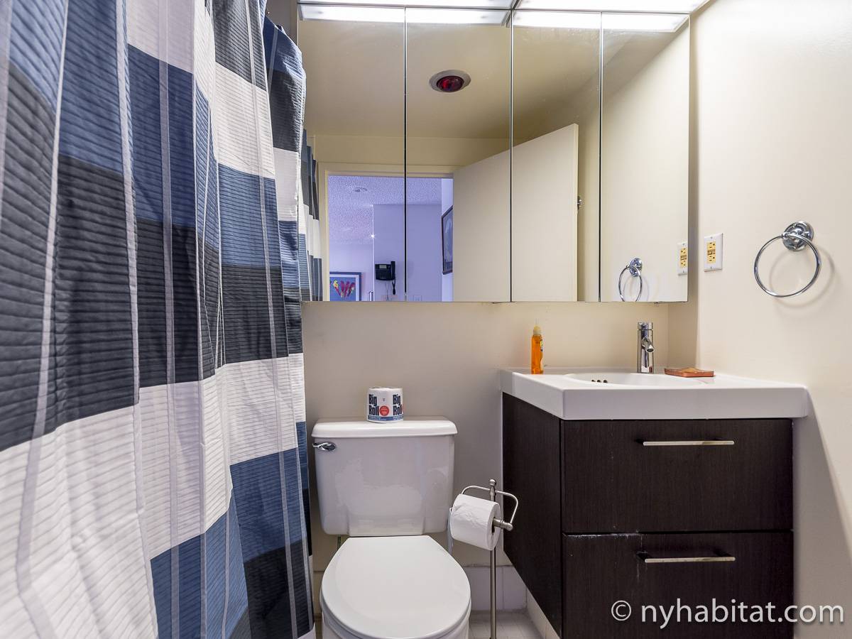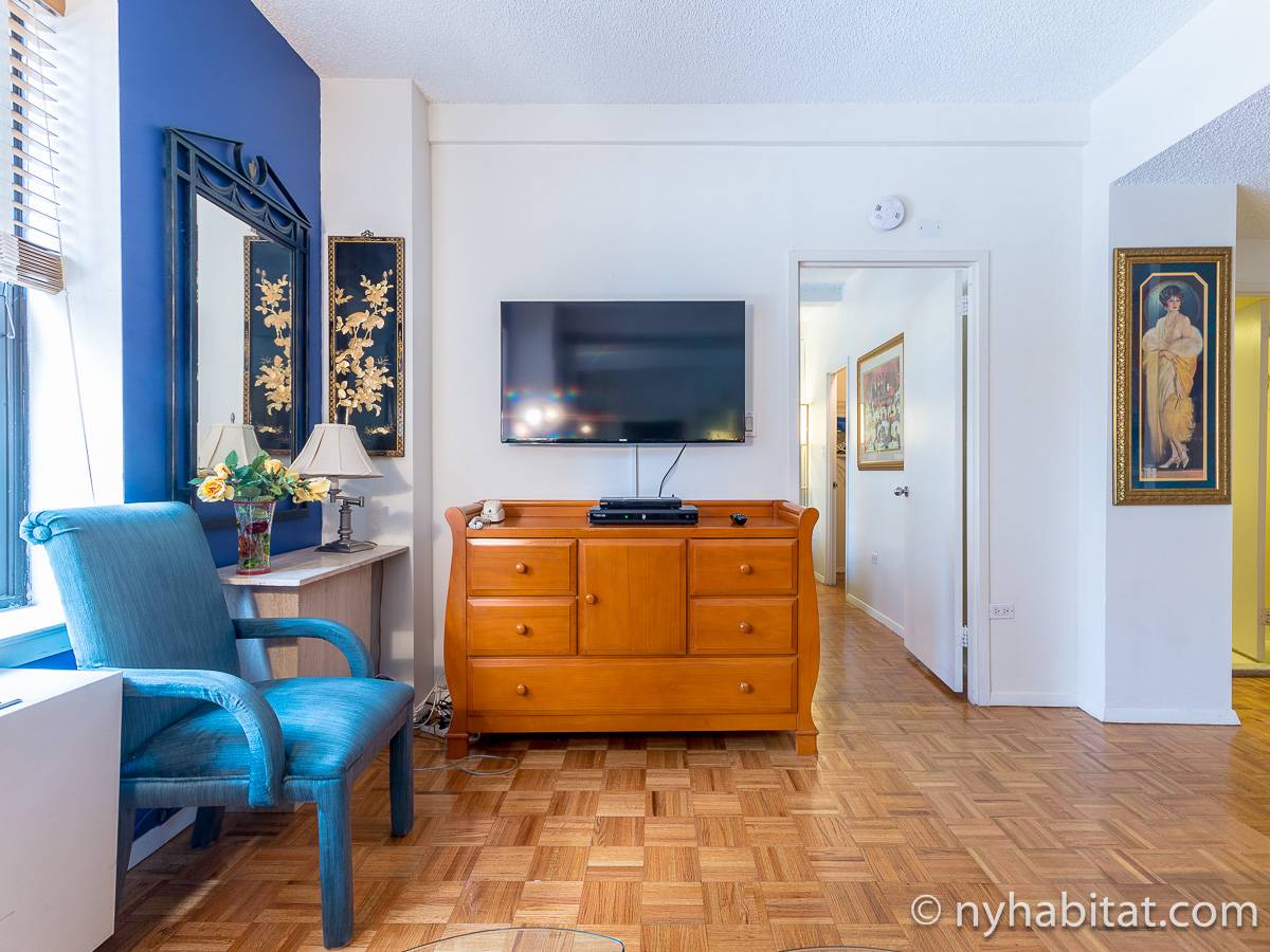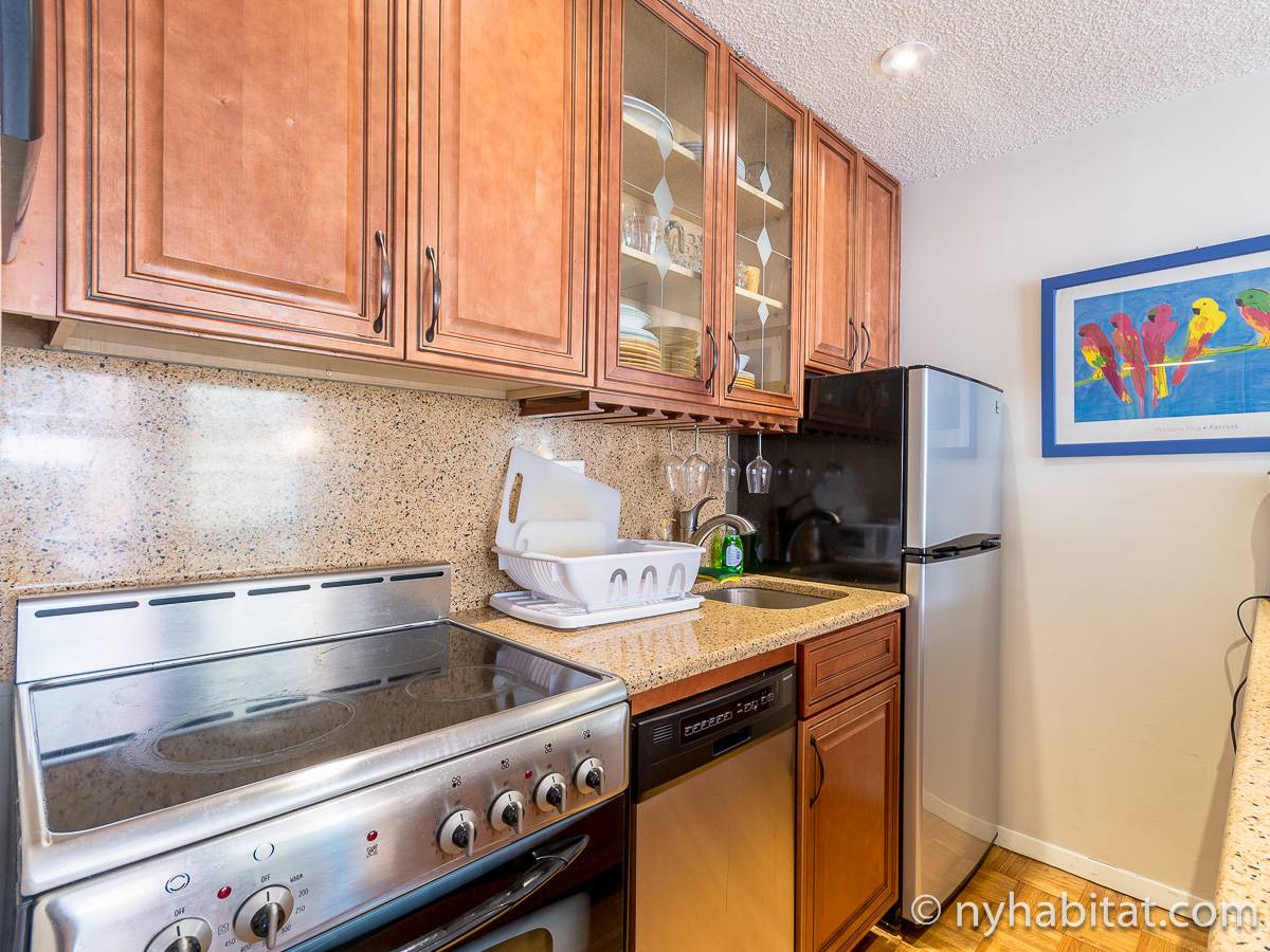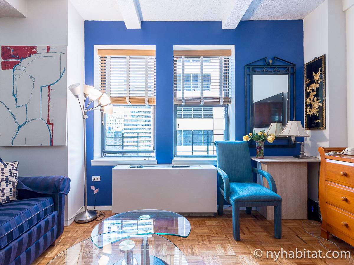 Welcome to this fully furnished one bedroom apartment New York City. You will find it in bustling Midtown West, in the heart of Manhattan, at the corner of 51st Street and 7th Avenue. It is located on the 15th floor of a high-rise building with elevator, doorman and concierge, laundry facilities, a gym and a rooftop terrace.