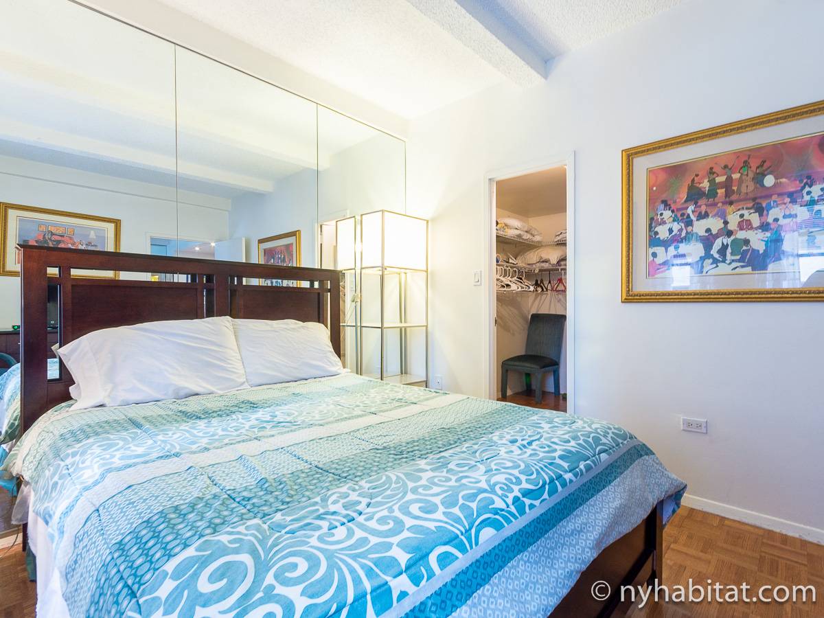As you enter this fully furnished apartment, you will find hardwood floors, contemporary design, sound proof windows and plenty of natural light. The living room features a sofa, a coffee table and a wall-mounted flat-screen television. A mirrored wall ads depth to the room and a blue accent wall adds a pop of color. The addition of sound proof windows keeps out the noise from the streets below. In the corner, an open-style kitchen offers stainless-steel appliances and features all the necessary cookware and dishware. You will find a double-sized bed in the bedroom as well as television and a walk-in closet for storage space. At the end of a long day, enjoy the many amenities offered in the building; head up to the roof for amazing views of the city skyline or take advantage of the on-site gym.