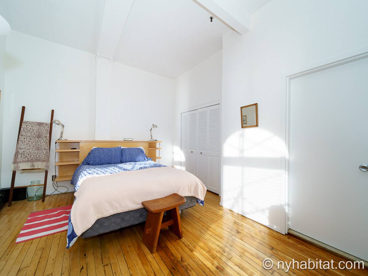 The bedroom spans approximately 180sqft (16.7sqm) and presents a vintage-inspired interior of hardwood floors and exposed beam ceilings painted white. Amenities include a queen bed and an ample closet space. Uniquely, it houses the full bathroom, ensuring privacy and convenience. Additionally, there is a half bathroom (toilet only, no shower) adjacent to the living room, perfect for guests or quick access.