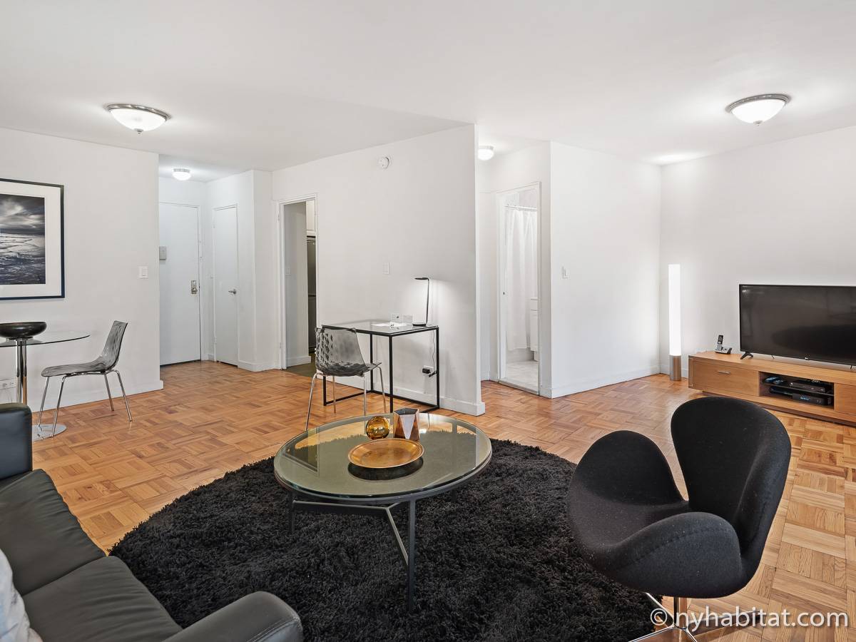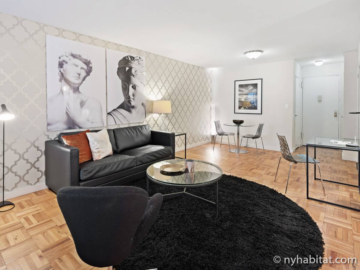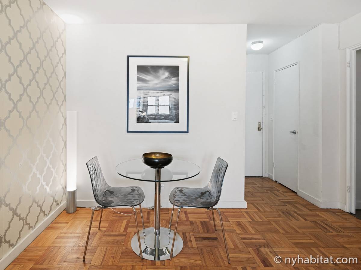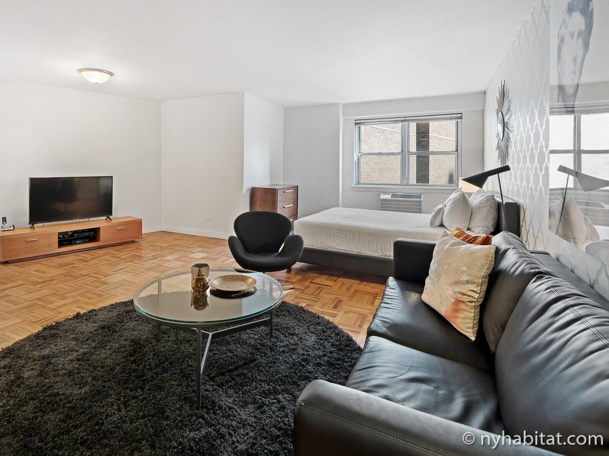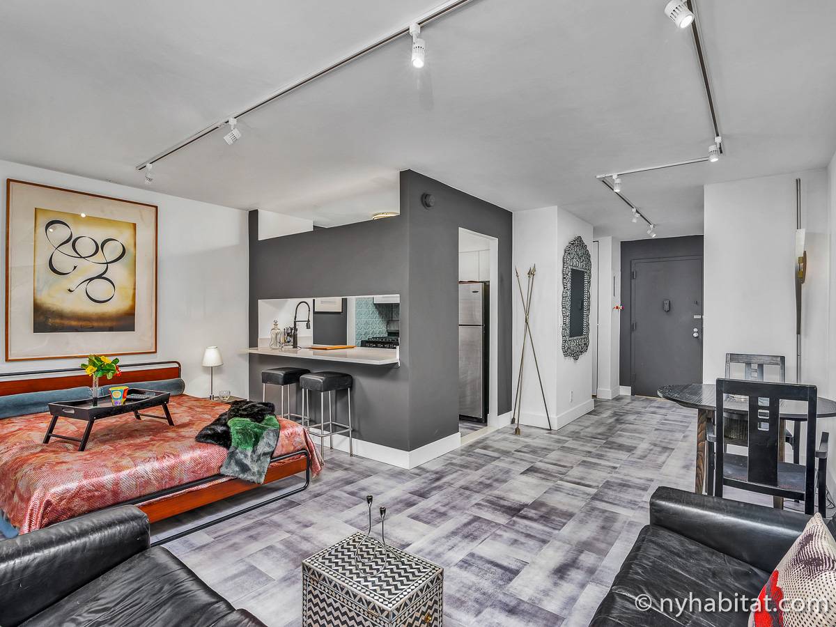 This NYC fully furnished apartment is furnished with contemporary décor and has hardwood floors throughout. The living room is furnished with a sofa, dining table that seats four people and a TV with cable. Within the living area is an alcove where you’ll find the full size bed. The kitchen is fully equipped with all the necessities for cooking, including a microwave, toaster and coffee maker. The bathroom features a bathtub, WC and a sink.