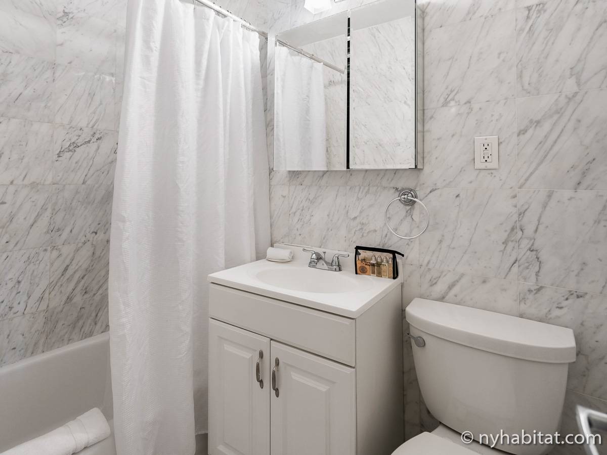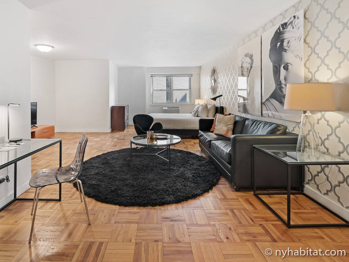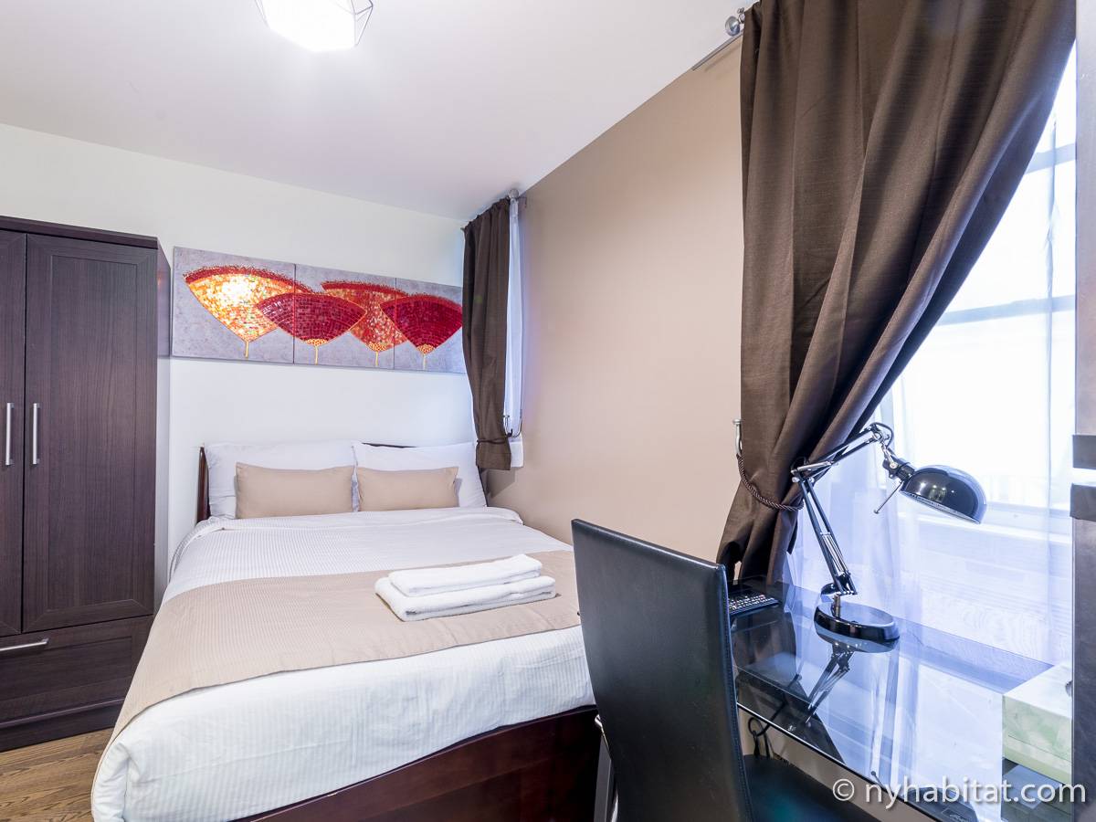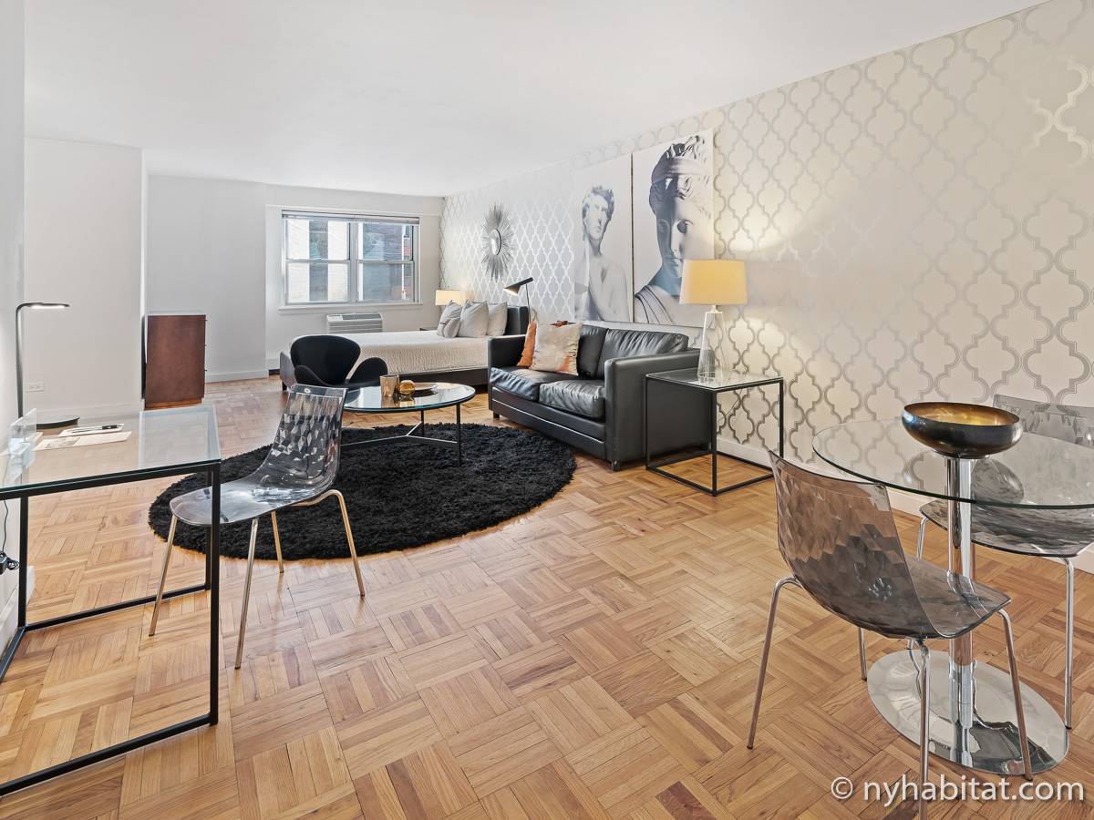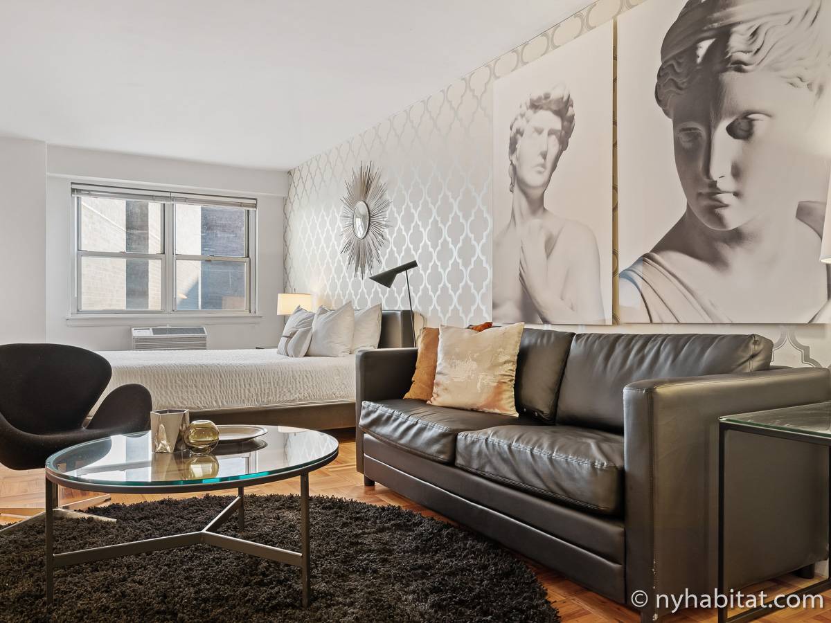 This NYC fully furnished apartment is furnished with contemporary décor and has hardwood floors throughout. The living room is furnished with a sofa, dining table that seats four people and a TV with cable. Within the living area is an alcove where you’ll find the full size bed. The kitchen is fully equipped with all the necessities for cooking, including a microwave, toaster and coffee maker. The bathroom features a bathtub, WC and a sink.