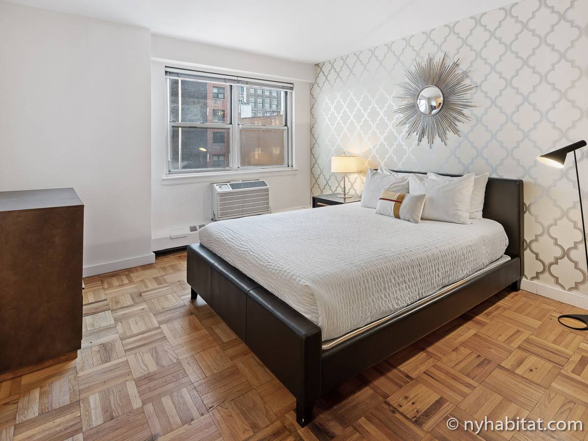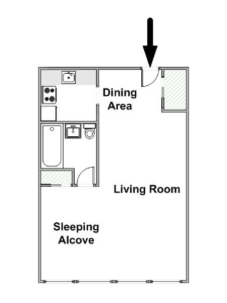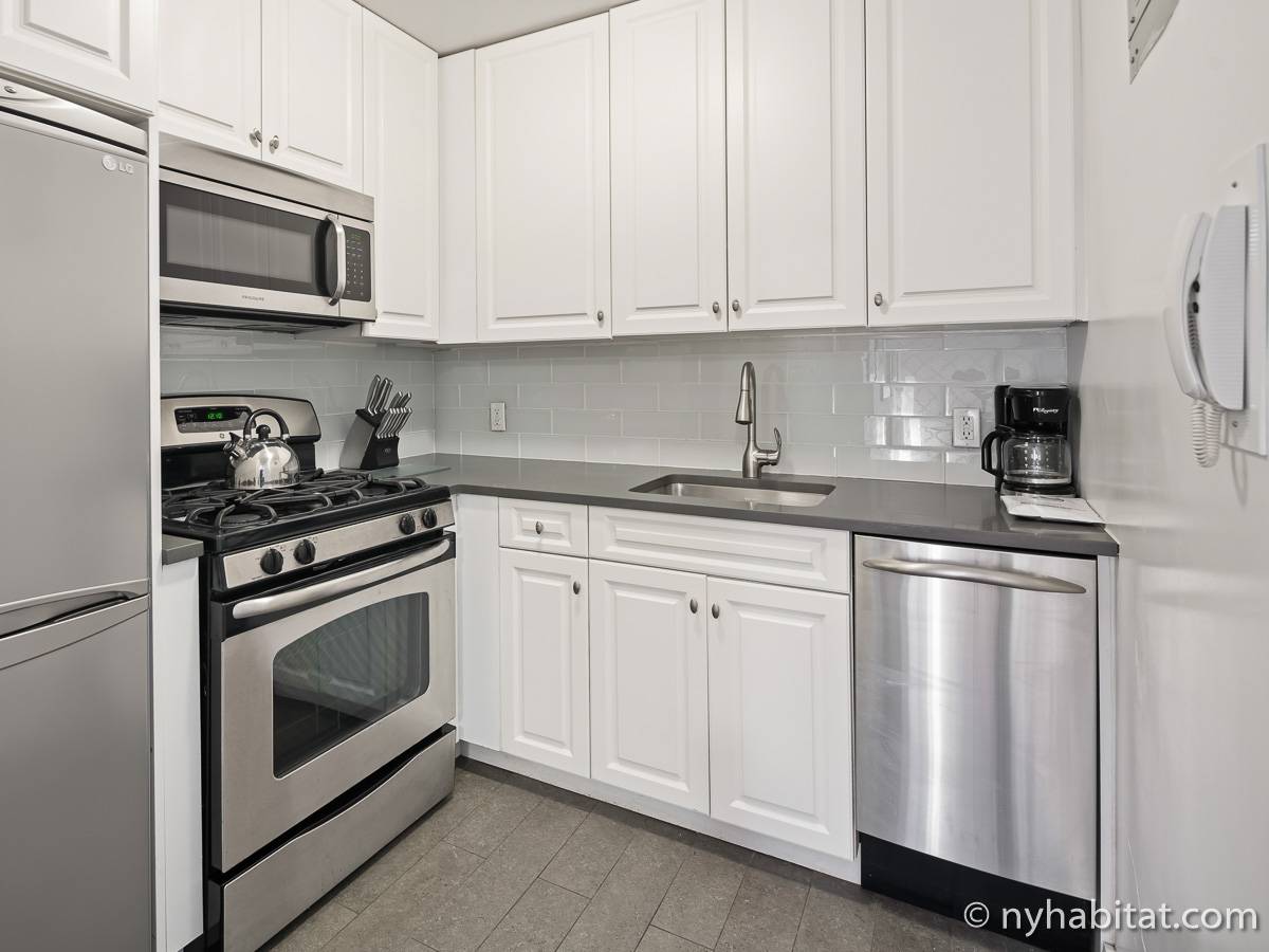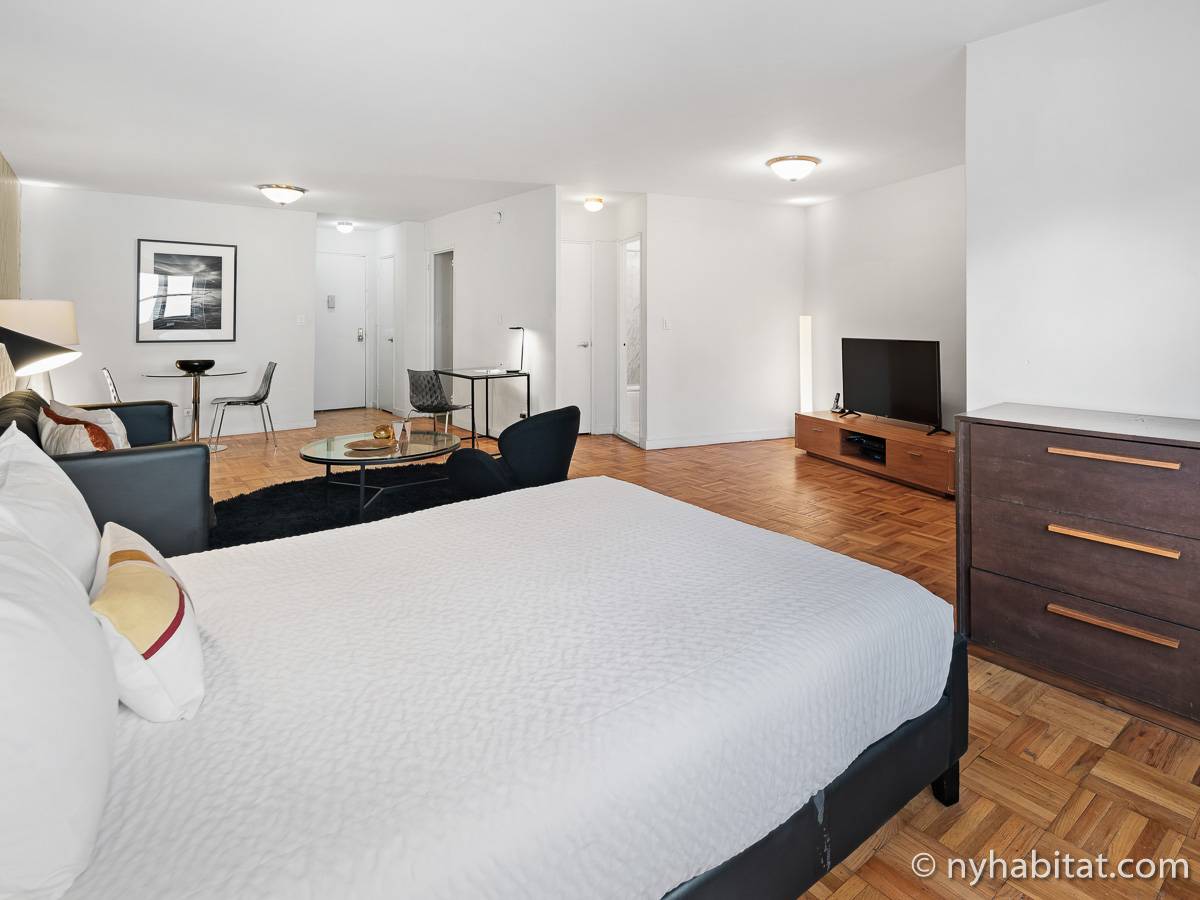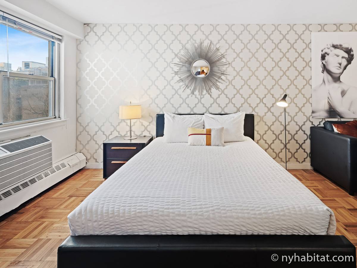 This NYC fully furnished apartment is furnished with contemporary décor and has hardwood floors throughout. The living room is furnished with a sofa, dining table that seats four people and a TV with cable. Within the living area is an alcove where you’ll find the full size bed. The kitchen is fully equipped with all the necessities for cooking, including a microwave, toaster and coffee maker. The bathroom features a bathtub, WC and a sink.