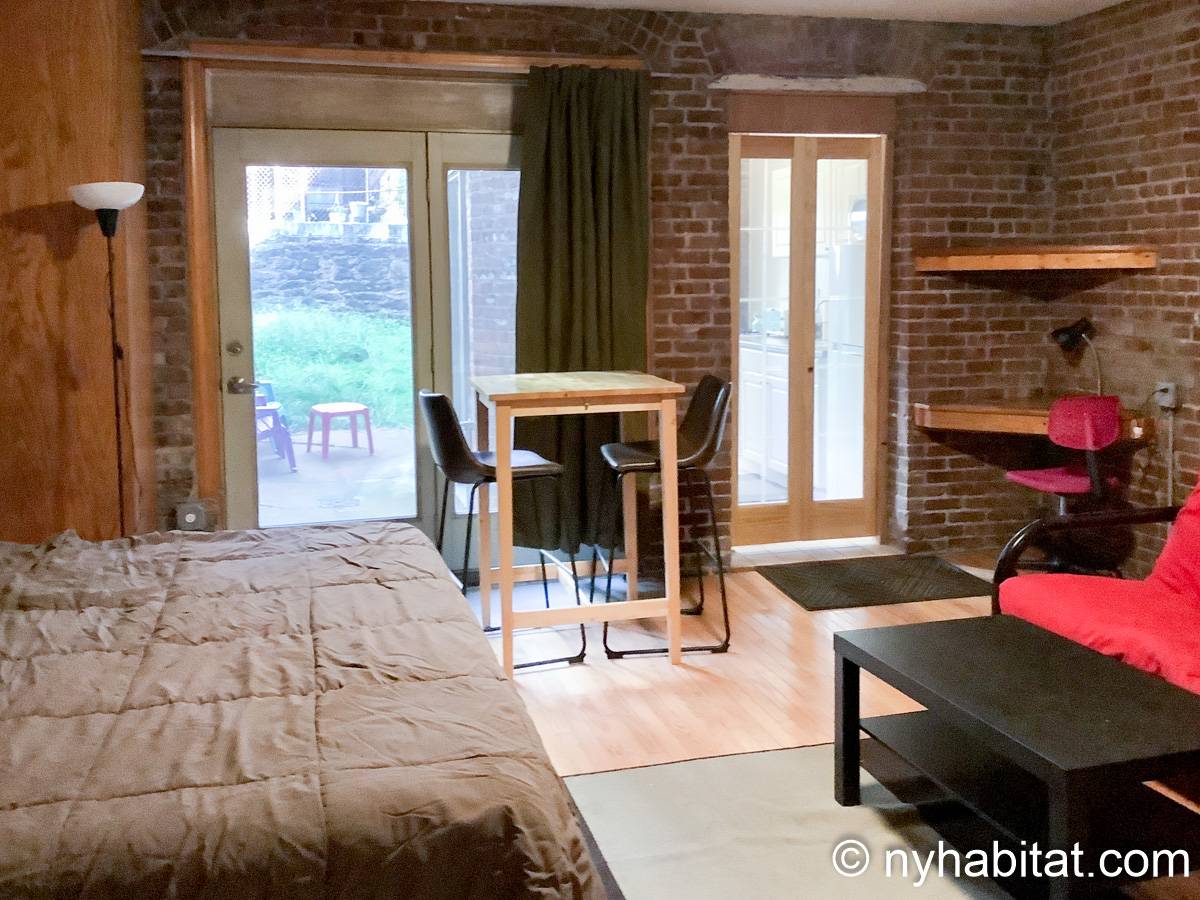 As you enter the apartment's living area, you'll be struck by the excellent views of some of New York's most prominent landmarks. The Empire State Building, Coogan's Bluff, Yankee Stadium and the neighboring Morris Jumel Mansion are all sometimes visible from late autumn through late spring out of the three windows in the living room. Here you will also find a twin bed and television, as well as a dining room table and chairs. In the open kitchen there is a selection of modern appliances for cooking at home and a small refrigerator for keeping fresh food.