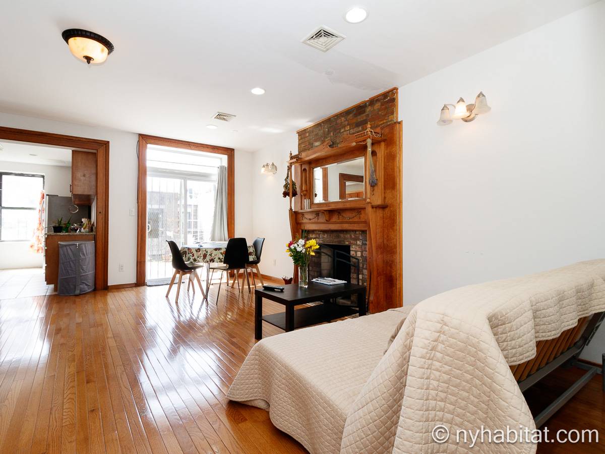 On the 3rd floor of the apartment you will find the master bedroom of the apartment (bedroom 1). The room has hardwood floors and 3 windows with a northern exposure of green backyards. The room contains a queen-sized bed, TV with cable, a cabinet, 2 closets and a folding screen for privacy. An open winding staircase leads to the 4th floor and comes out in the other bedroom of the apartment (bedroom 2). Please note that in order to access the bathroom, kitchen and living room of the apartment, occupants of bedroom 2 will have to either go through bedroom 1 or exit the apartment and enter through the front door on the 4th floor. Bedroom 2 also has hardwood floors and three widows with a view of the gardens below, and features striking red walls and a skylight to let in additional light. The room is furnished as a study/entertainment room with a bookcase, double-size convertible futon and flat-screen TV with cable. There are also 2 closets in the room for additional storage space. A hallway leads to the other rooms on the 4th floor. The bathroom is just off the hallway, and contains a Jacuzzi bathtub with modern showerhead. The living room of the apartment can also be found on this floor. The room features hardwood floors, a decorative fireplace and two windows with a southern exposure of the typical New York tree-lined street below. The southern exposure coupled with another skylight and white elements throughout the room make this a delightful sun-filled space. There is a winding staircase in this room that leads to the inaccessible roof (locked). Furthermore, the room contains a large modern sofa which can be used as two single beds and a round dining table that seats four. The dining table stands conveniently close to the open kitchen, perfect for meals at home.