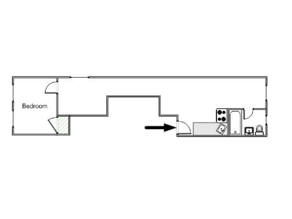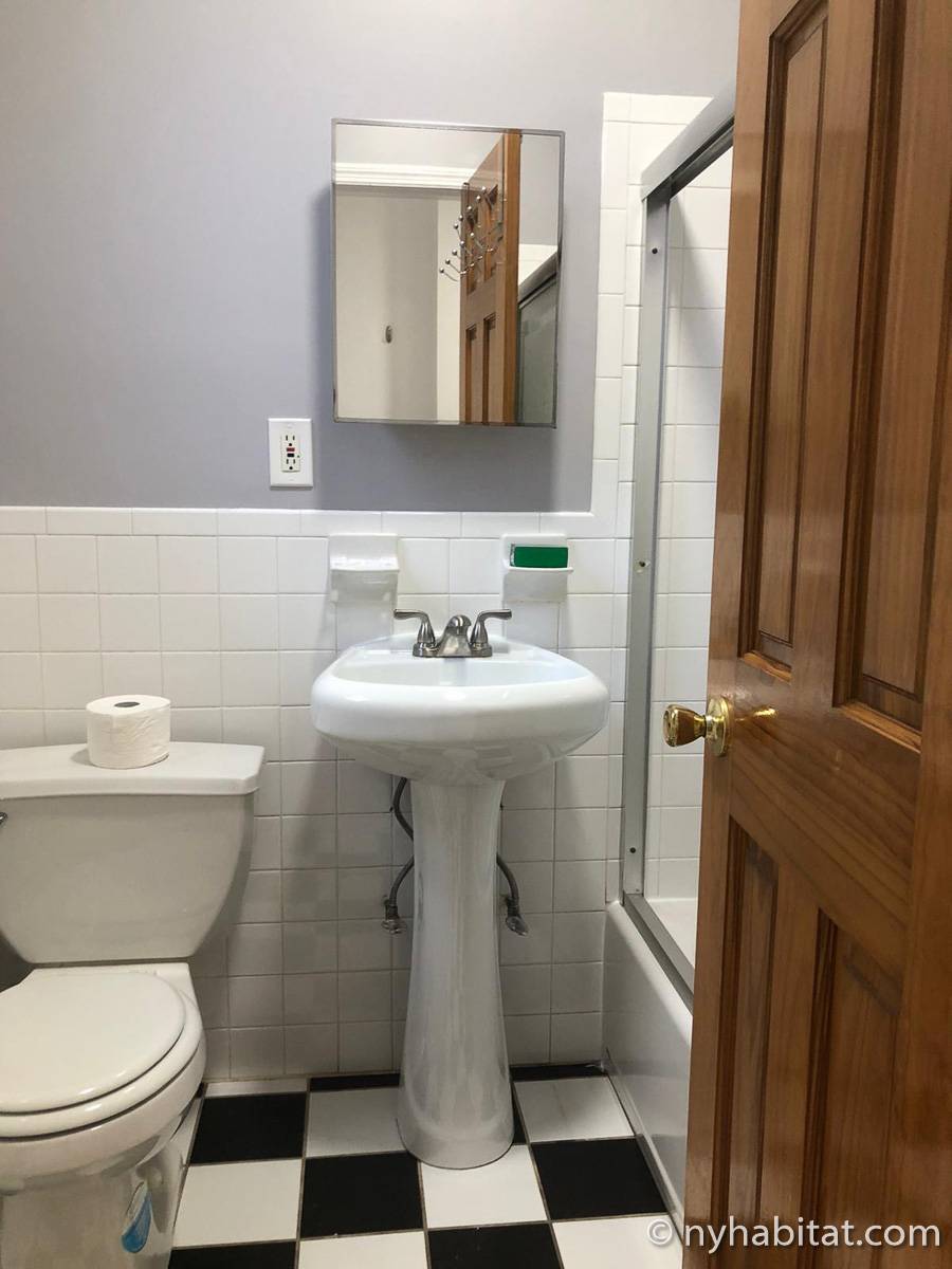 The bedroom is furnished with a double sized bed, a TV and a dresser to store you belongings. It has 2 larges windows allowing plenty of light in and looking onto the street. The bathroom has a bathtub, a sink and a mirror.