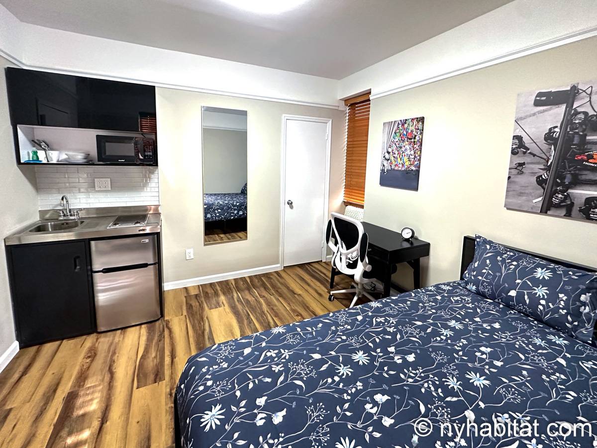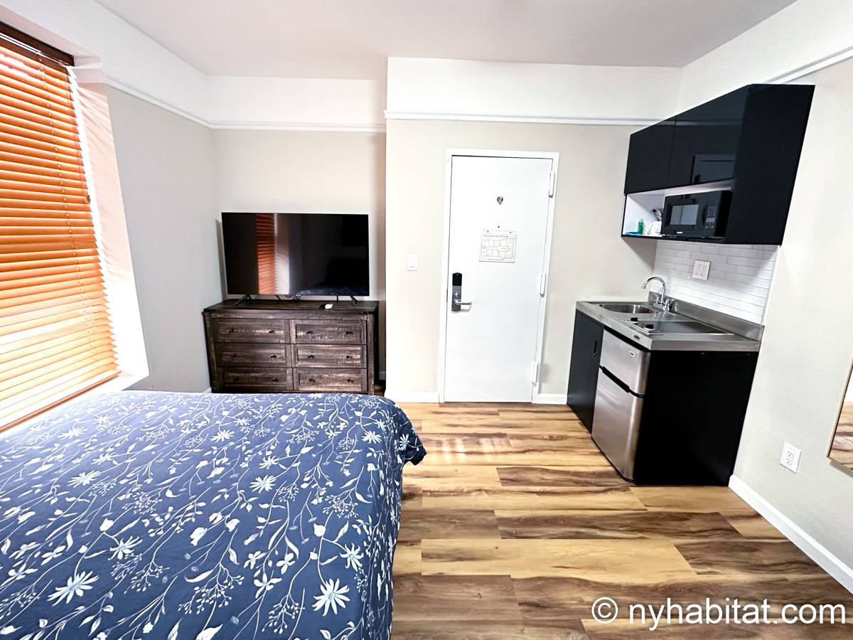 The studio rental is situated at 14th Street and Third Avenue in the Union Square – Gramercy area of New York City. The low-rise building is a 5-floor walk-up (no elevator), with a number of similar hotel-like units housed within it. The apartments have basic standardized furnishings and amenities: a double bed, an air-conditioning unit, a TV with basic cable and Wi-Fi internet access.