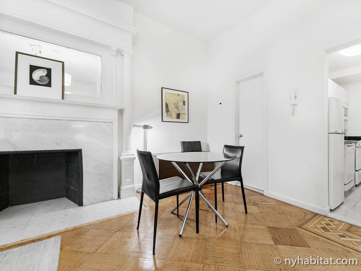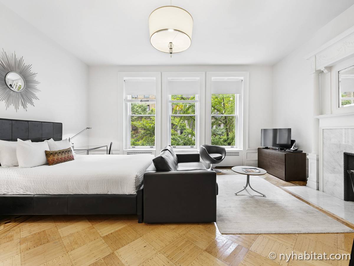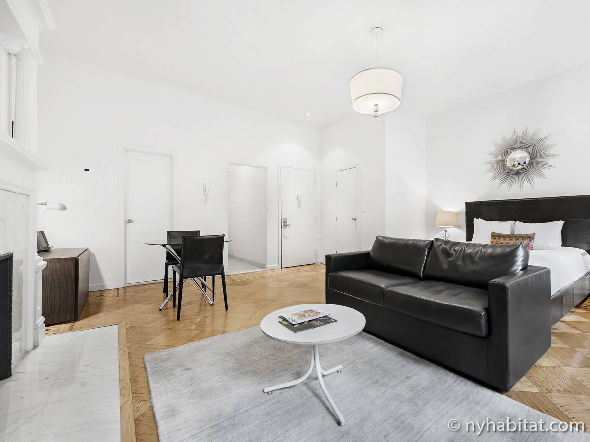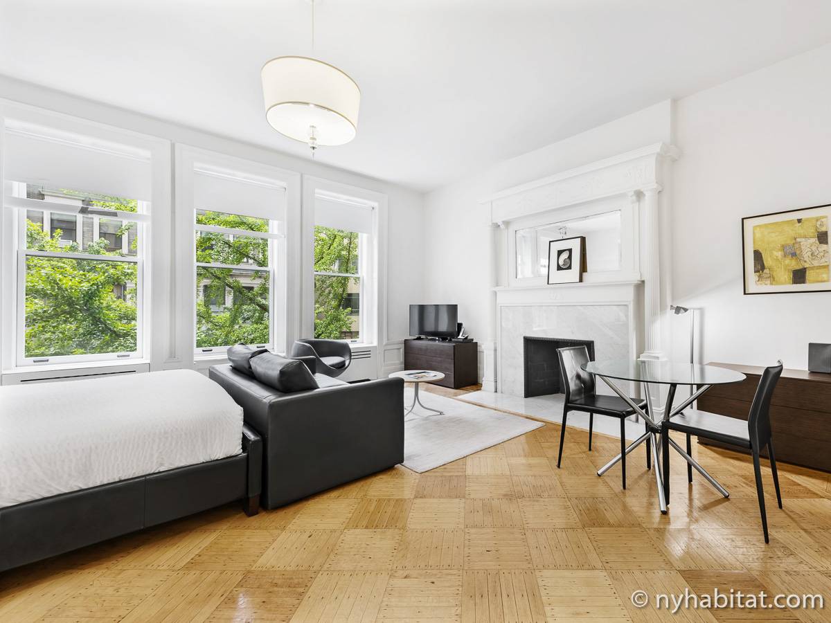 This fully furnished studio apartment is located on the Upper West Side of Manhattan, New York. The apartment is in a turn of the century 5 story townhouse with a buzzer/intercom system for guest entry.