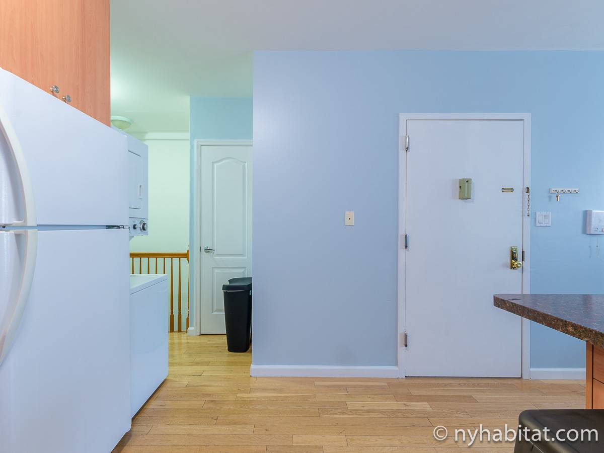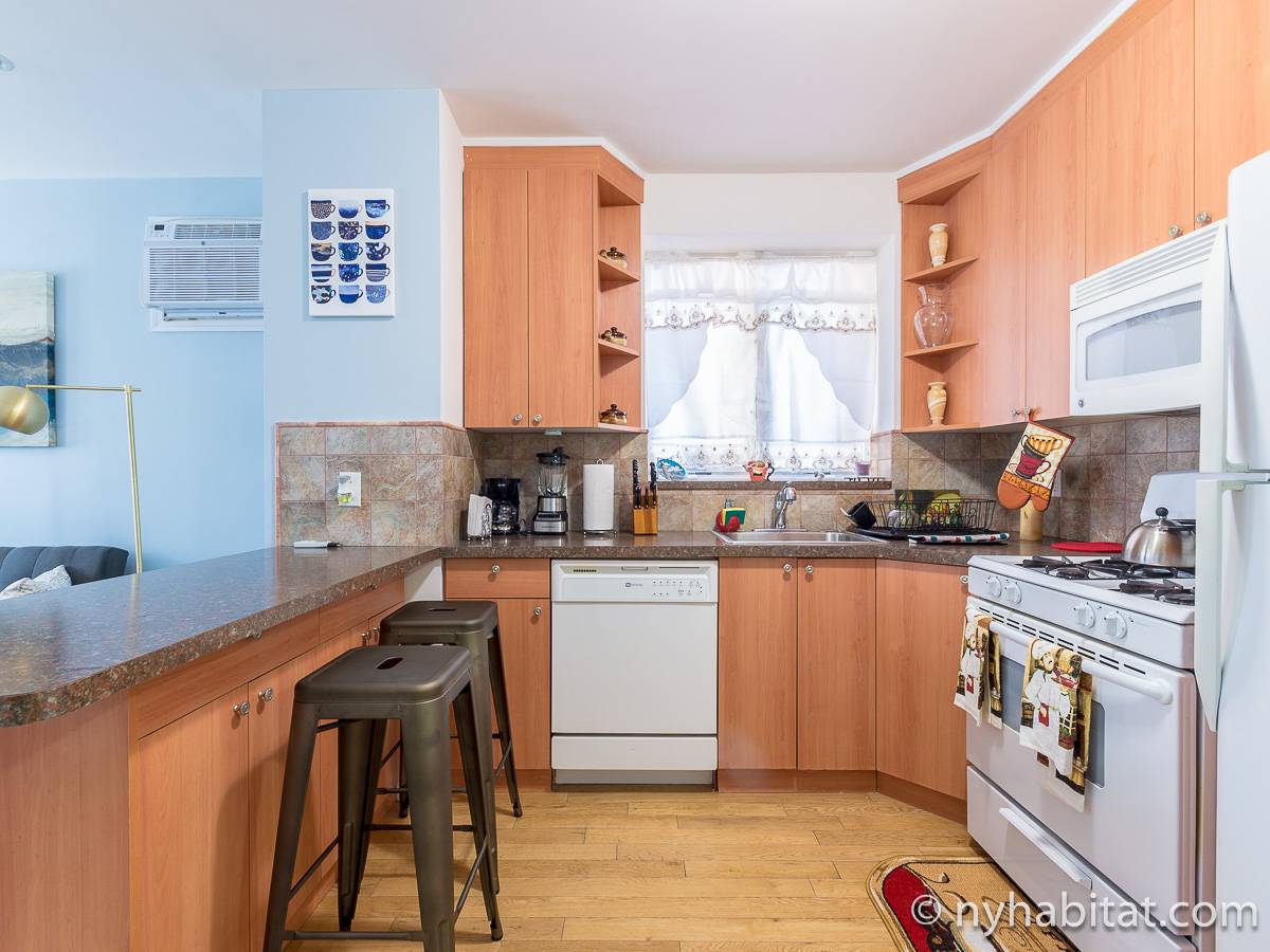 On the southwestern point of Brooklyn, New York, you will find this agreeable and fully furnished two-bedroom apartment in the neighborhood of Bay Ridge. Located on the first floor of a 3-floor low-rise building, built as recently as 2006, this apartment stands out from those surrounding it due to its modern features. Among them, you have the convenience of a buzzer/intercom system and a combination washer/dryer.