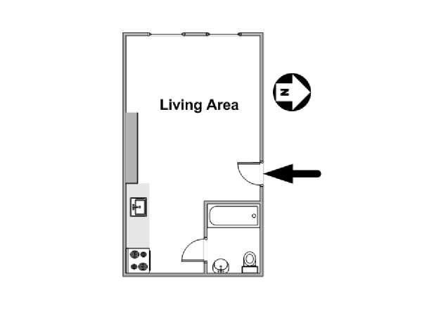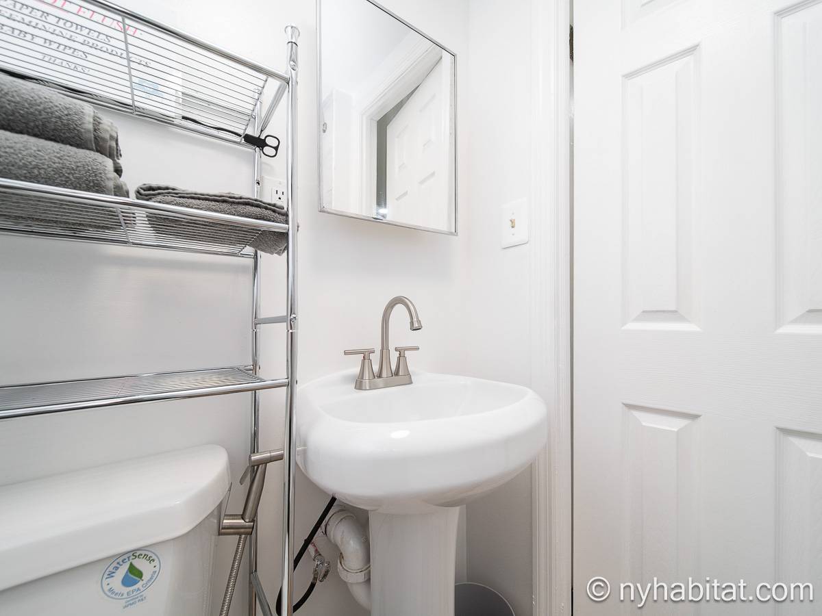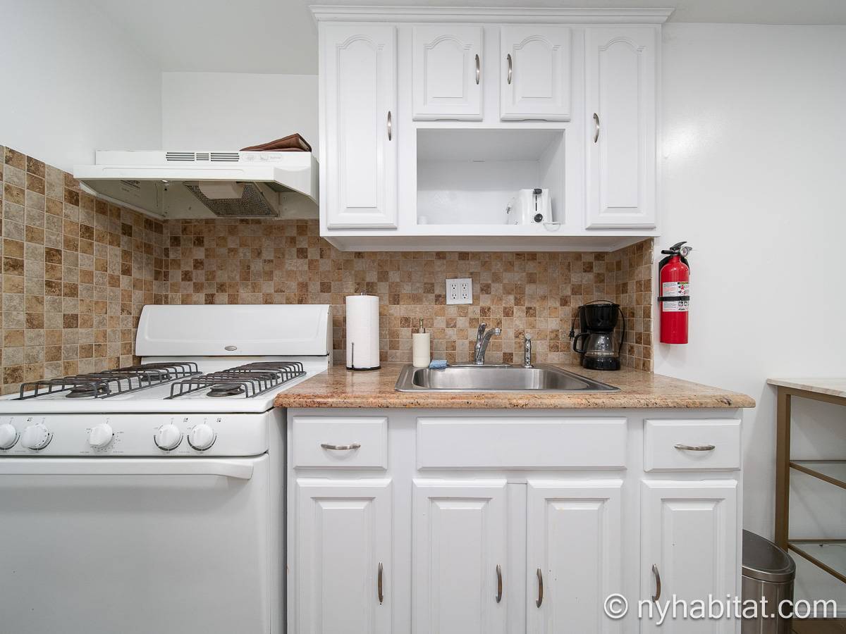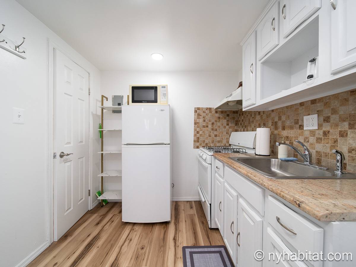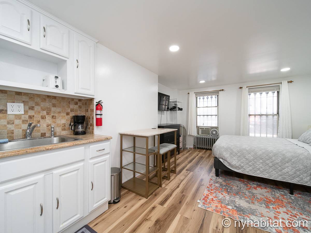 This studio apartment has blond hardwood floors and white walls to enhance the sense of space. Painted tin ceilings add some original New York charm to the room. You also have a double doored cabinet in the corner for storing extra belongings. There are double windows available in this area to pour in the morning sunshine and provide you with plenty of fresh air. An air conditioning unit will be provided in the warmer months.