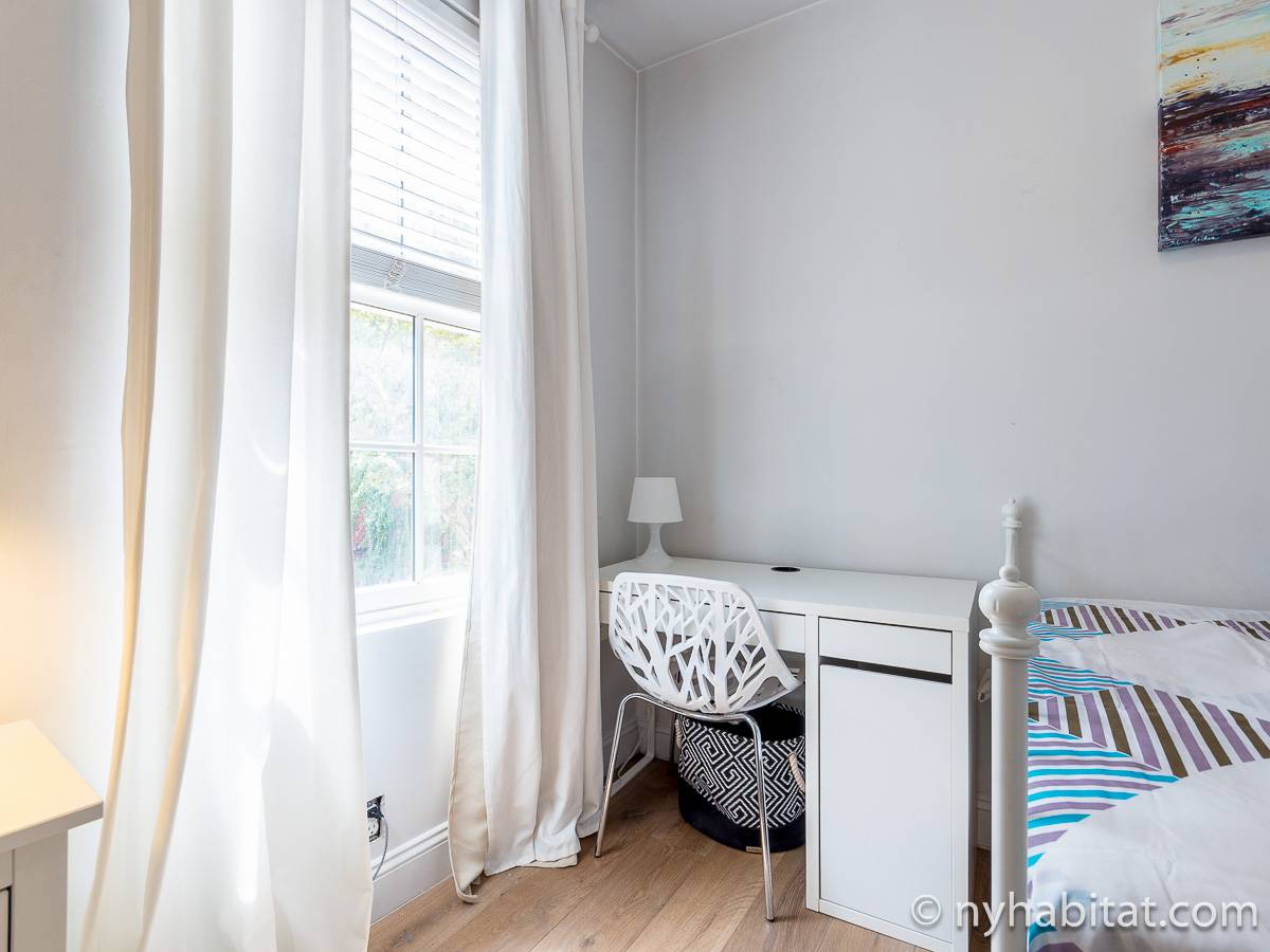 The white walls mixed with the white furniture in the bedroom give the room a very bright and clean look. There is also a desk with a desk lamp for when you have to write, read or just simply do some work.