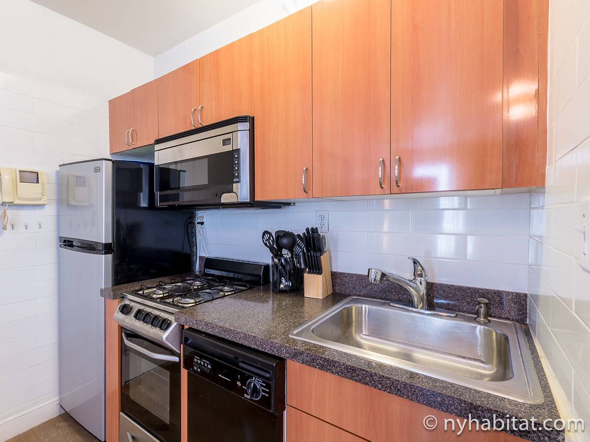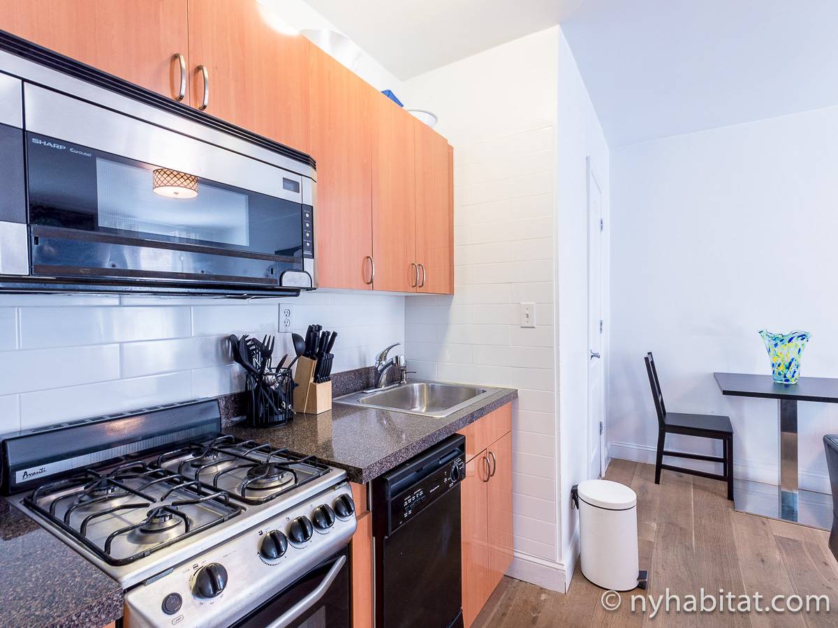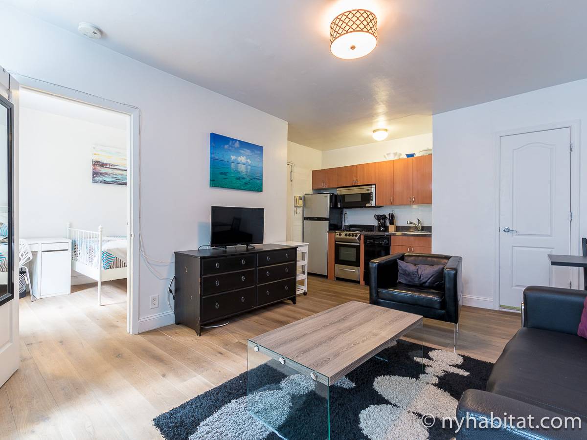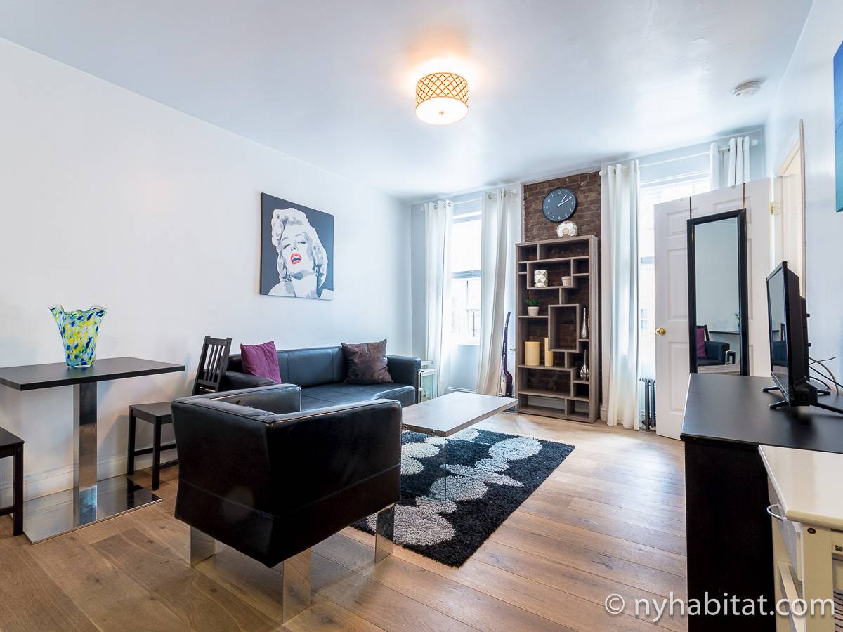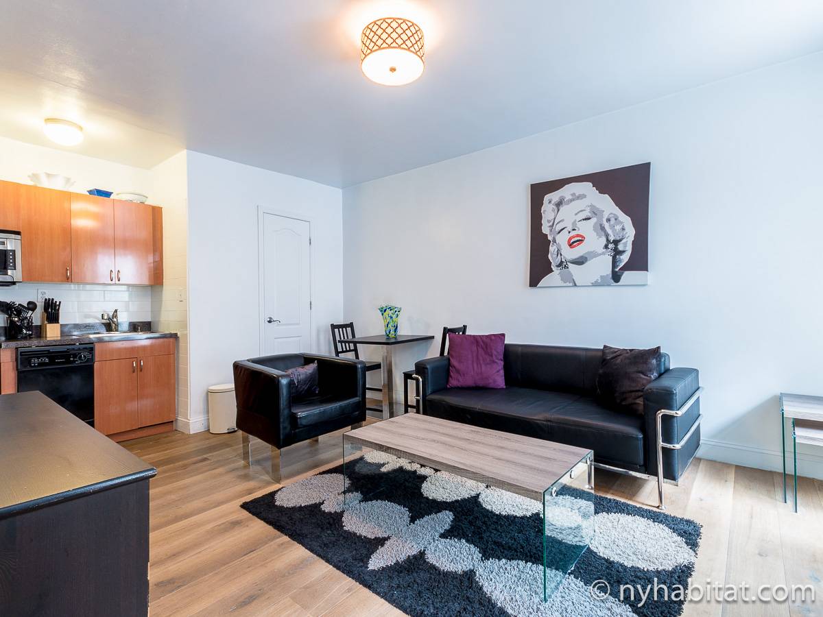 The hardwood floors mixed with the all black furniture in the living room leaves for a contemporary yet refreshing look. In here you can enjoy the flat screen cable television while getting the real New York City feel from the two slivers of exposed brick walls. Enjoy the kitchen's amenities including a dining table for two, a coffeemaker and toaster!