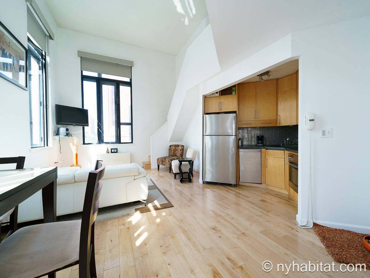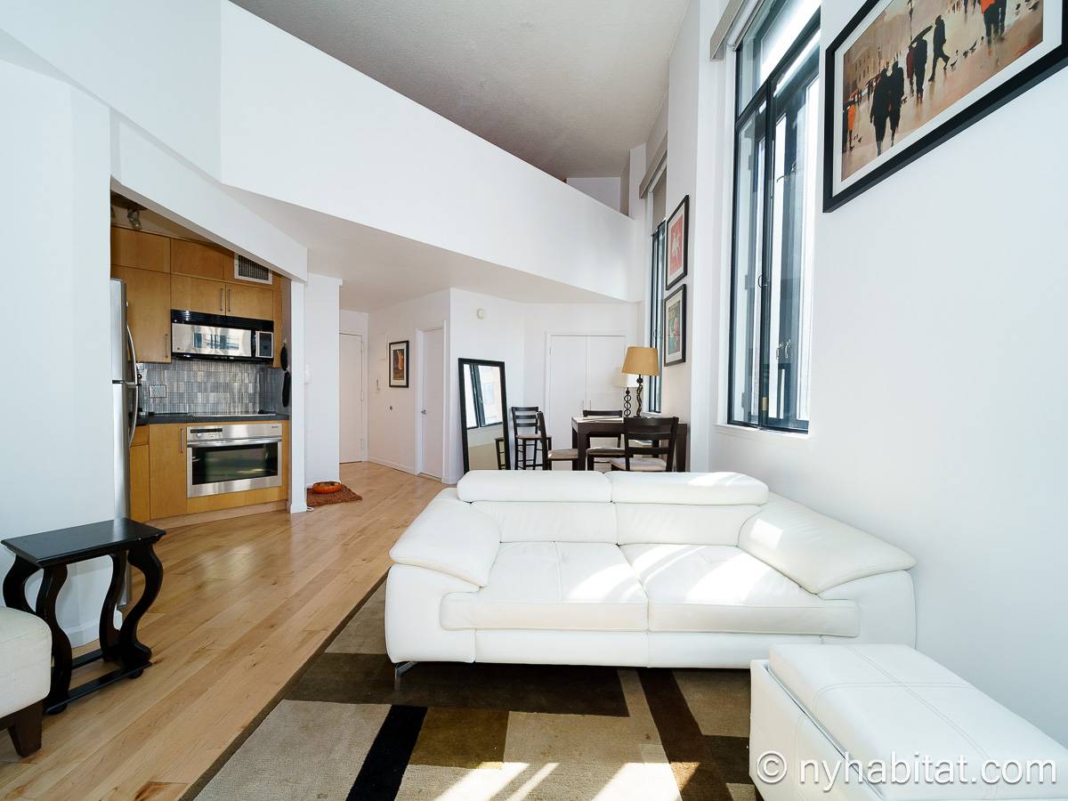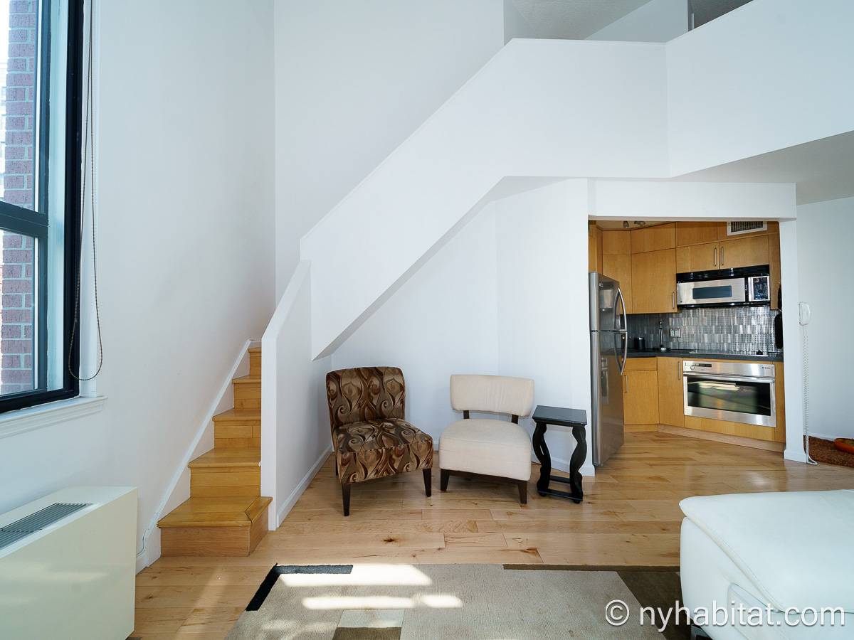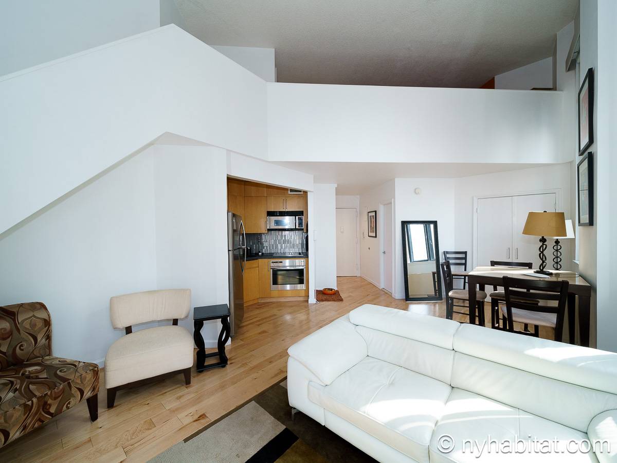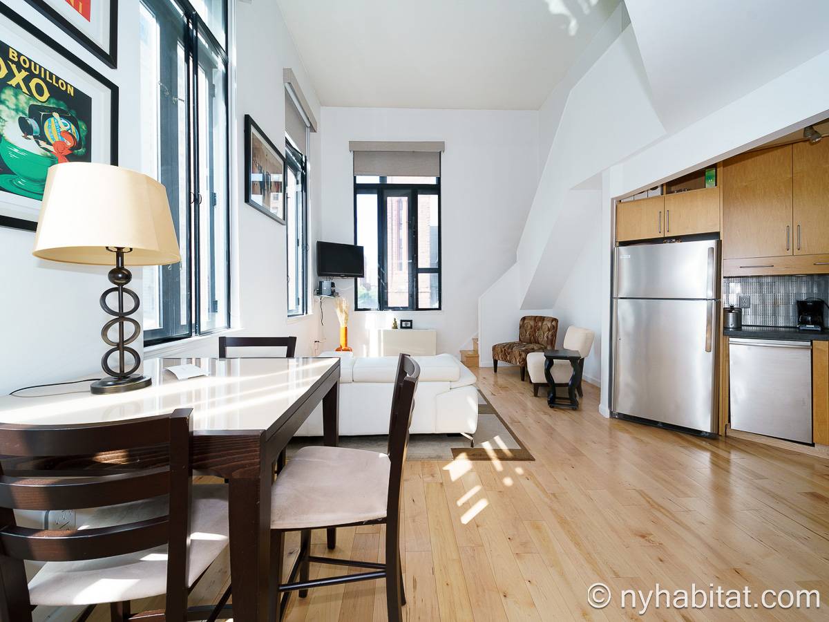 With a hyper-modern décor befitting its ritzy Manhattan location, the fully furnished apartment has hardwood bamboo floors throughout. In the main room, a sofa and armchairs form a sitting area by the cable TV. A closet is available for extra storage space on the main floor. Also available is Verizon Fios high speed internet. A dining table provides space to enjoy meals from your fully equipped modern kitchen, open to the rest of the space. Up a set of stairs past the oversize double paned windows, the sleeping alcove accommodates a queen bed and offers two closets and a dresser for lots of storage. Please note that the ceiling in the alcove is 5.8 ft high (176 cm).