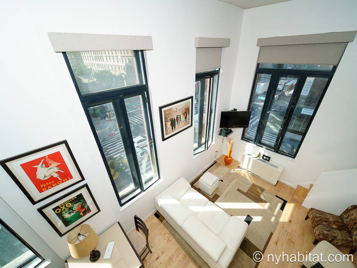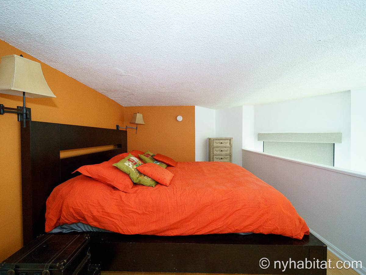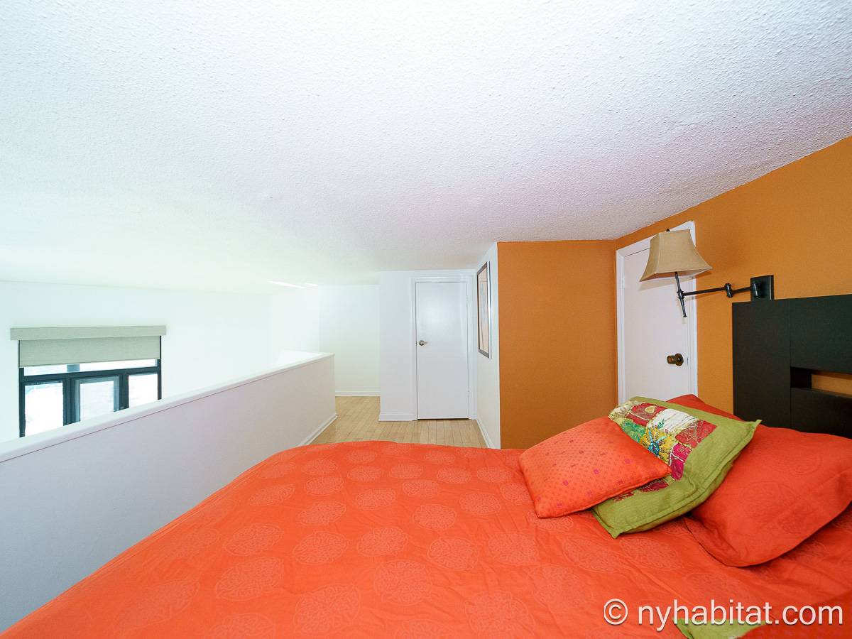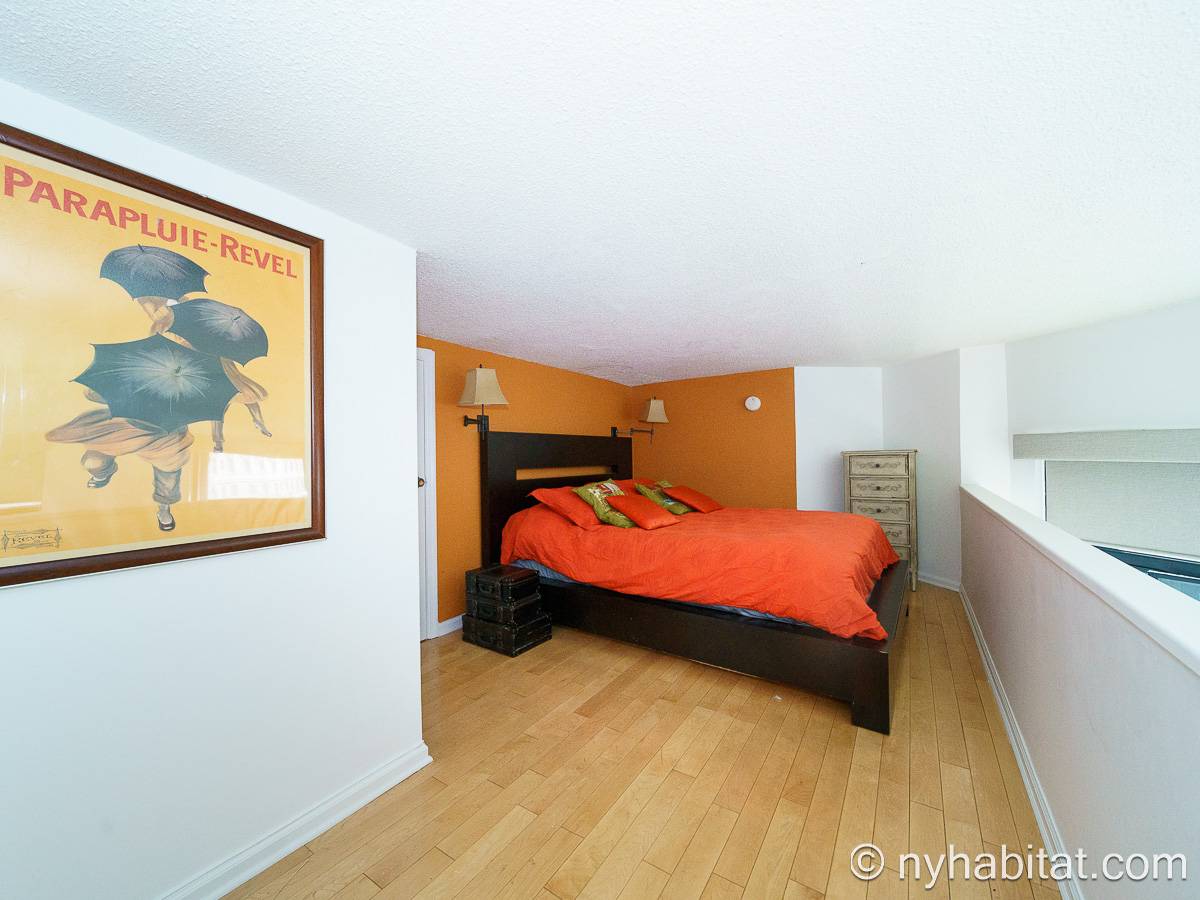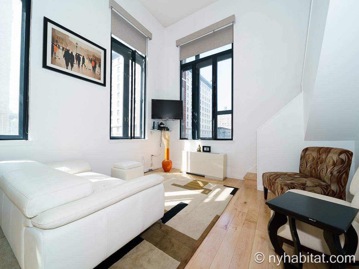 With a hyper-modern décor befitting its ritzy Manhattan location, the fully furnished apartment has hardwood bamboo floors throughout. In the main room, a sofa and armchairs form a sitting area by the cable TV. A closet is available for extra storage space on the main floor. Also available is Verizon Fios high speed internet. A dining table provides space to enjoy meals from your fully equipped modern kitchen, open to the rest of the space. Up a set of stairs past the oversize double paned windows, the sleeping alcove accommodates a queen bed and offers two closets and a dresser for lots of storage. Please note that the ceiling in the alcove is 5.8 ft high (176 cm).