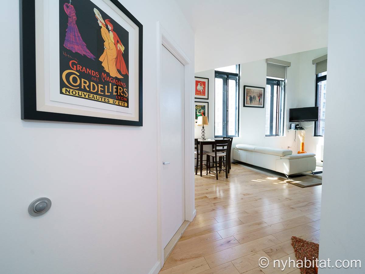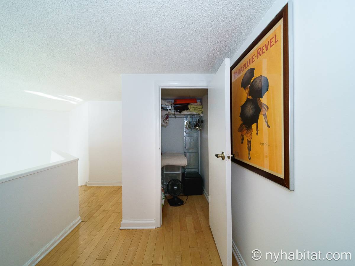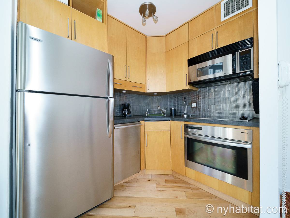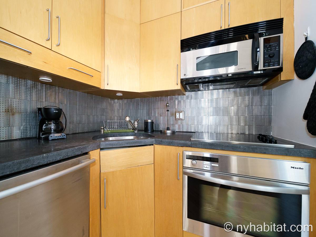 With a hyper-modern décor befitting its ritzy Manhattan location, the fully furnished apartment has hardwood bamboo floors throughout. In the main room, a sofa and armchairs form a sitting area by the cable TV. A closet is available for extra storage space on the main floor. Also available is Verizon Fios high speed internet. A dining table provides space to enjoy meals from your fully equipped modern kitchen, open to the rest of the space. Up a set of stairs past the oversize double paned windows, the sleeping alcove accommodates a queen bed and offers two closets and a dresser for lots of storage. Please note that the ceiling in the alcove is 5.8 ft high (176 cm).