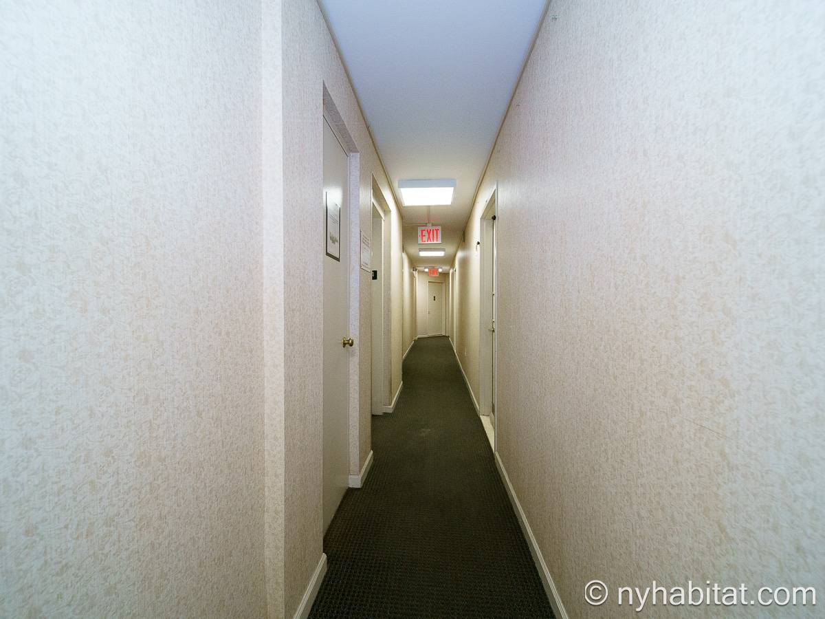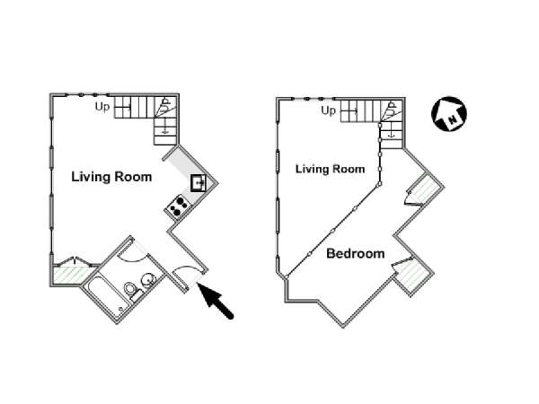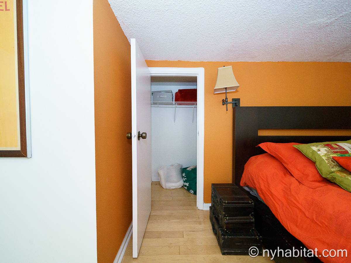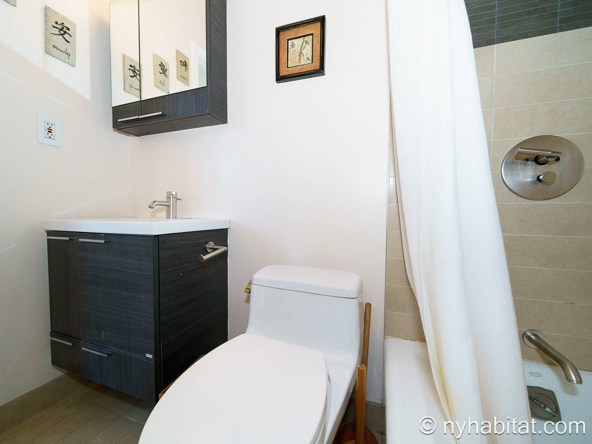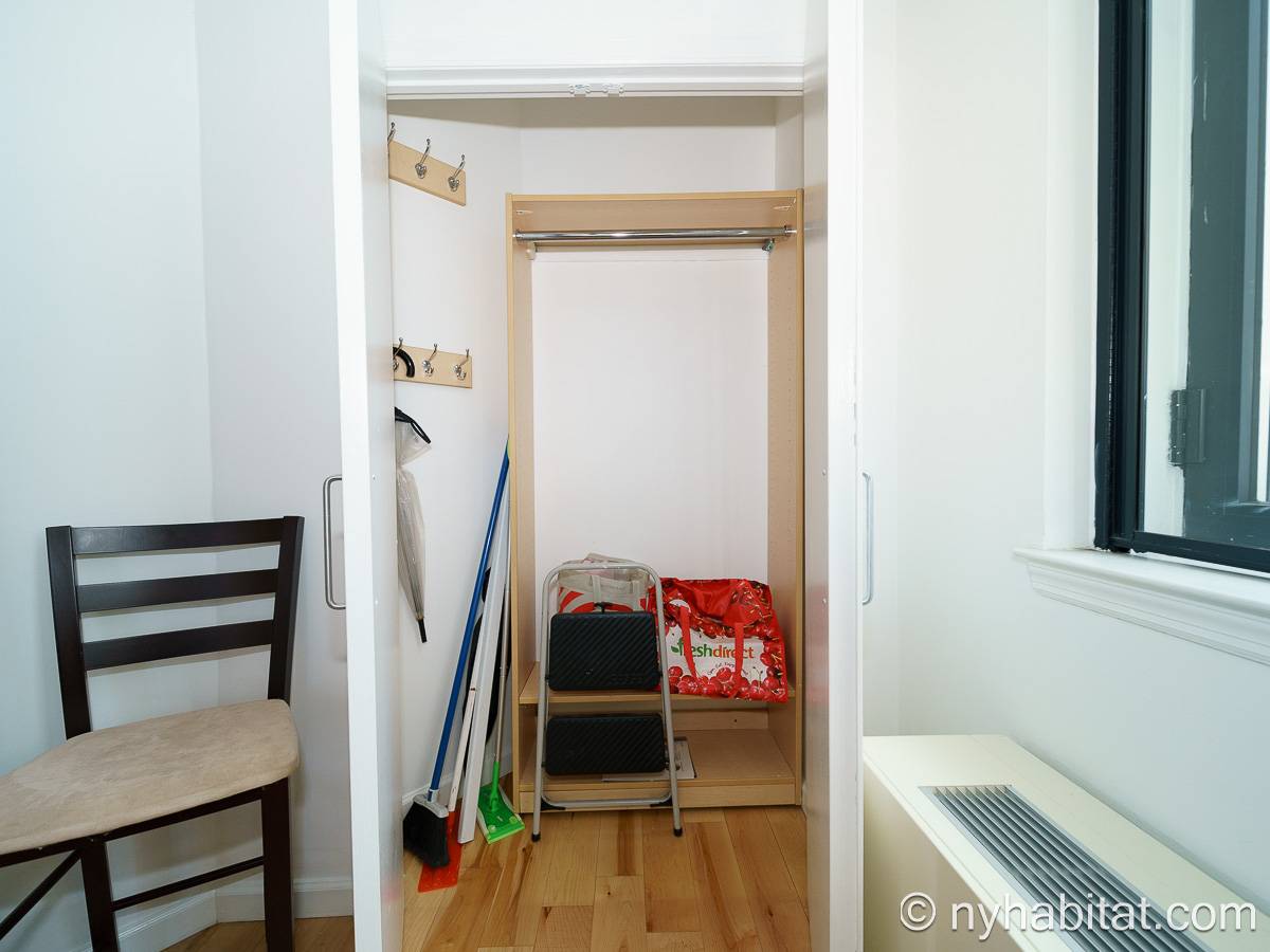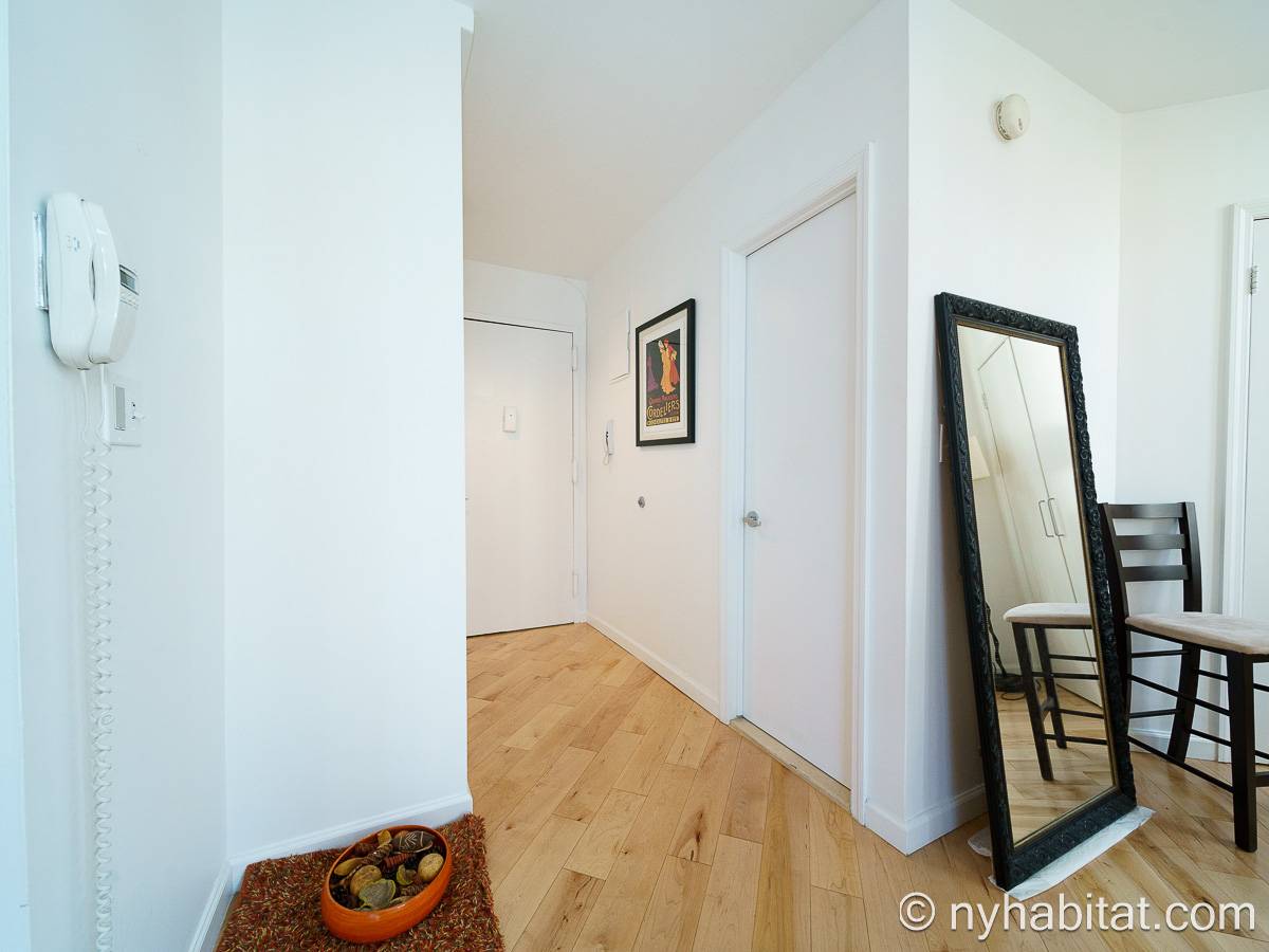 With a hyper-modern décor befitting its ritzy Manhattan location, the fully furnished apartment has hardwood bamboo floors throughout. In the main room, a sofa and armchairs form a sitting area by the cable TV. A closet is available for extra storage space on the main floor. Also available is Verizon Fios high speed internet. A dining table provides space to enjoy meals from your fully equipped modern kitchen, open to the rest of the space. Up a set of stairs past the oversize double paned windows, the sleeping alcove accommodates a queen bed and offers two closets and a dresser for lots of storage. Please note that the ceiling in the alcove is 5.8 ft high (176 cm).