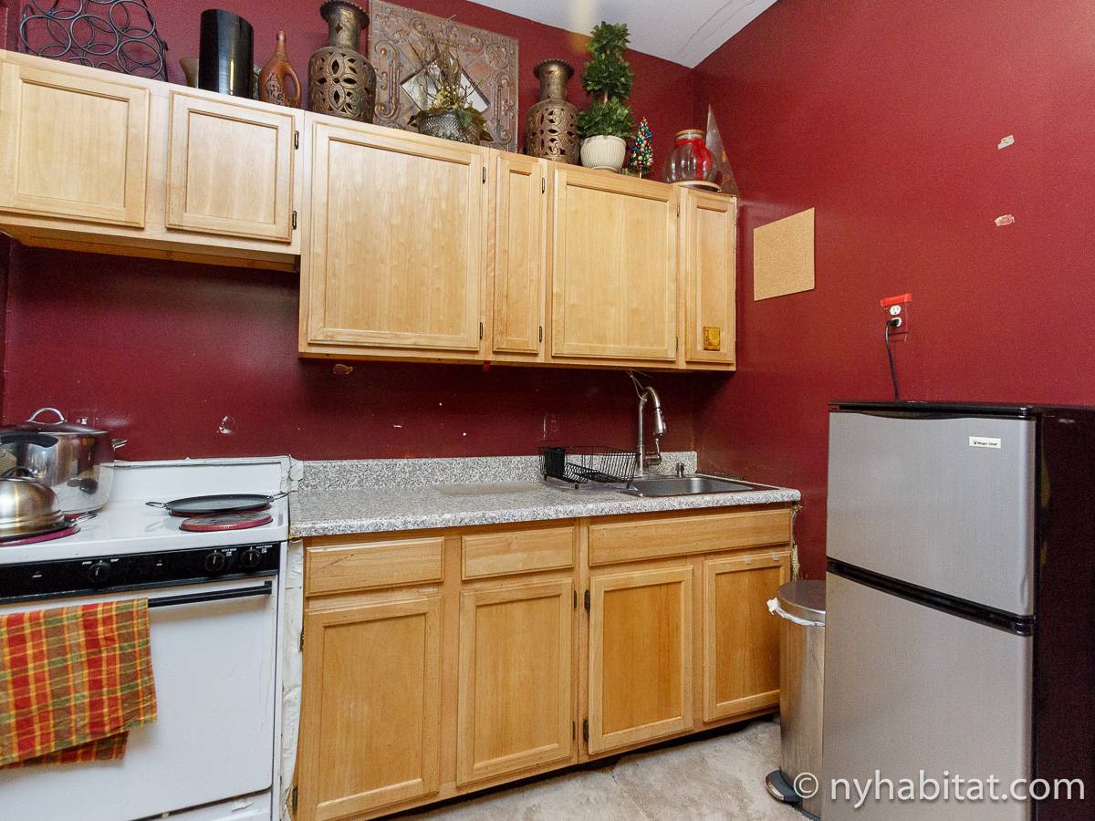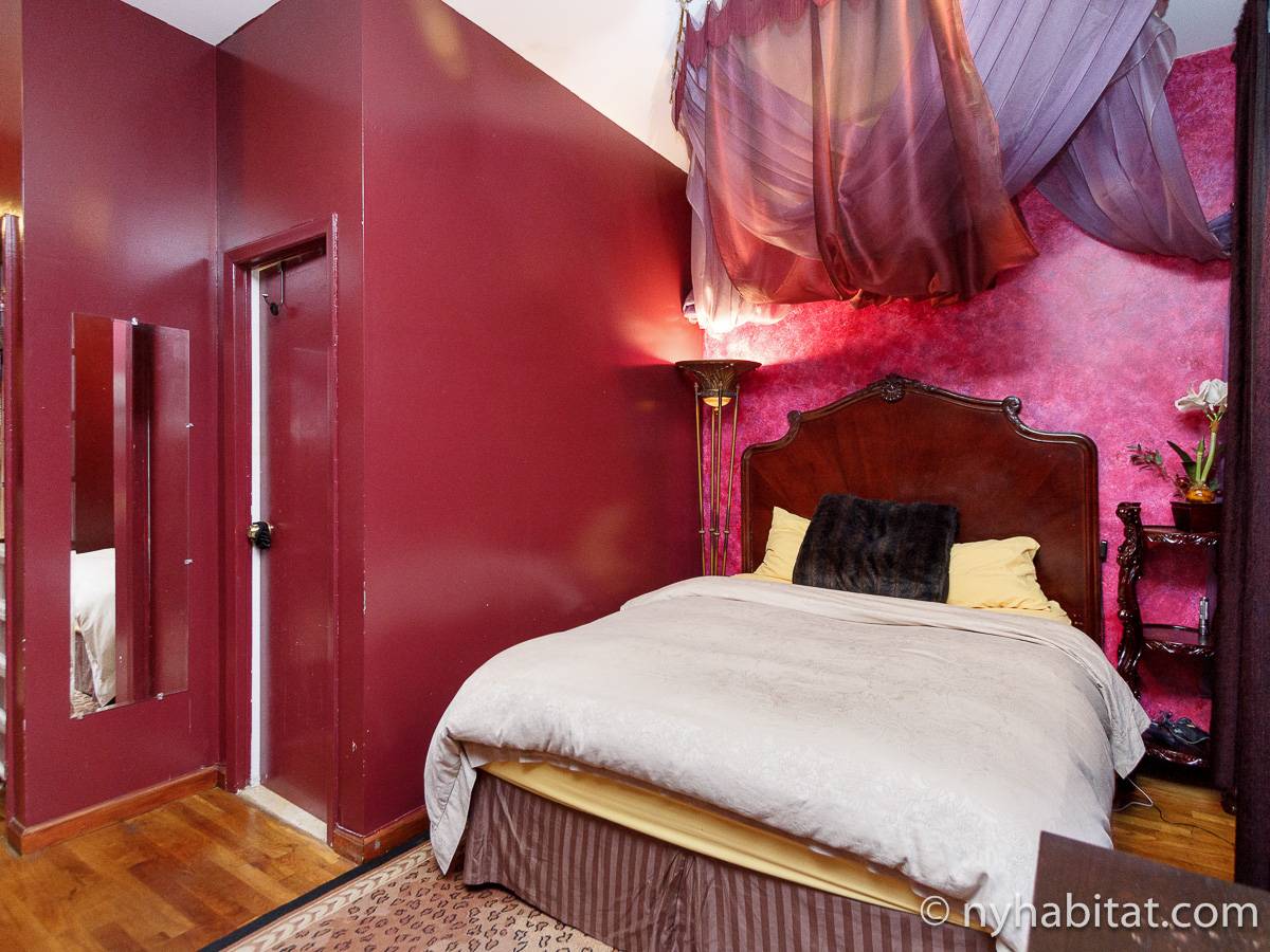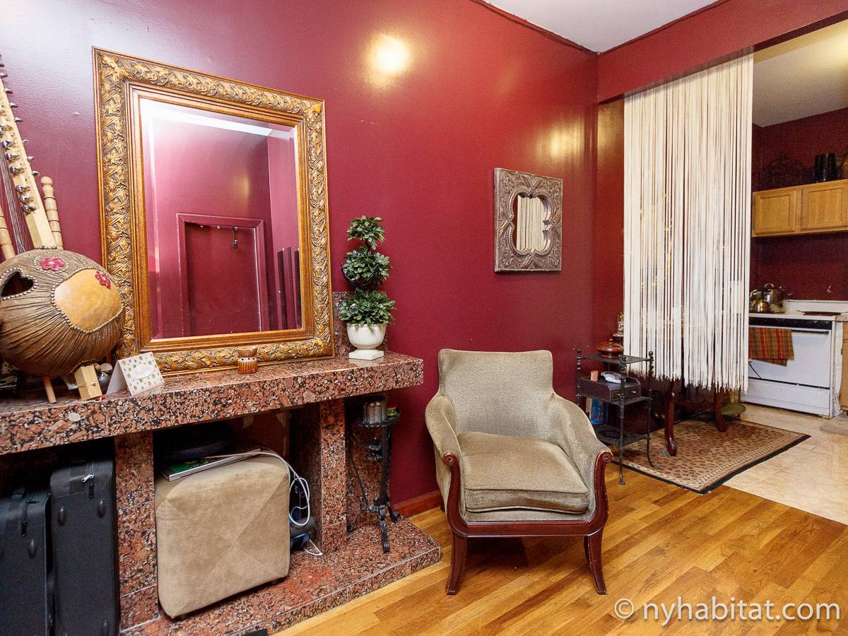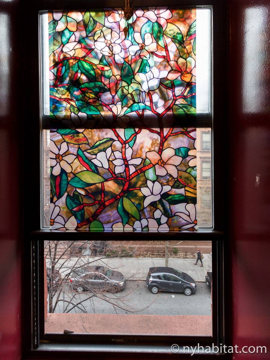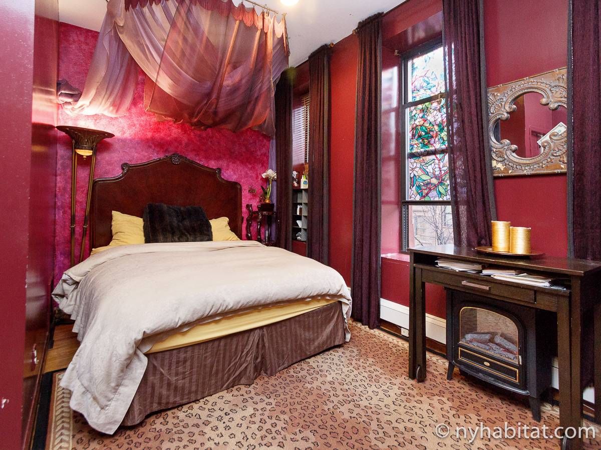 Lushly decorated with rich tones, fabrics, and unique vintage furniture, this studio has its own New York style! The main space includes a queen canopy bed for your comfort, a stone faux-mantelpiece, a stained glass window facing the street, and a cable TV in an antique cabinet. Cook at home in the full kitchen, which has an oven and gas stove, a sink, and a full-sized fridge and freezer. One full bathroom with bathtub is available.