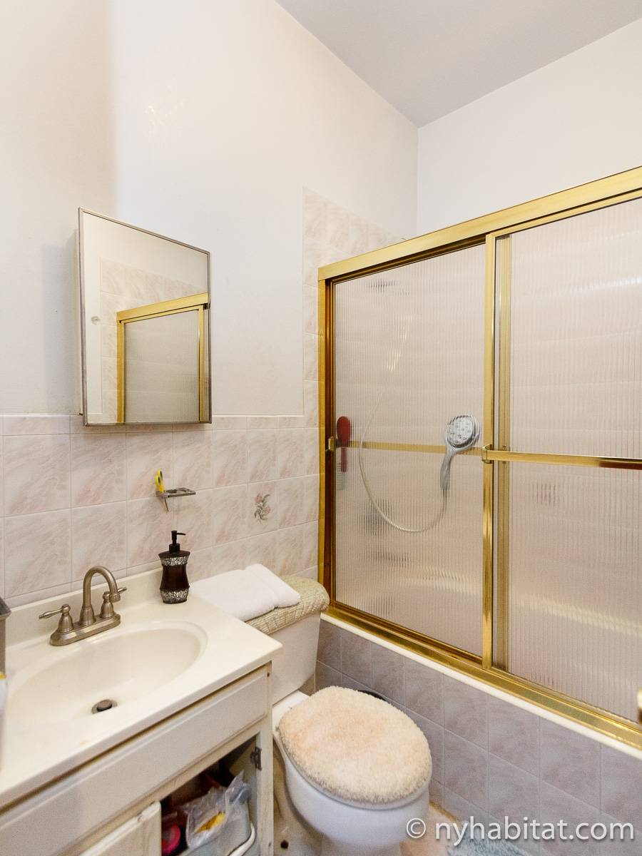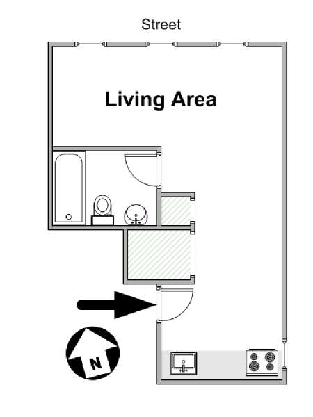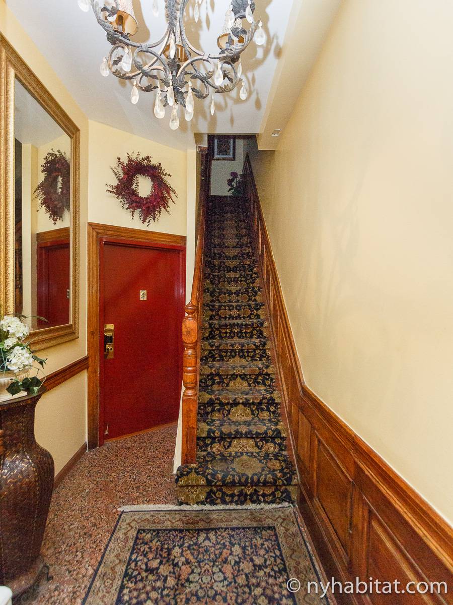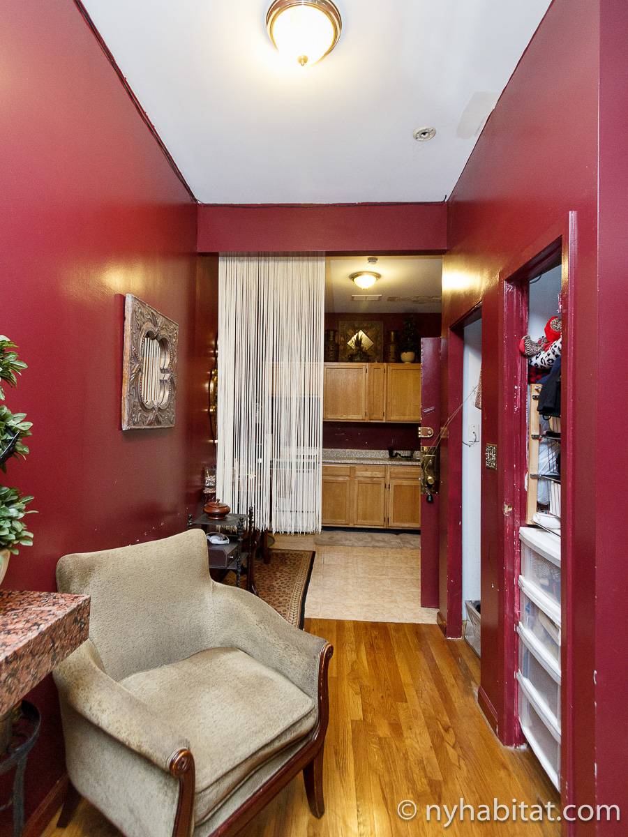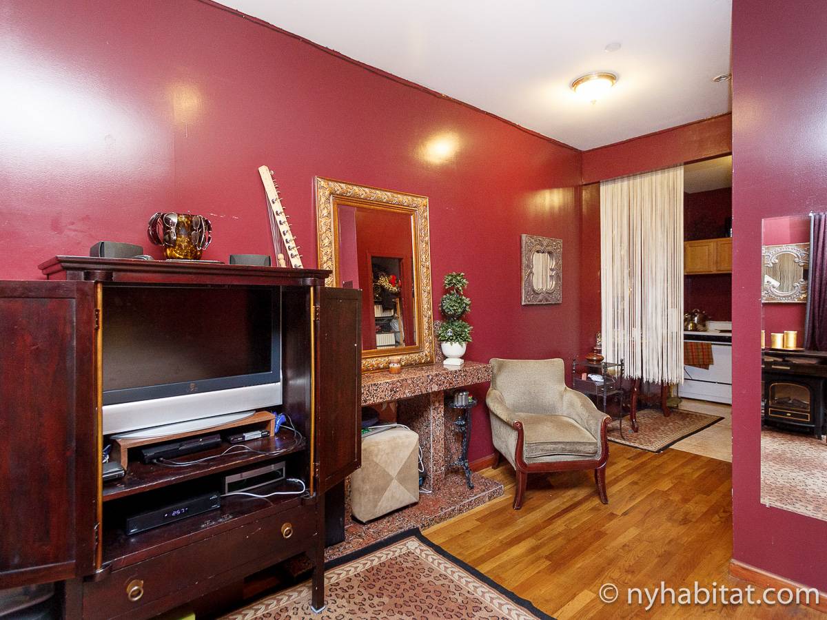Lushly decorated with rich tones, fabrics, and unique vintage furniture, this studio has its own New York style! The main space includes a queen canopy bed for your comfort, a stone faux-mantelpiece, a stained glass window facing the street, and a cable TV in an antique cabinet. Cook at home in the full kitchen, which has an oven and gas stove, a sink, and a full-sized fridge and freezer. One full bathroom with bathtub is available.