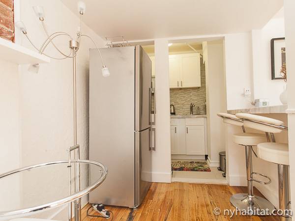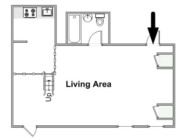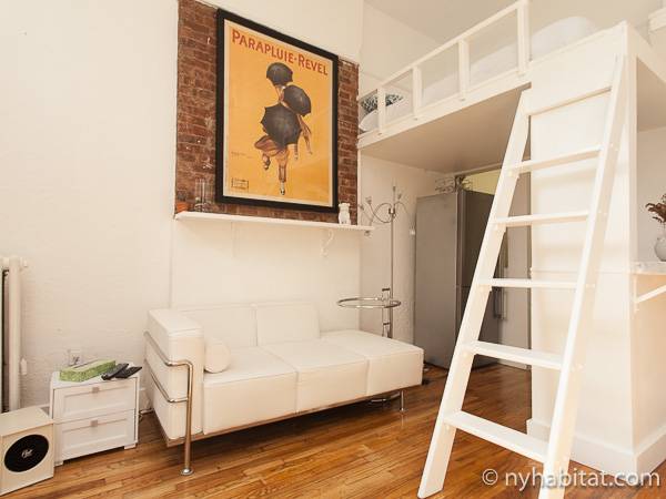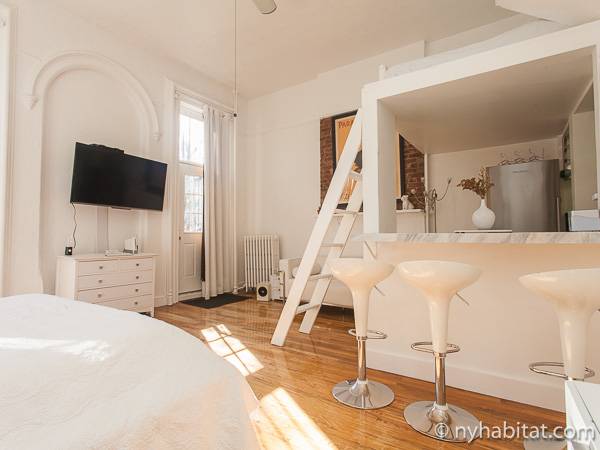 This contemporarily decorated studio is all about space saving while making a studio apartment have distinct areas for lounging, sleeping, and eating. The queen murphy bed tucks away for added living space during the day and can be pulled out at night for sleeping. An additional elevated loft area over the kitchen with full size bed provides a creative way to add additional sleeping space. The cozy kitchen area opens to a counter with bar stools which creates a kitchen nook while also allowing space for dining with seating open to the living area. The studio also has the added luxury of garden access for enjoying the outdoors right from home.