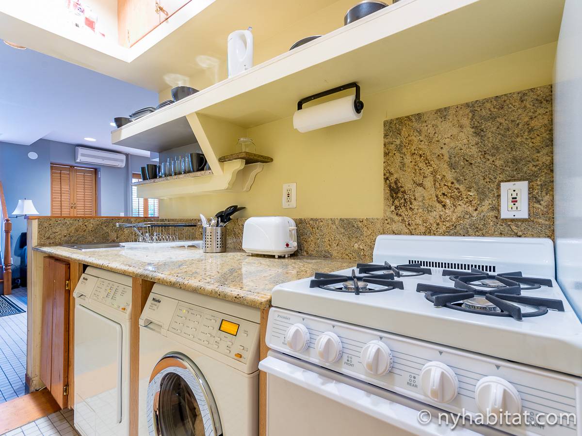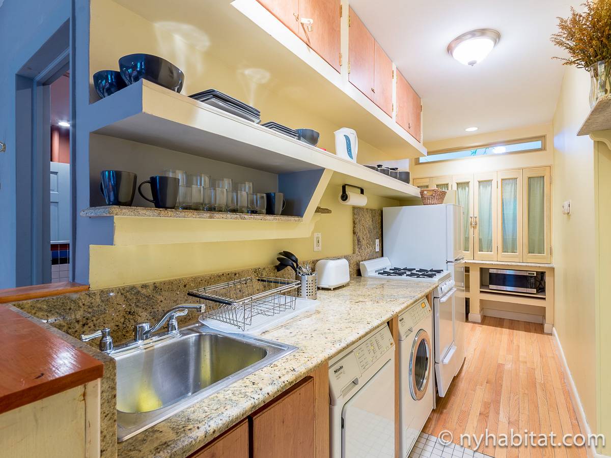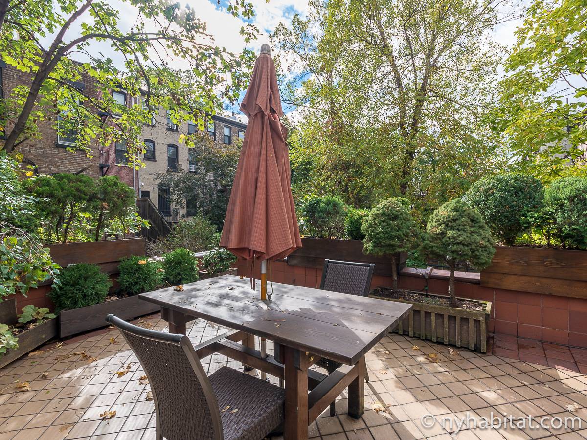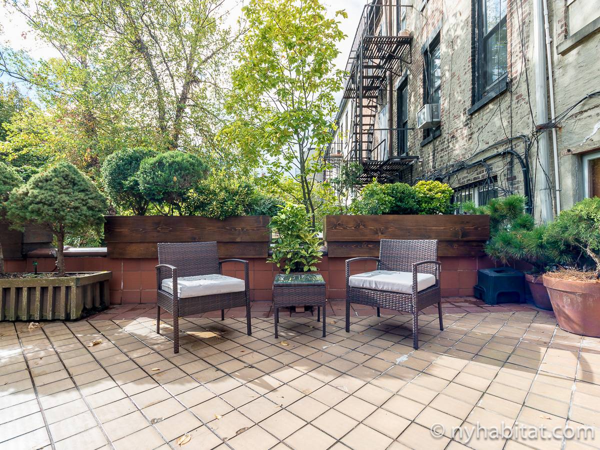 This studio apartment in on the second floor of a townhouse on 7th Avenue and Carroll Street is designed with intention. Built-in shelves are arranged around the apartment and filled with necessities like linens and dishes which add value to otherwise empty space. The open kitchen is a charming butter yellow shade with compact appliances including a gas stove, washer, and dryer and granite countertops. Finally, the apartment includes private access to a fully furnished patio fenced in with lush plants and equipped with a grill and room to entertain friends for a summer picnic.