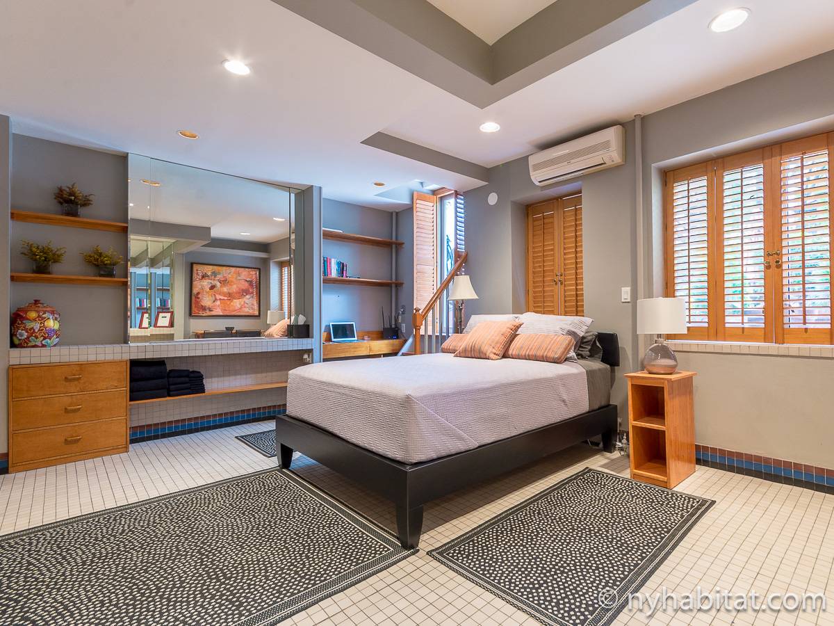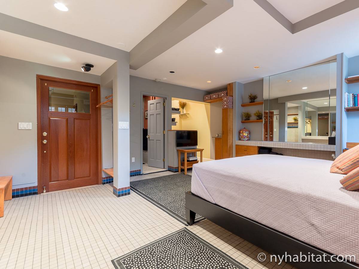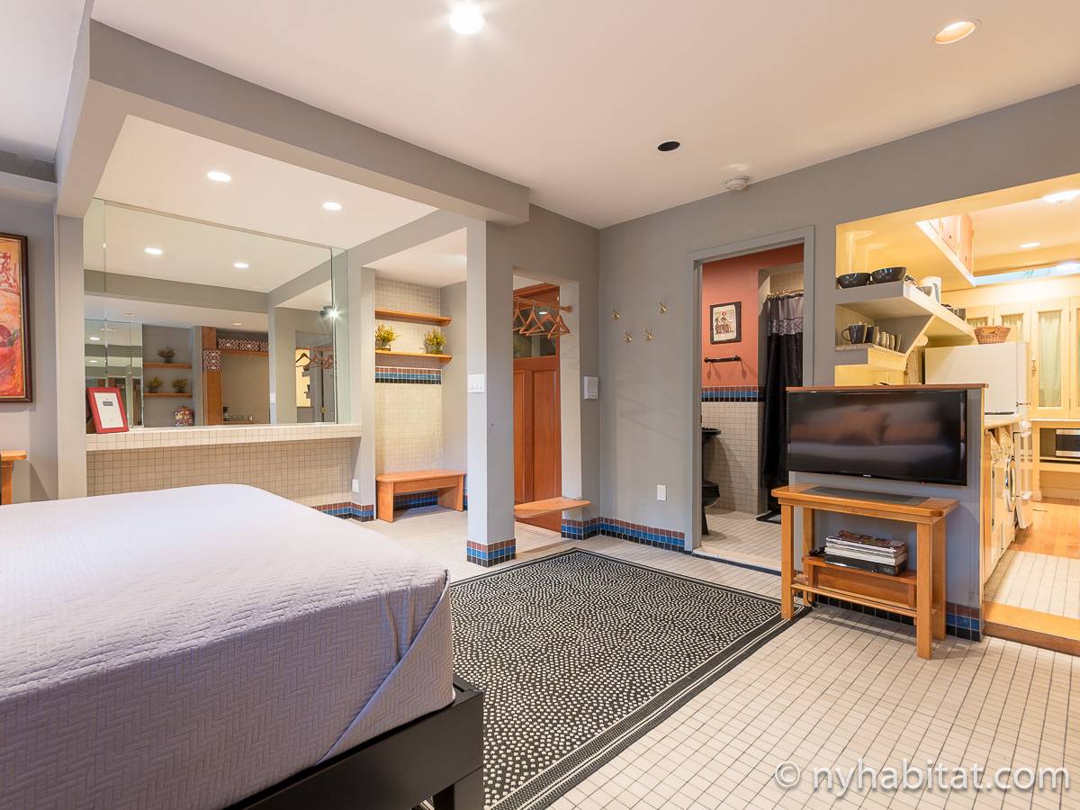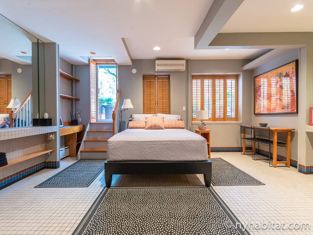 Mediterranean-style tile sets apart this studio apartment in Park Slope, Brooklyn. The small taupe squares organized throughout the apartment would have a more staunch effect if not for the warm wood oak detailing in the wooden shutters above the queen-sized bed and modern furniture. The various shades of grey and subdued terra cotta orange color build an elegant atmosphere.