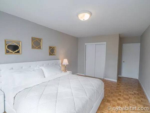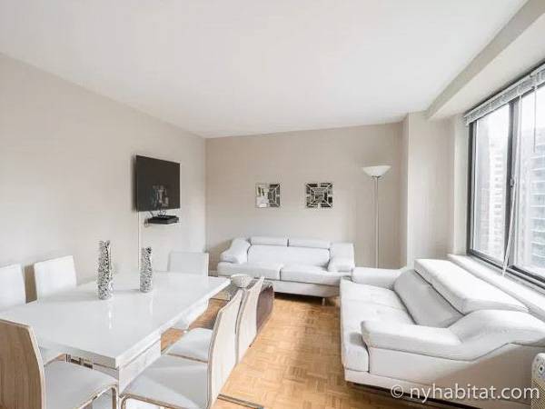 Upon entering this fully furnished apartment, you will find wall-to-wall hardwood floors, contemporary furniture and plenty of natural light. Two modern white leather sofas are facing the wall-mounted flat screen television and a dining table with six chairs will allow you to have dinner at home. The kitchen offers stainless steel appliances and all the necessary cookware and dishware. For your convenience, a dishwasher is installed as well as a coffee maker and a toaster. The bedroom features a double-sized bed, a flat screen television and a closet for storage space. There is an extra sleeping alcove in the apartment (Living Room 2 on the pictures) which features a double-sized bed.