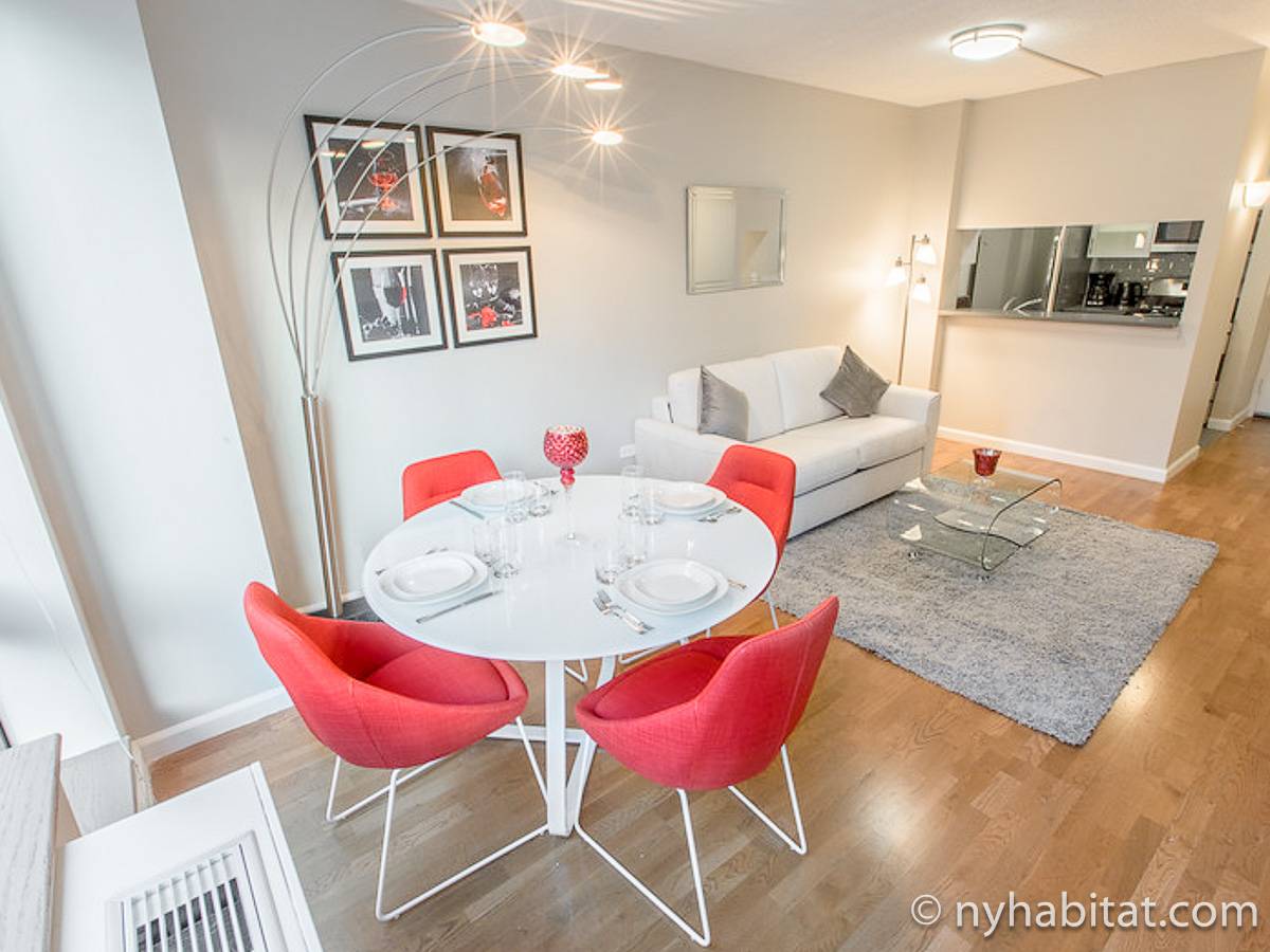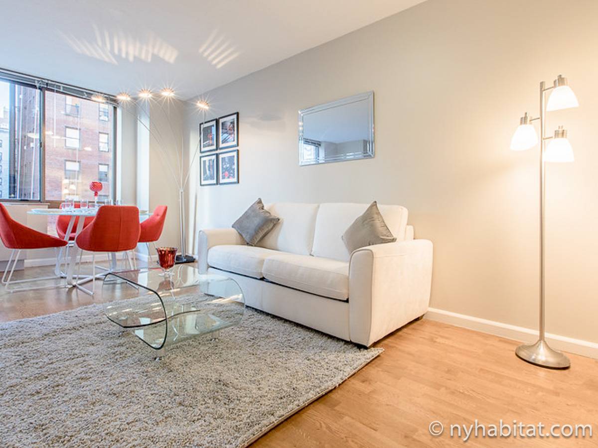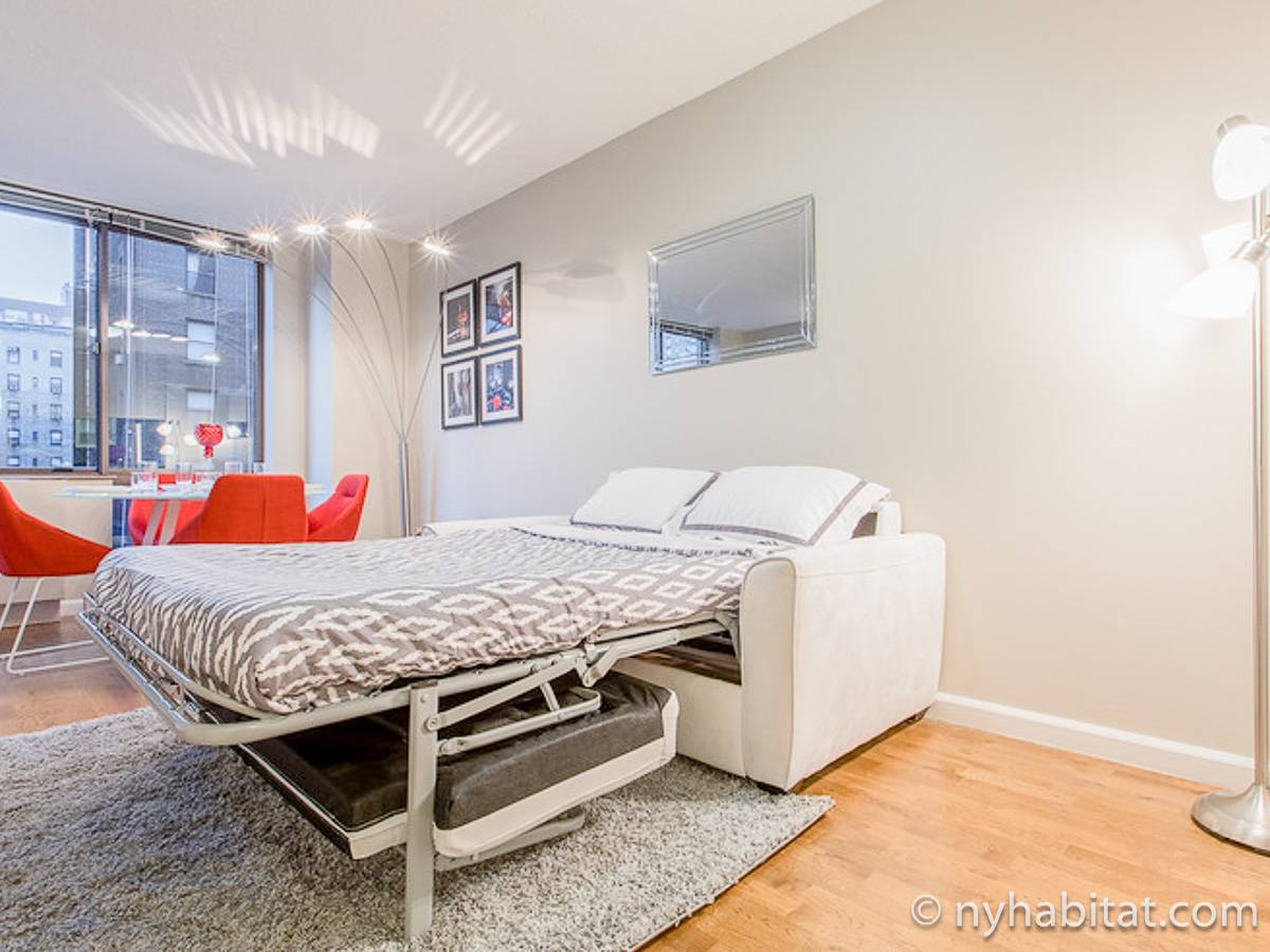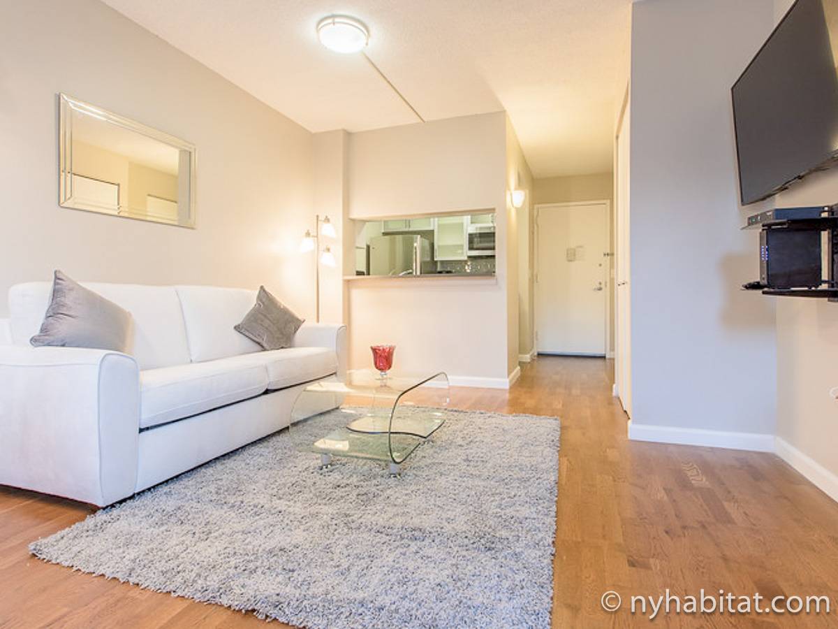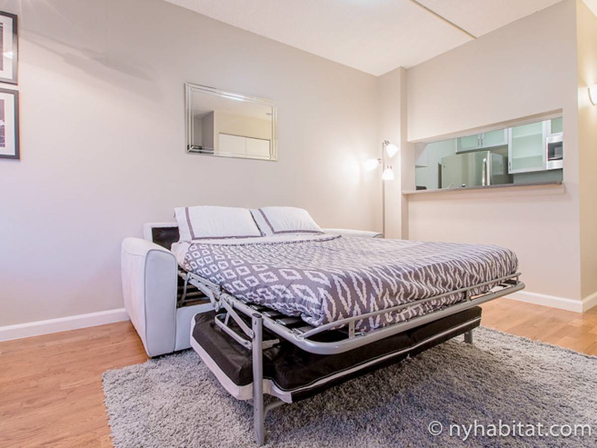 This furnished New York studio apartment is decorated in a neutral color palette and has hardwood floors throughout. The living room is illuminated by a wall of windows and is furnished with a white sofa that opens to a double sofa bed, a coffee table and flat screen TV with cable for entertainment. There is also a dining table that seats four for a comfortable meal at home looking out over the city. The kitchen is located off the living room and is designed with contemporary cabinetry, granite countertops and stainless steel appliances. It is fully equipped with stove/oven, microwave, toaster, refrigerator, and dishwasher. The queen size bed sits in a cozy corner by the window along with night table and custom closets. The bathroom is styled in black and white with both tub and shower options, large mirror and under vanity storage space. Laundry facilities are conveniently located in the building.