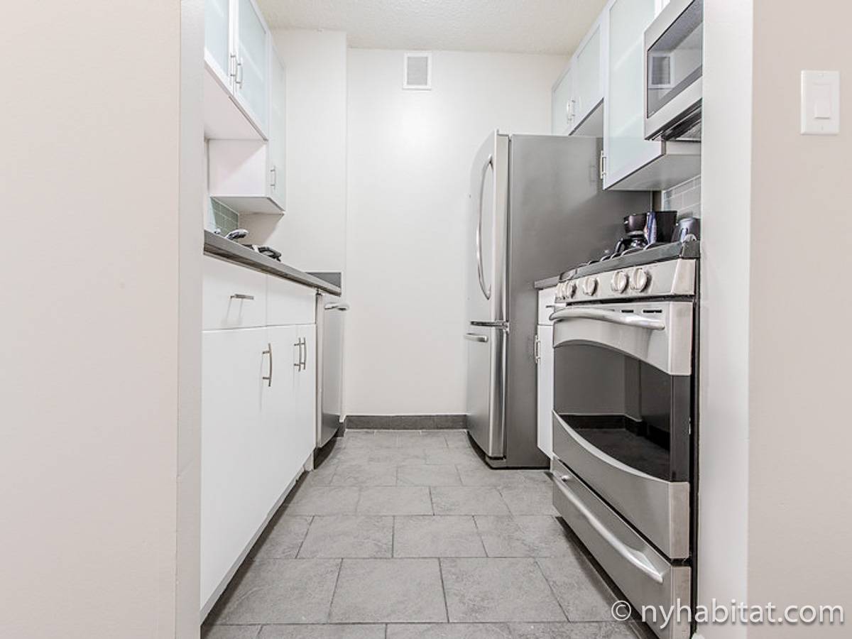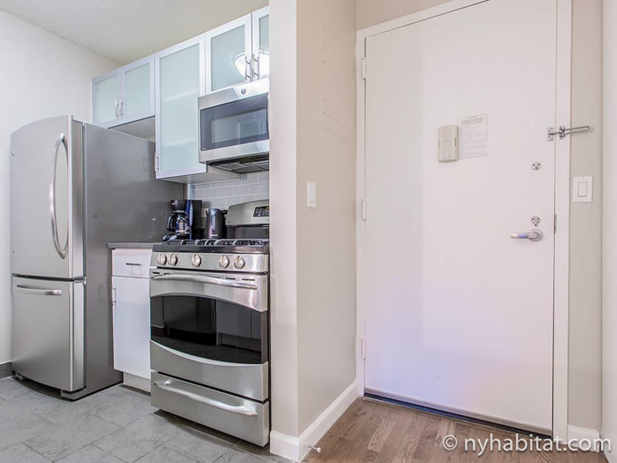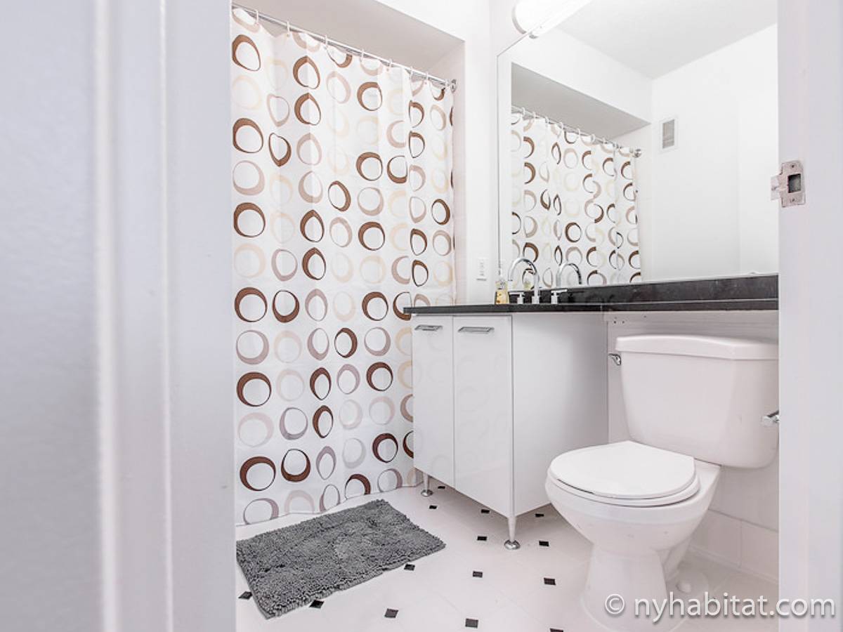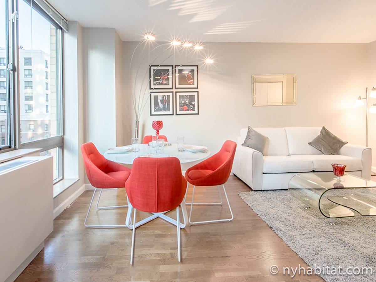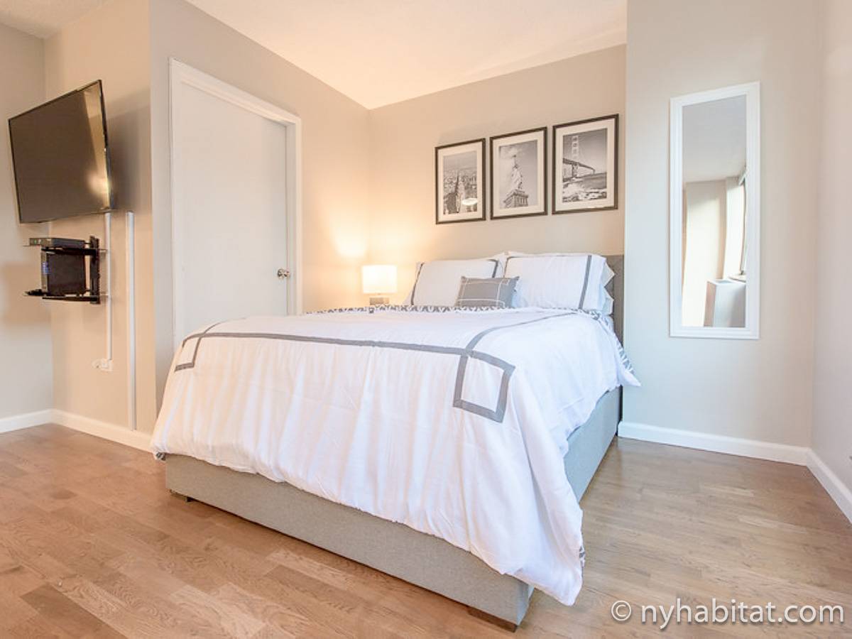 This furnished New York studio apartment is decorated in a neutral color palette and has hardwood floors throughout. The living room is illuminated by a wall of windows and is furnished with a white sofa that opens to a double sofa bed, a coffee table and flat screen TV with cable for entertainment. There is also a dining table that seats four for a comfortable meal at home looking out over the city. The kitchen is located off the living room and is designed with contemporary cabinetry, granite countertops and stainless steel appliances. It is fully equipped with stove/oven, microwave, toaster, refrigerator, and dishwasher. The queen size bed sits in a cozy corner by the window along with night table and custom closets. The bathroom is styled in black and white with both tub and shower options, large mirror and under vanity storage space. Laundry facilities are conveniently located in the building.