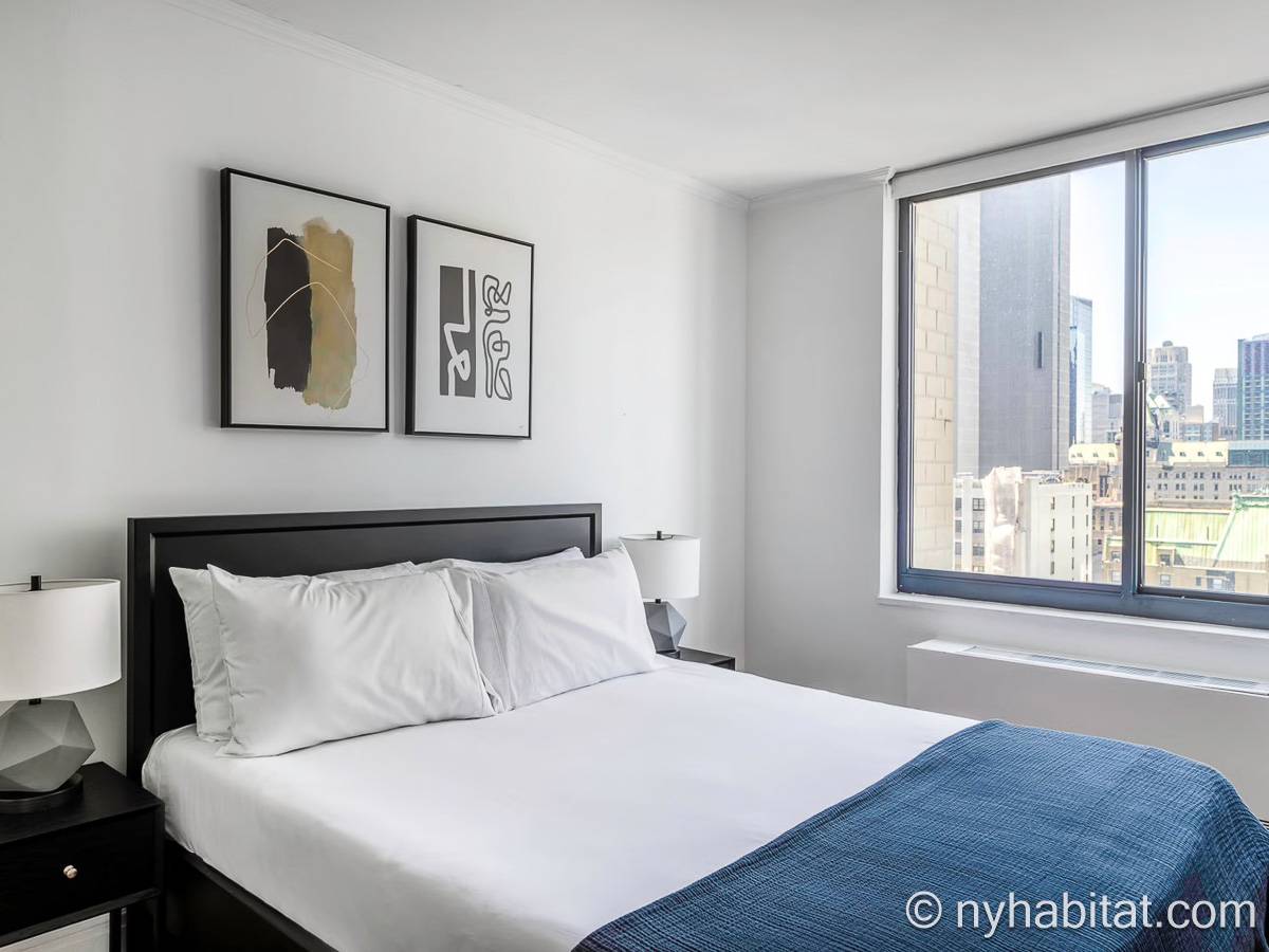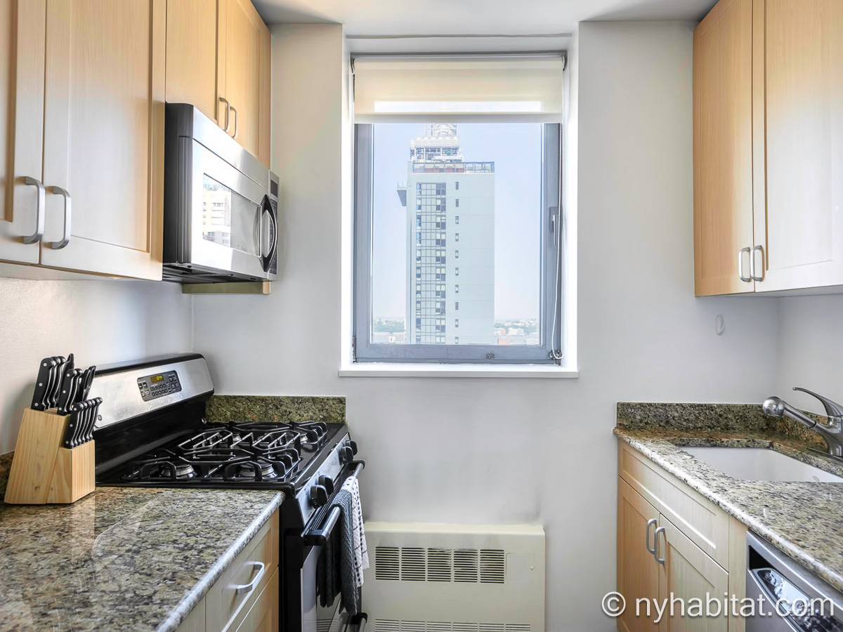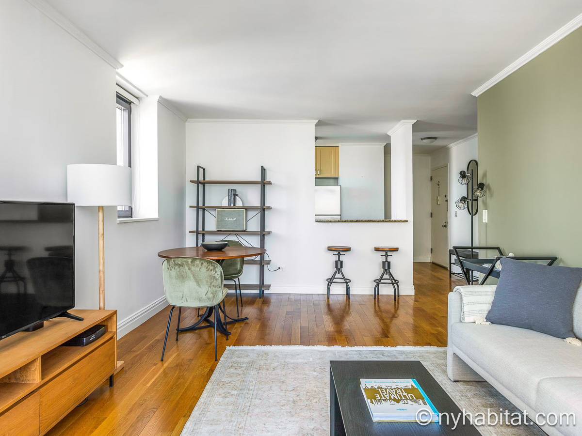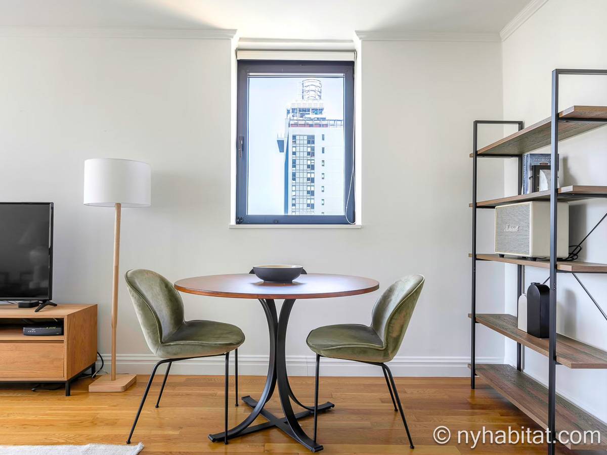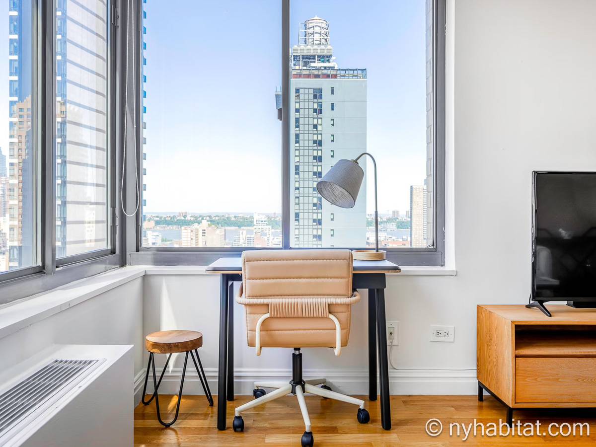 Upscale Manhattan living is yours at this one bedroom furnished apartment with stunning city views and upscale building amenities. The apartment has hardwood floors and air conditioning throughout and is fully furnished with all the comforts of home so you can easily transition to New York City living. The sunny living room features a wall of windows letting in natural light and providing incredible views of Manhattan. Here you can relax in the sunlight or catch a movie on the flat screen AppleTV. After a day out in the city, return to your apartment and prepare a home cooked meal in the kitchen equipped with all the essentials including a dishwasher! A countertop bar opens the space between living room and kitchen, providing bar stools for an eat-in kitchen on one side and a full dining table on the living room side. The cozy bedroom is furnished with a wood framed queen size bed and night table along with a small side table and armchair to relax in and closets for storage of your belongings. The bathroom is equipped with a tub/shower, mirrored vanity area, a toilet, and sink with cabinet space beneath.