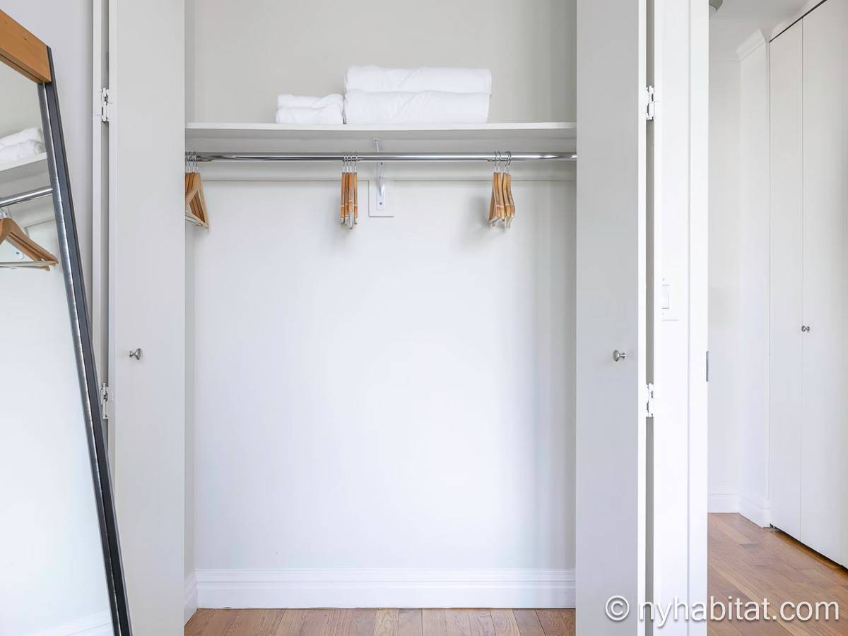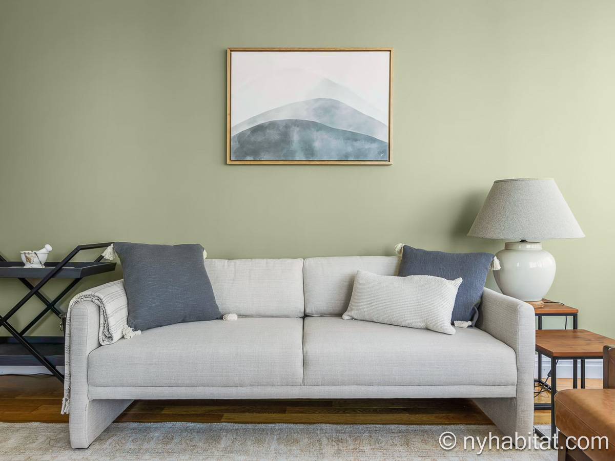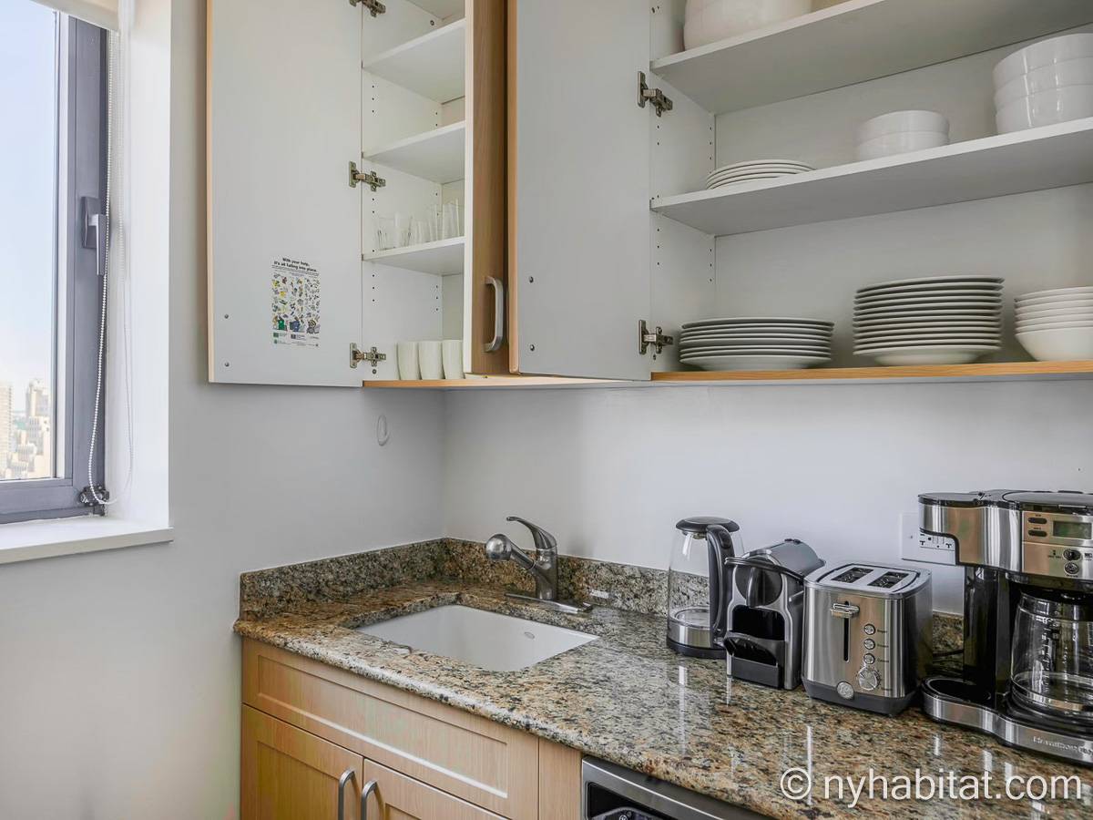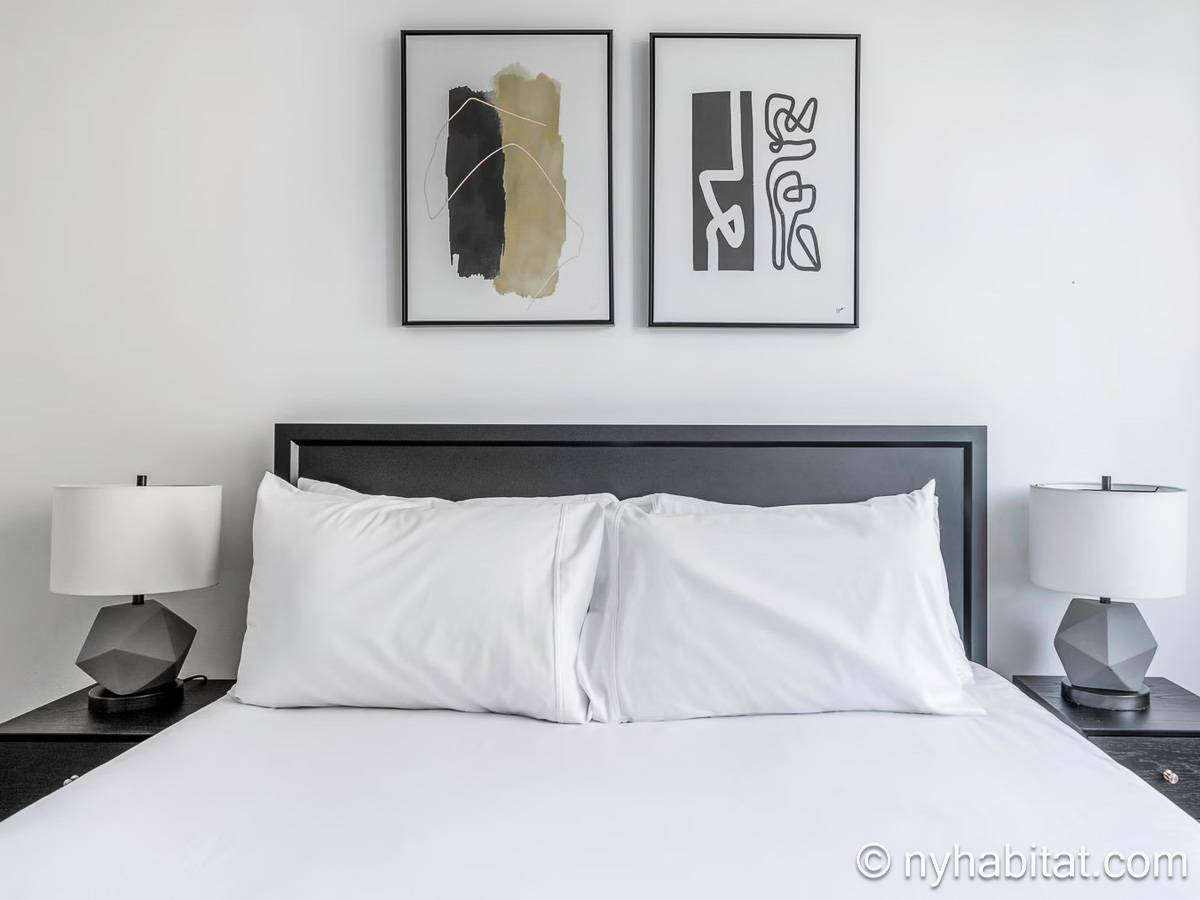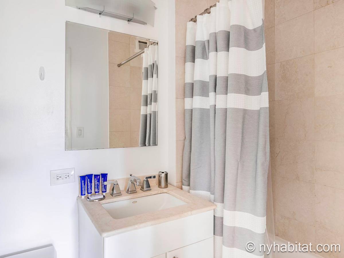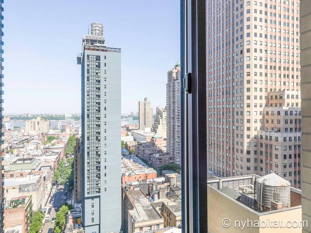Upscale Manhattan living is yours at this one bedroom furnished apartment with stunning city views and upscale building amenities. The apartment has hardwood floors and air conditioning throughout and is fully furnished with all the comforts of home so you can easily transition to New York City living. The sunny living room features a wall of windows letting in natural light and providing incredible views of Manhattan. Here you can relax in the sunlight or catch a movie on the flat screen AppleTV. After a day out in the city, return to your apartment and prepare a home cooked meal in the kitchen equipped with all the essentials including a dishwasher! A countertop bar opens the space between living room and kitchen, providing bar stools for an eat-in kitchen on one side and a full dining table on the living room side. The cozy bedroom is furnished with a wood framed queen size bed and night table along with a small side table and armchair to relax in and closets for storage of your belongings. The bathroom is equipped with a tub/shower, mirrored vanity area, a toilet, and sink with cabinet space beneath.