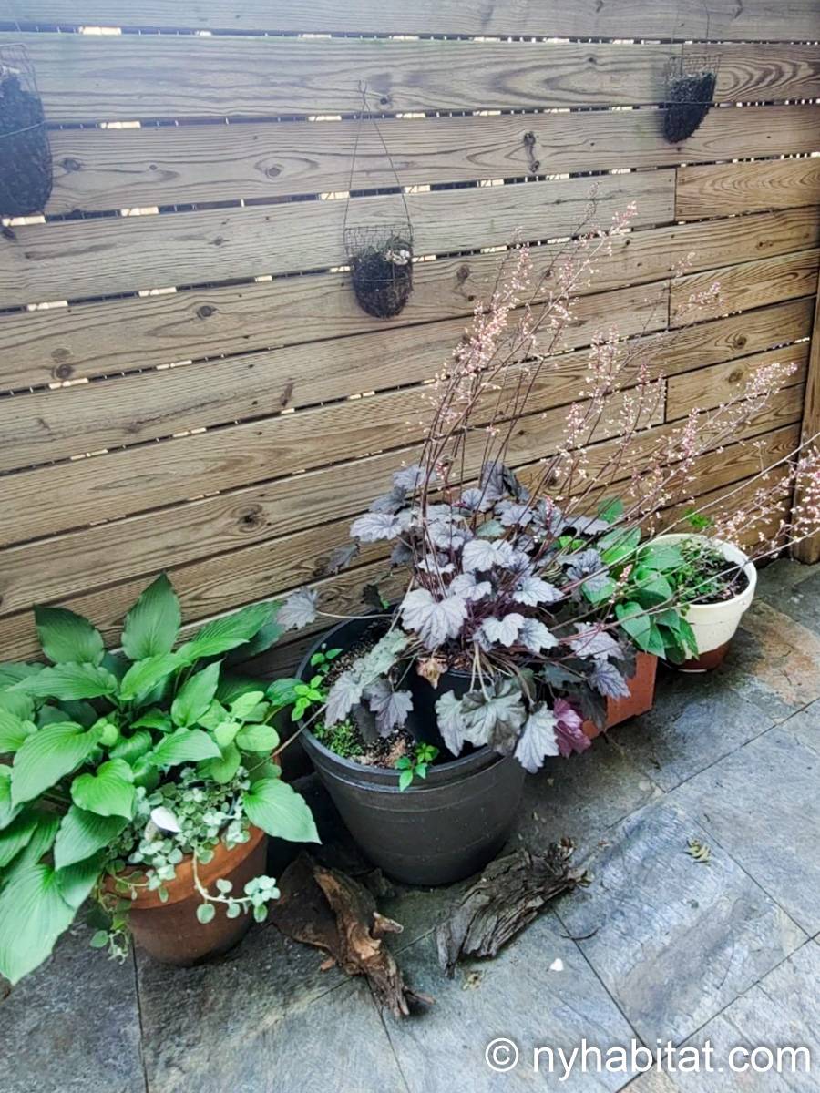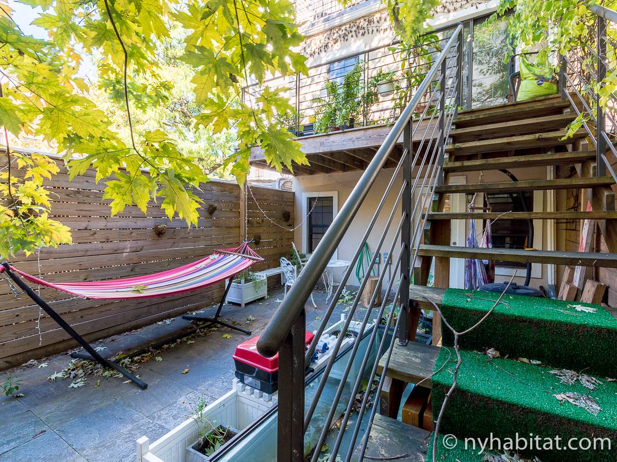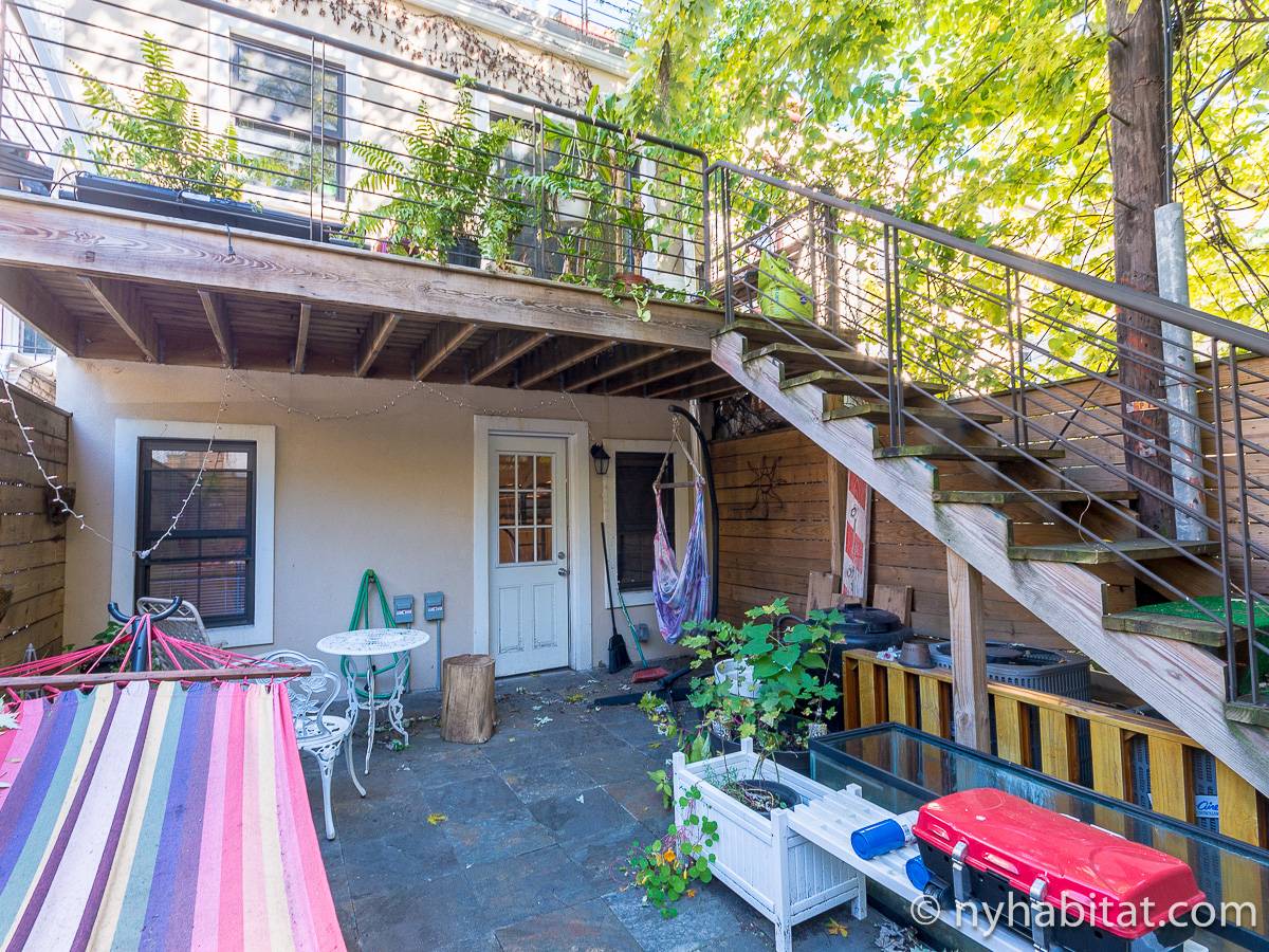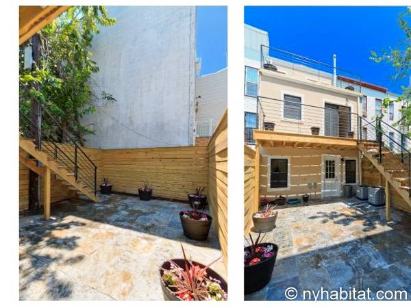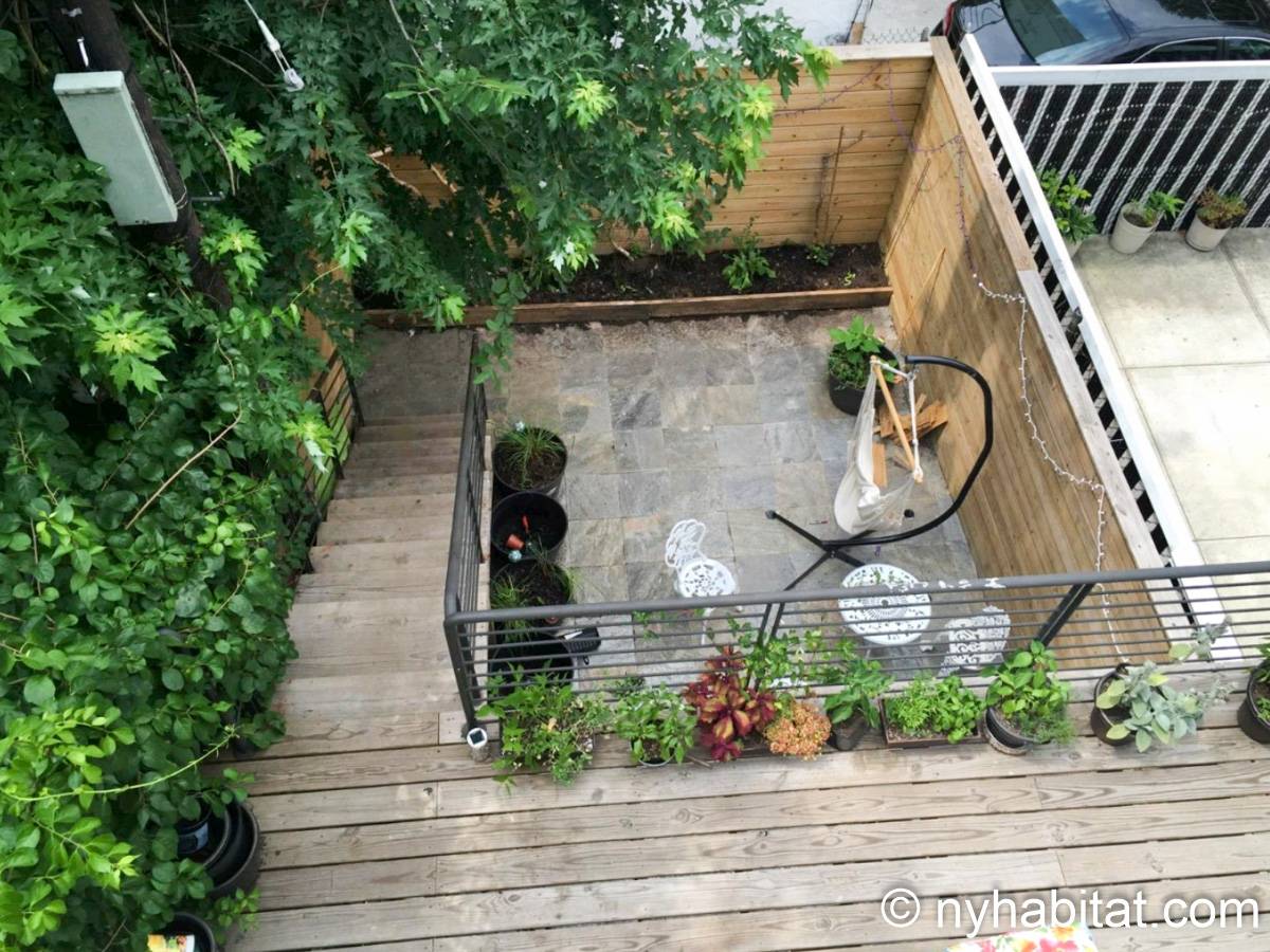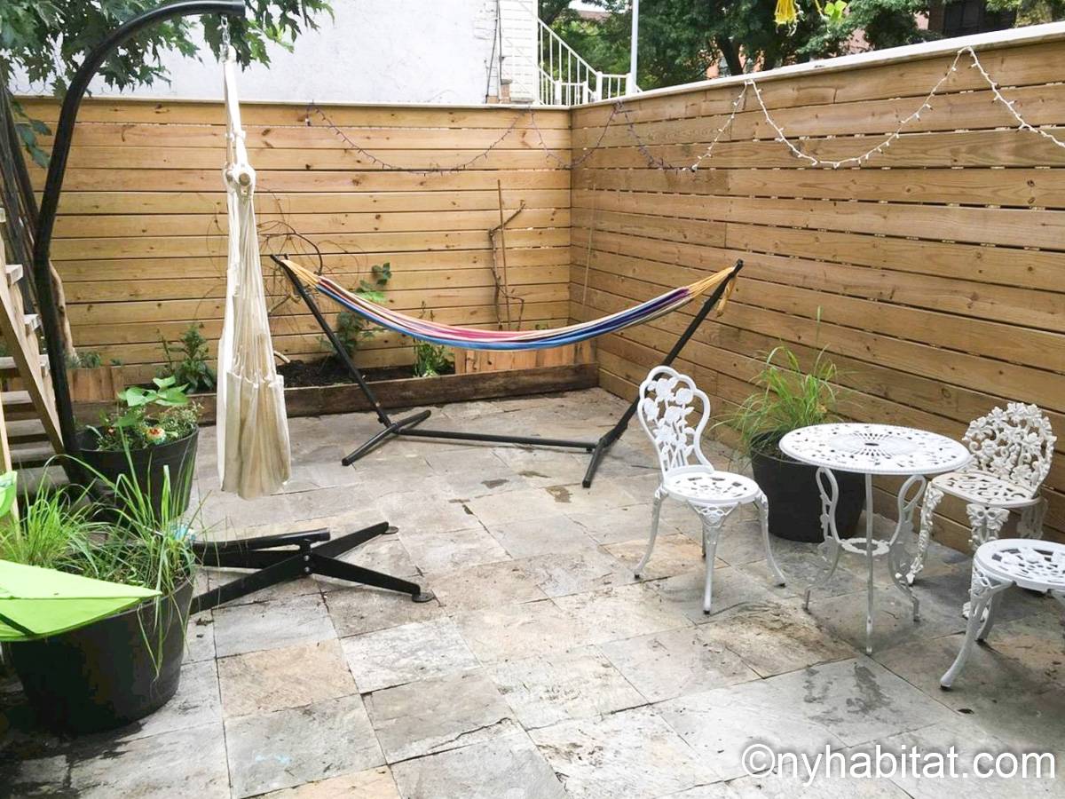 The apartment features a living room and two bedrooms facing the backyard area, offering a serene view to help you unwind after a long day exploring the city. Both rooms in the apartment offer closet space for storage. The apartment also features a modernly designed bathroom with a tub and rainfall shower, toilet, vanity mirror, and sink with storage cabinets beneath.The backyard can be accessed through one of the bedrooms. This outdoor space is a rare find in NYC and is perfect for escaping the hustle and bustle of city life.