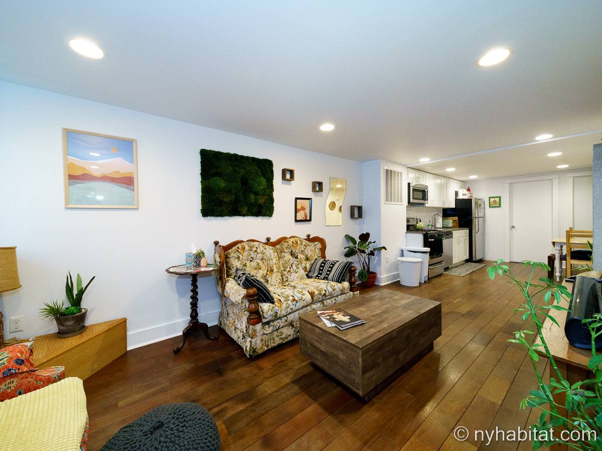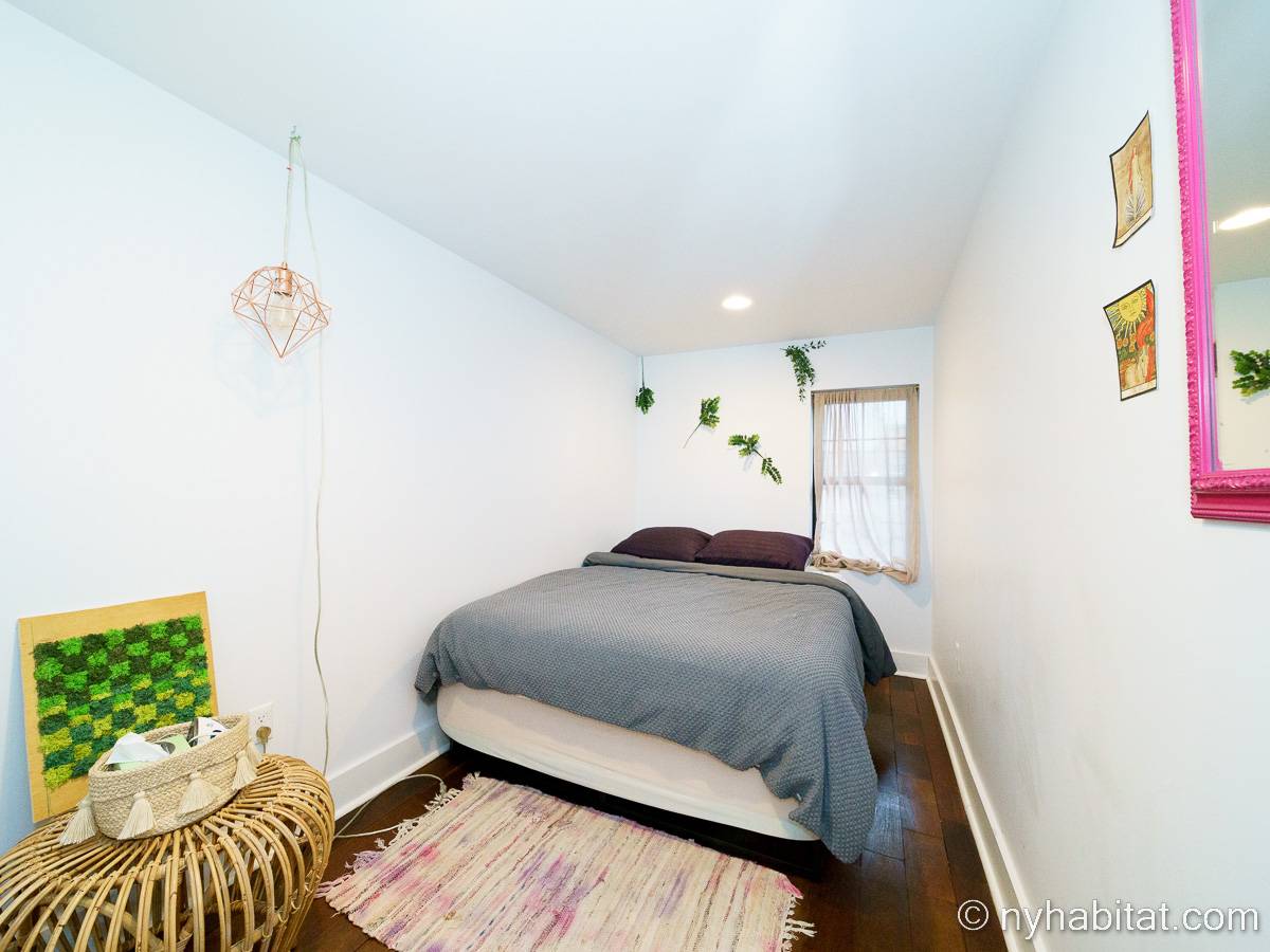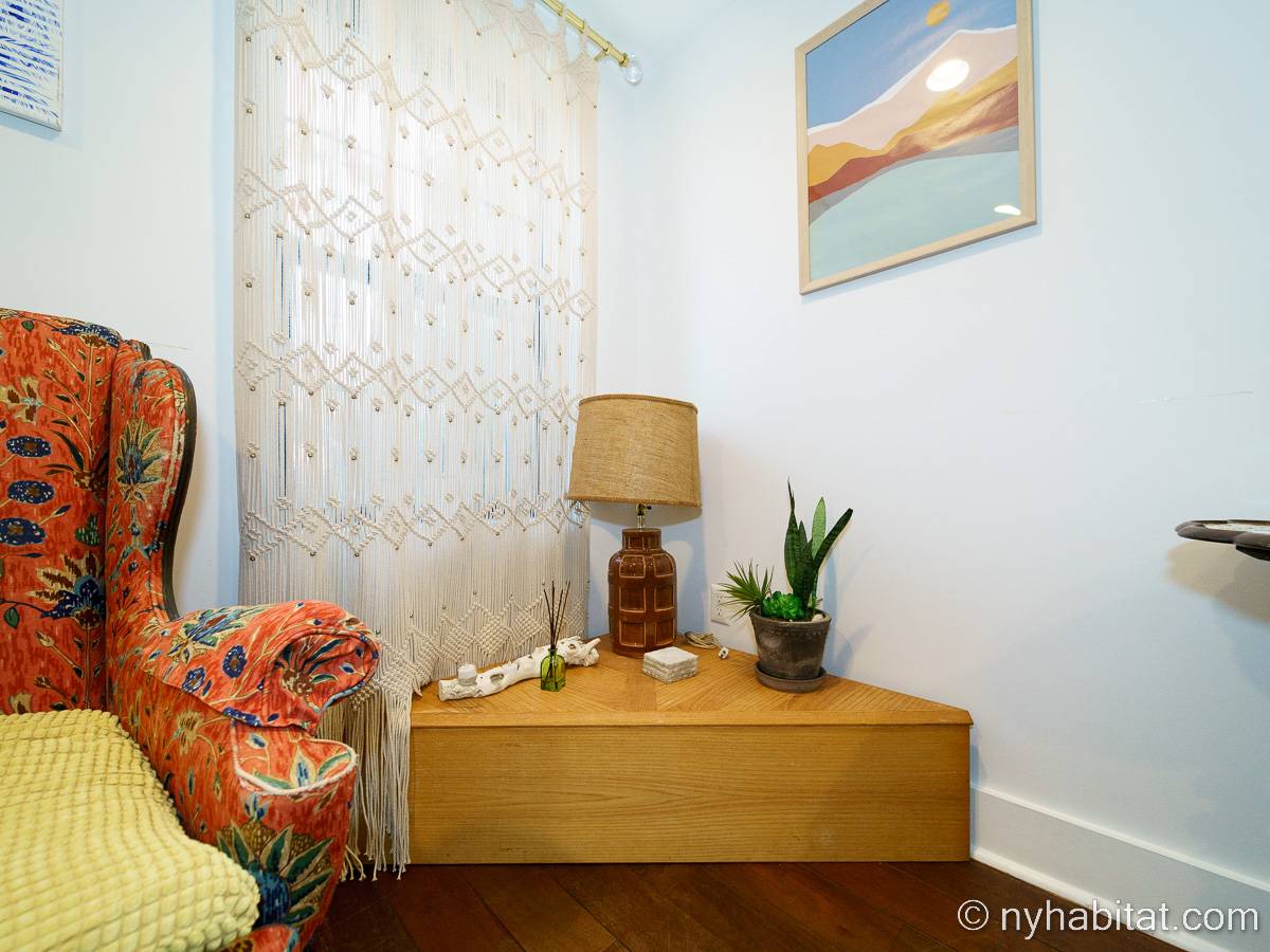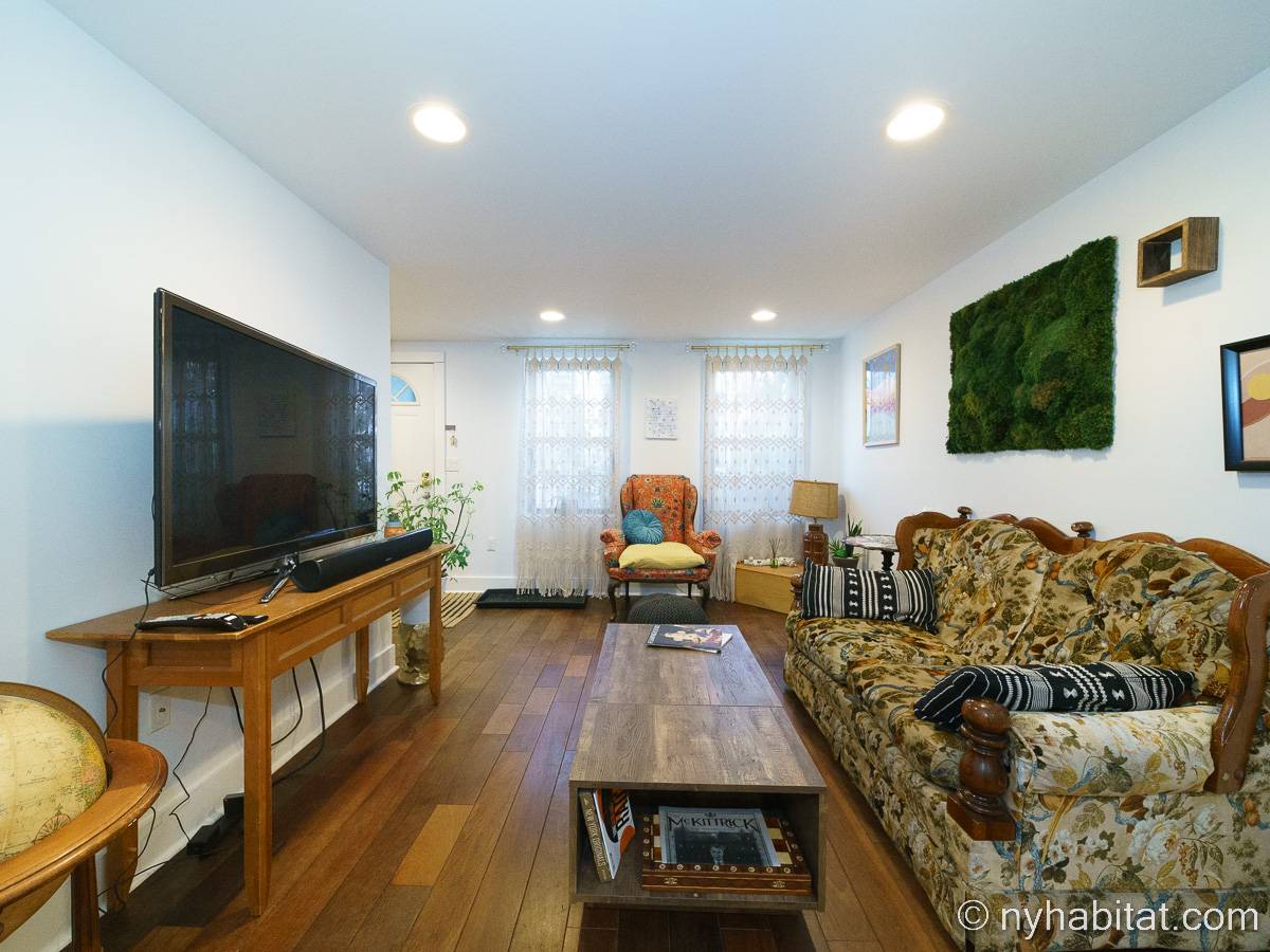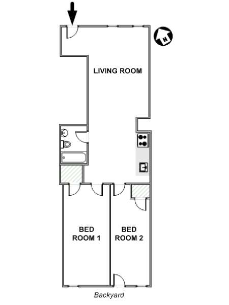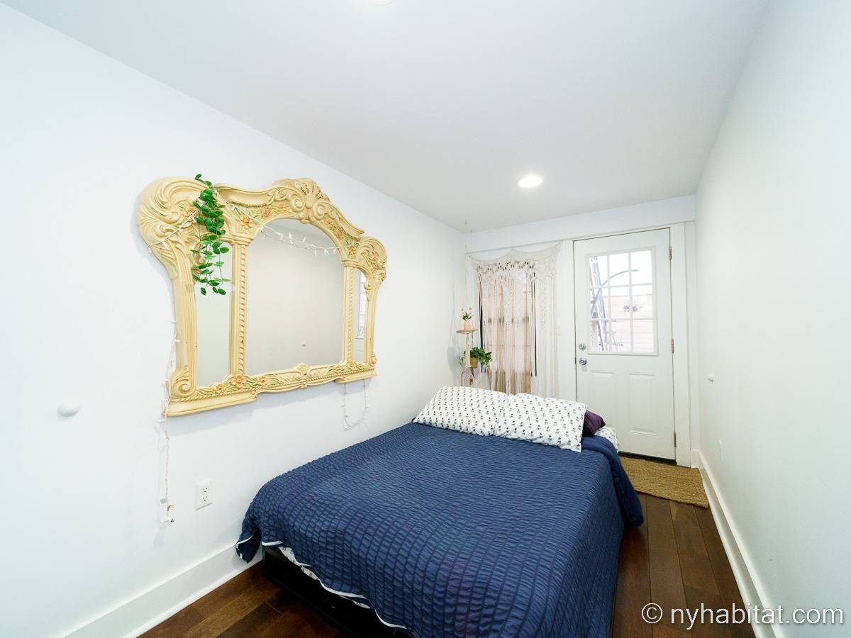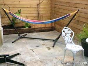 The apartment features a living room and two bedrooms facing the backyard area, offering a serene view to help you unwind after a long day exploring the city. Both rooms in the apartment offer closet space for storage. The apartment also features a modernly designed bathroom with a tub and rainfall shower, toilet, vanity mirror, and sink with storage cabinets beneath.The backyard can be accessed through one of the bedrooms. This outdoor space is a rare find in NYC and is perfect for escaping the hustle and bustle of city life.