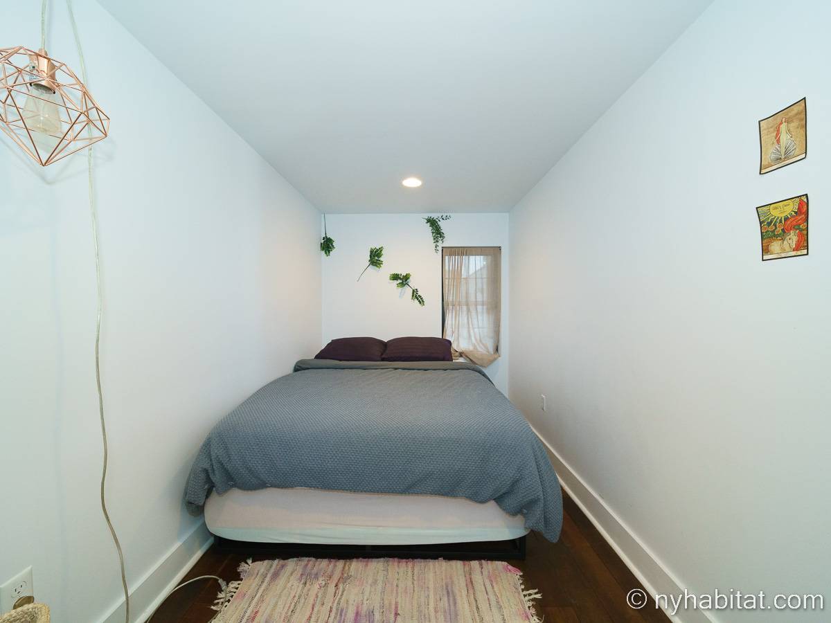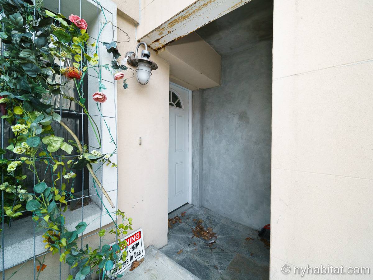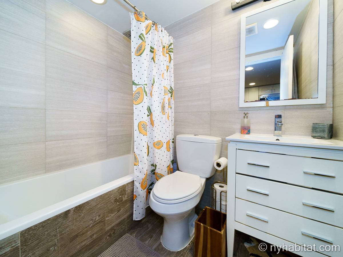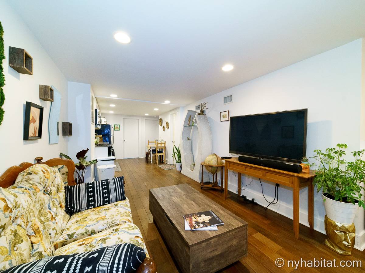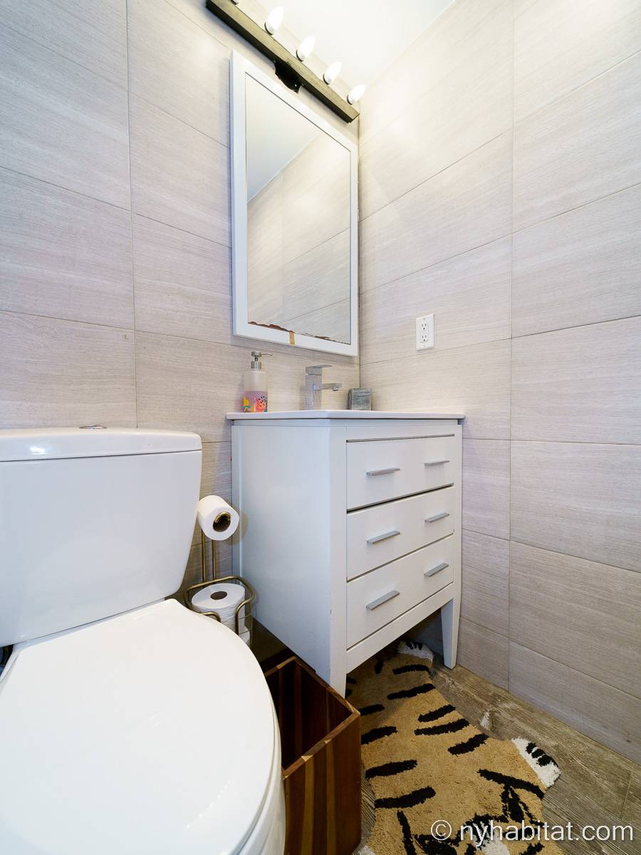 The apartment features a living room and two bedrooms facing the backyard area, offering a serene view to help you unwind after a long day exploring the city. Both rooms in the apartment offer closet space for storage. The apartment also features a modernly designed bathroom with a tub and rainfall shower, toilet, vanity mirror, and sink with storage cabinets beneath.The backyard can be accessed through one of the bedrooms. This outdoor space is a rare find in NYC and is perfect for escaping the hustle and bustle of city life.