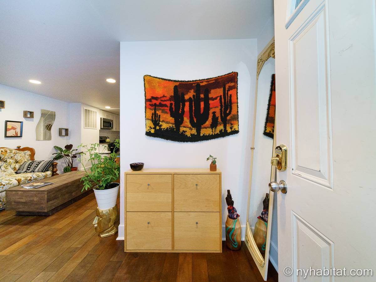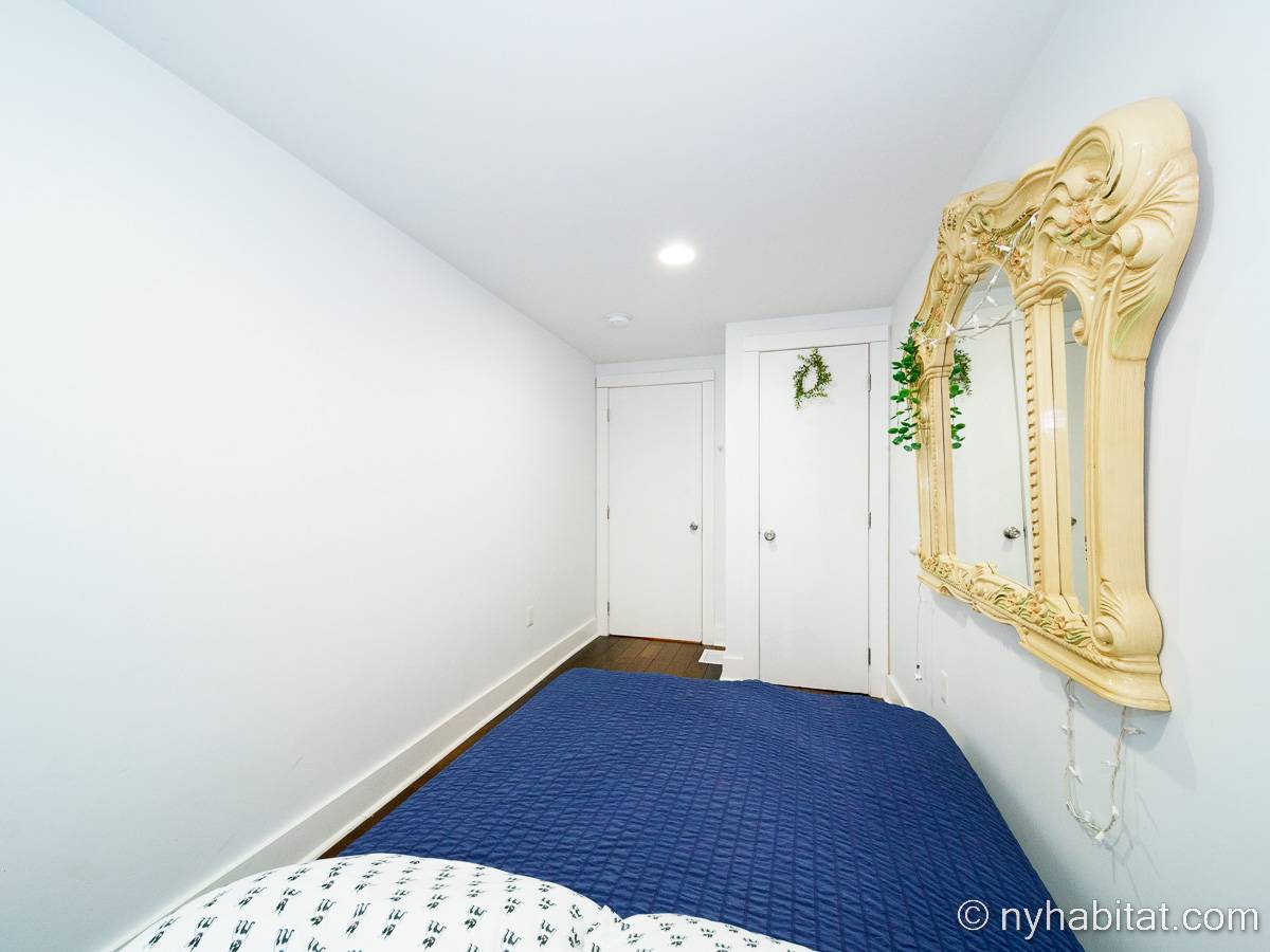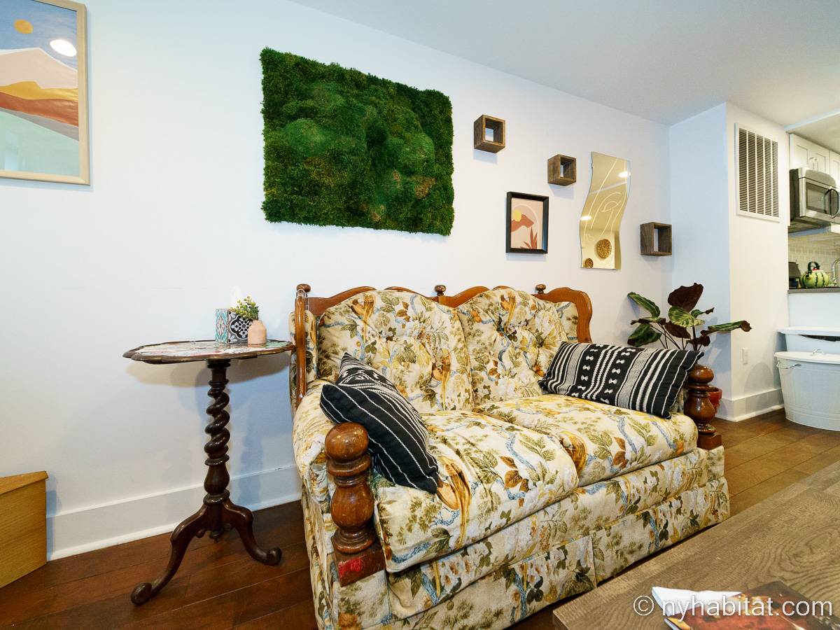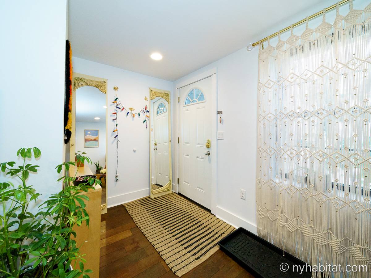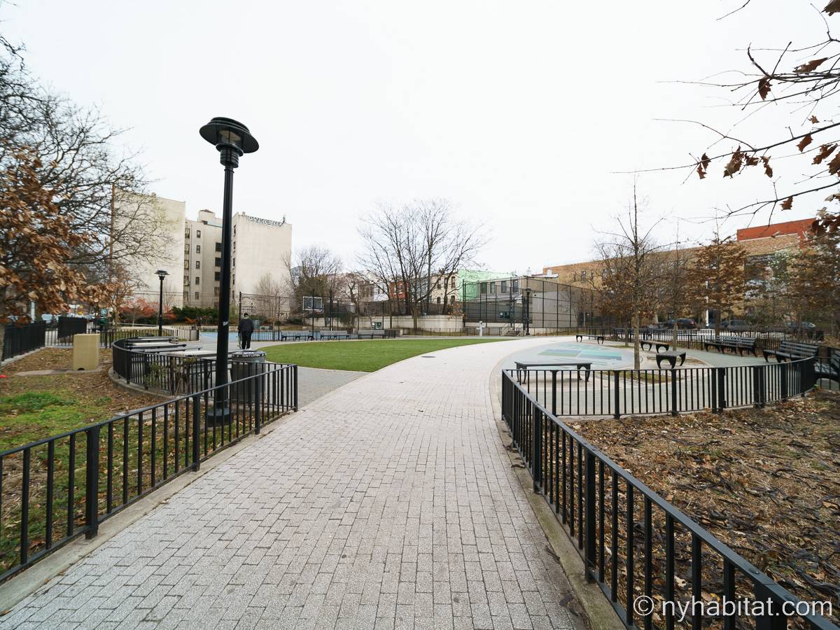 The apartment features a living room and two bedrooms facing the backyard area, offering a serene view to help you unwind after a long day exploring the city. Both rooms in the apartment offer closet space for storage. The apartment also features a modernly designed bathroom with a tub and rainfall shower, toilet, vanity mirror, and sink with storage cabinets beneath.The backyard can be accessed through one of the bedrooms. This outdoor space is a rare find in NYC and is perfect for escaping the hustle and bustle of city life.
