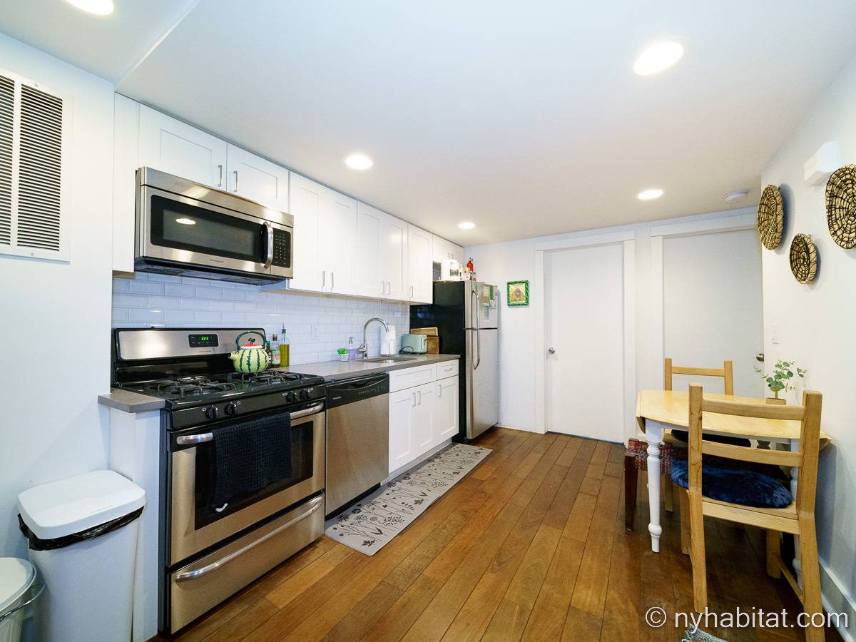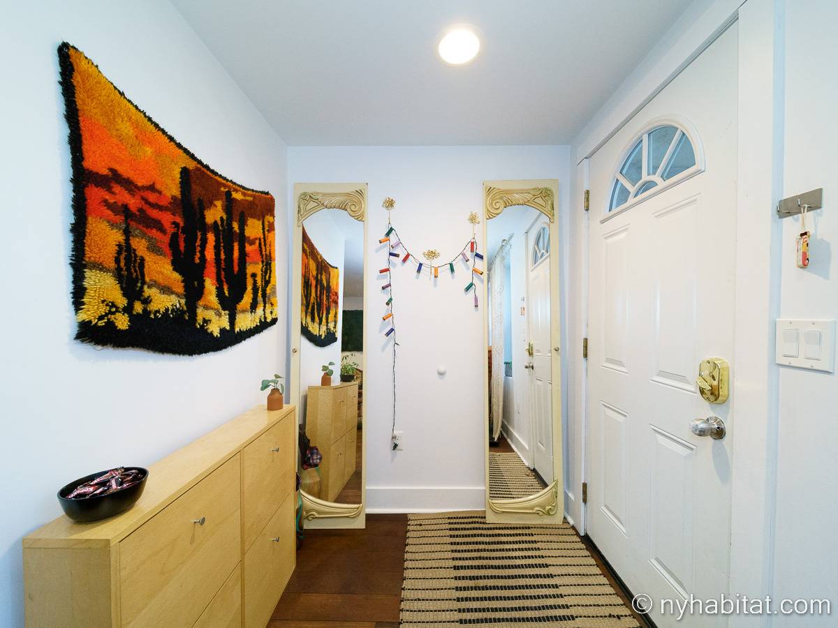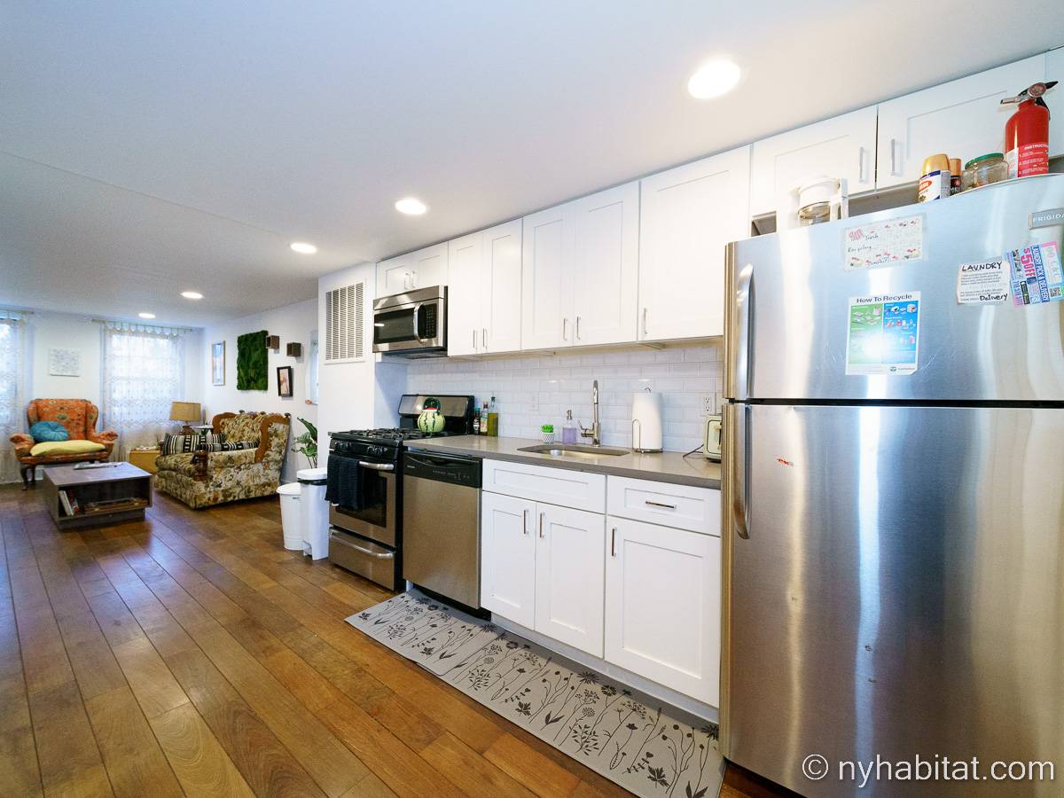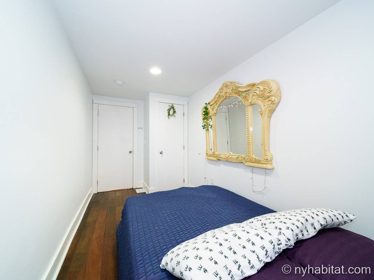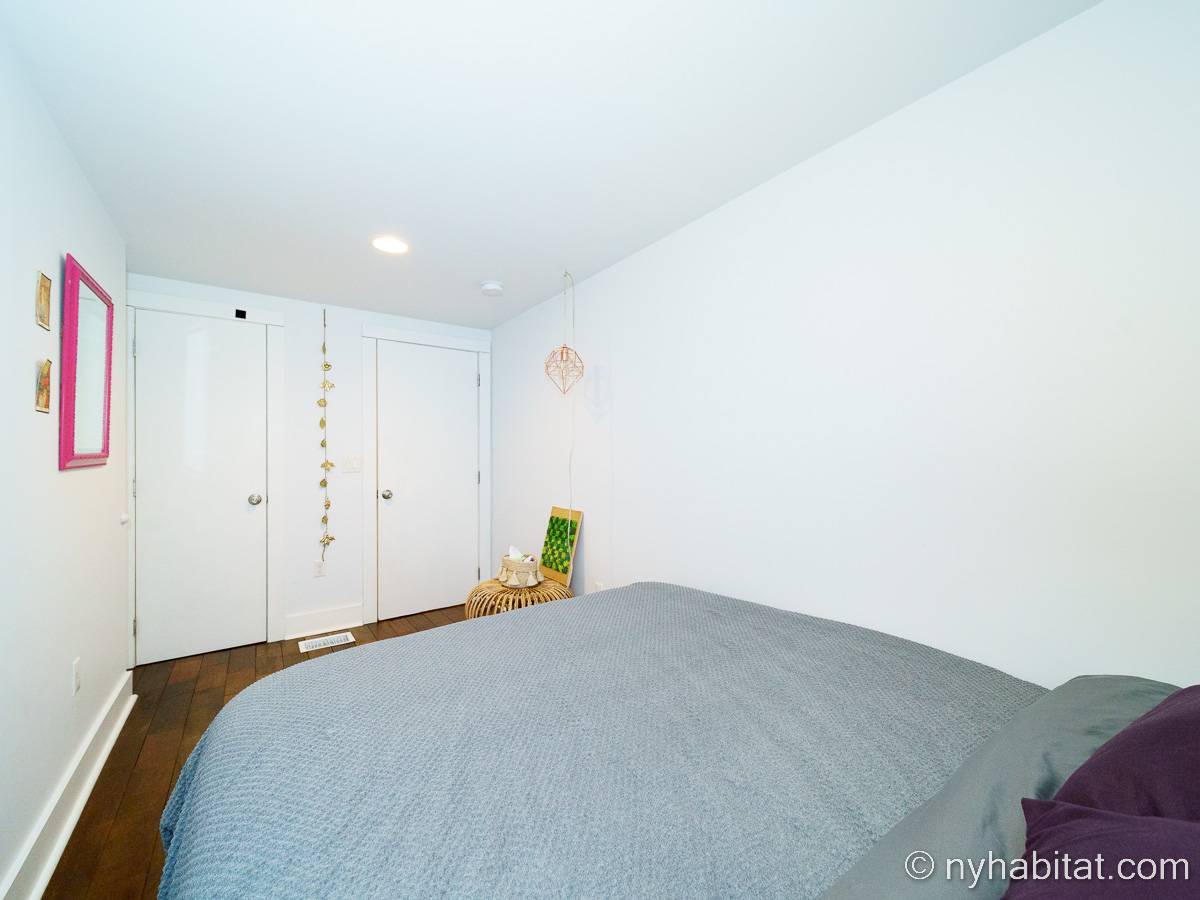 The apartment features a living room and two bedrooms facing the backyard area, offering a serene view to help you unwind after a long day exploring the city. Both rooms in the apartment offer closet space for storage. The apartment also features a modernly designed bathroom with a tub and rainfall shower, toilet, vanity mirror, and sink with storage cabinets beneath.The backyard can be accessed through one of the bedrooms. This outdoor space is a rare find in NYC and is perfect for escaping the hustle and bustle of city life.