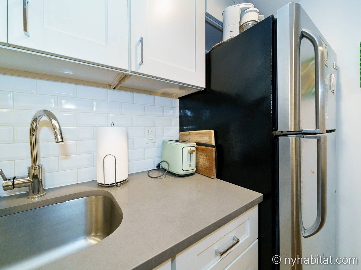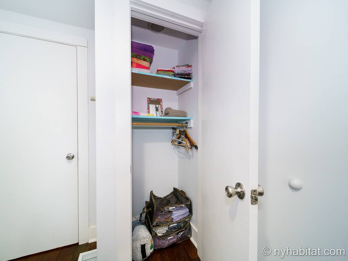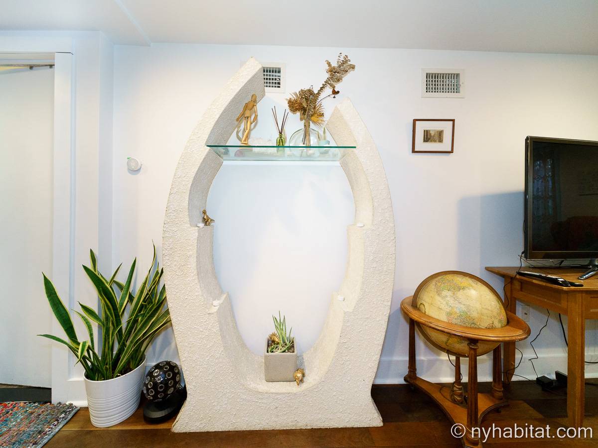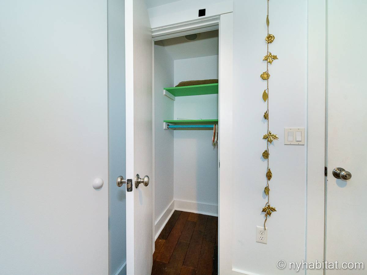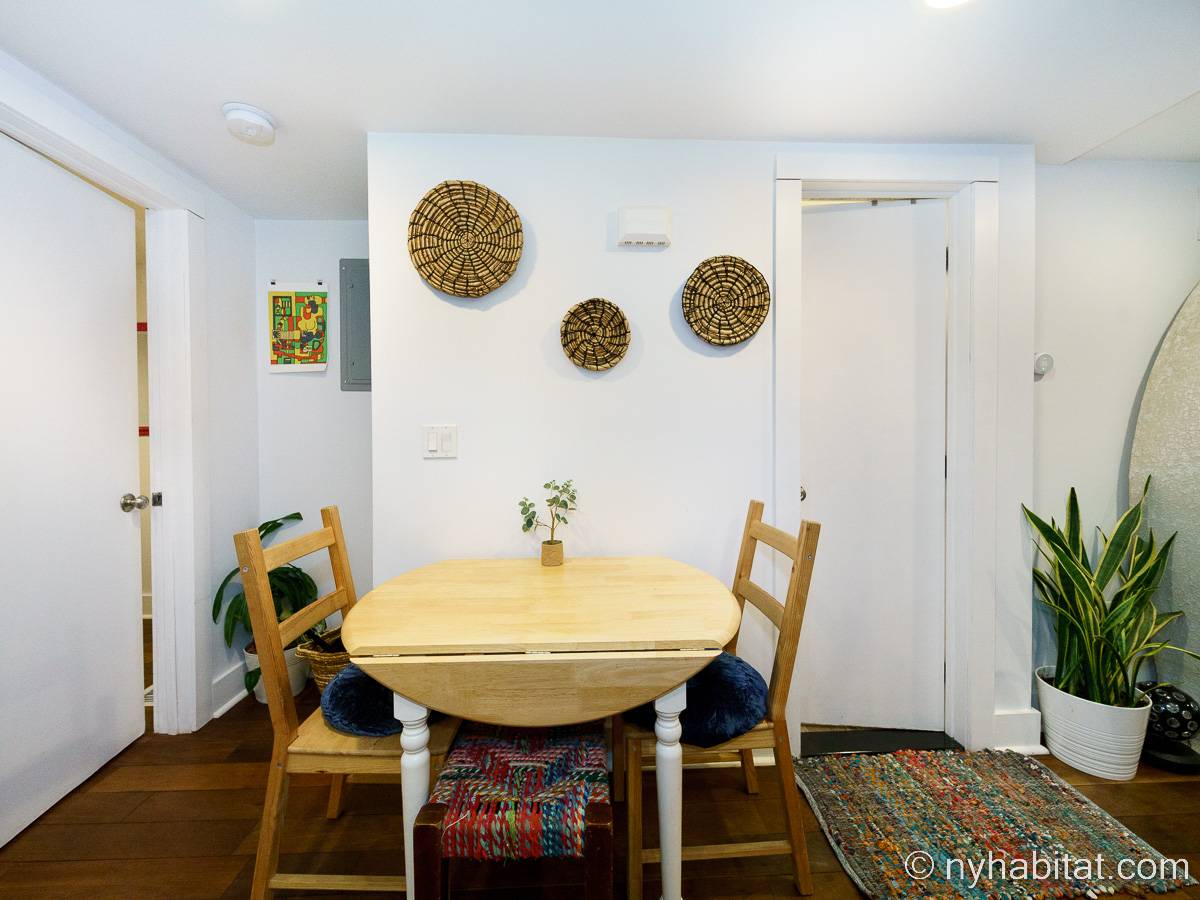 The apartment features a living room and two bedrooms facing the backyard area, offering a serene view to help you unwind after a long day exploring the city. Both rooms in the apartment offer closet space for storage. The apartment also features a modernly designed bathroom with a tub and rainfall shower, toilet, vanity mirror, and sink with storage cabinets beneath.The backyard can be accessed through one of the bedrooms. This outdoor space is a rare find in NYC and is perfect for escaping the hustle and bustle of city life.