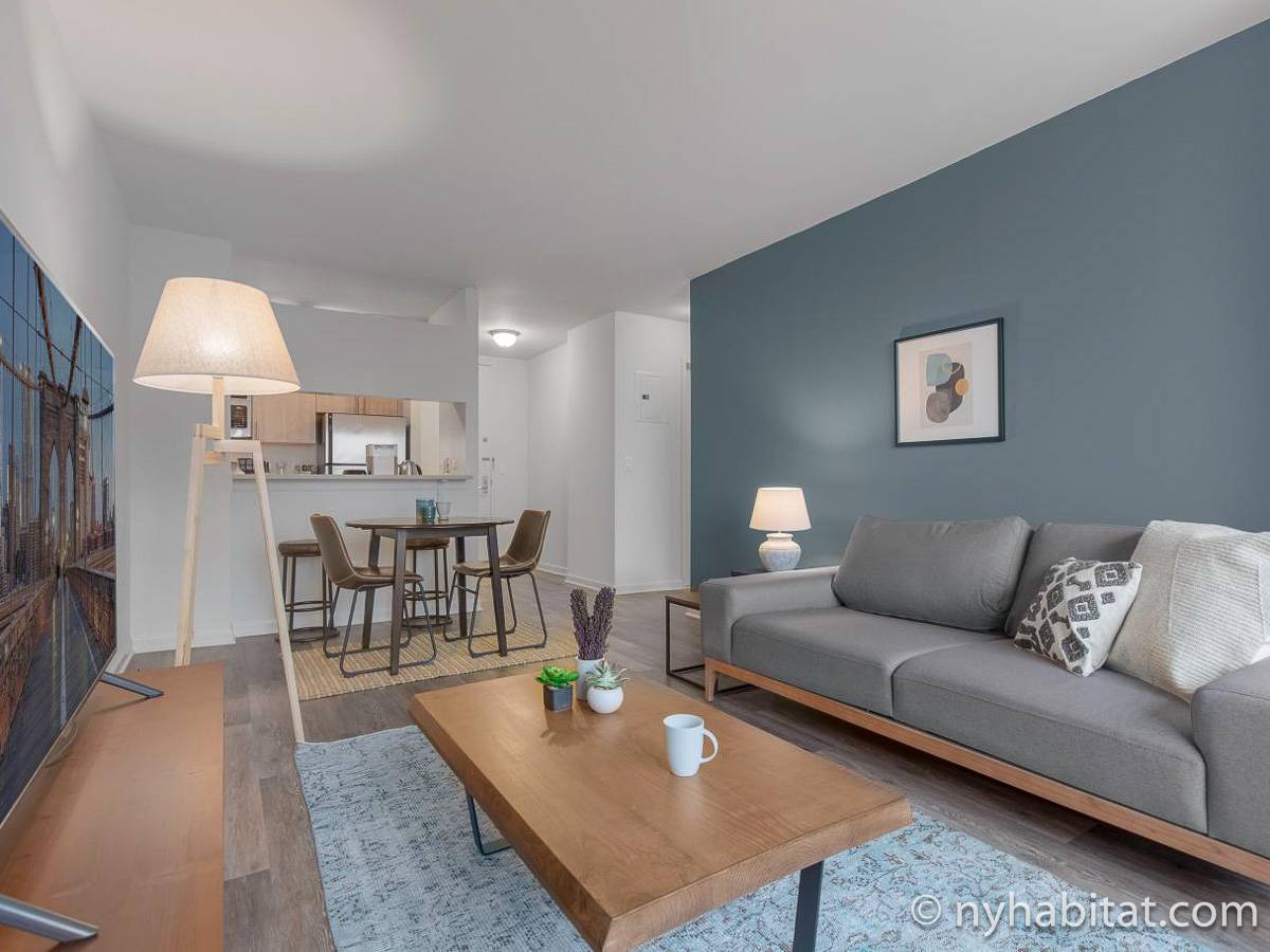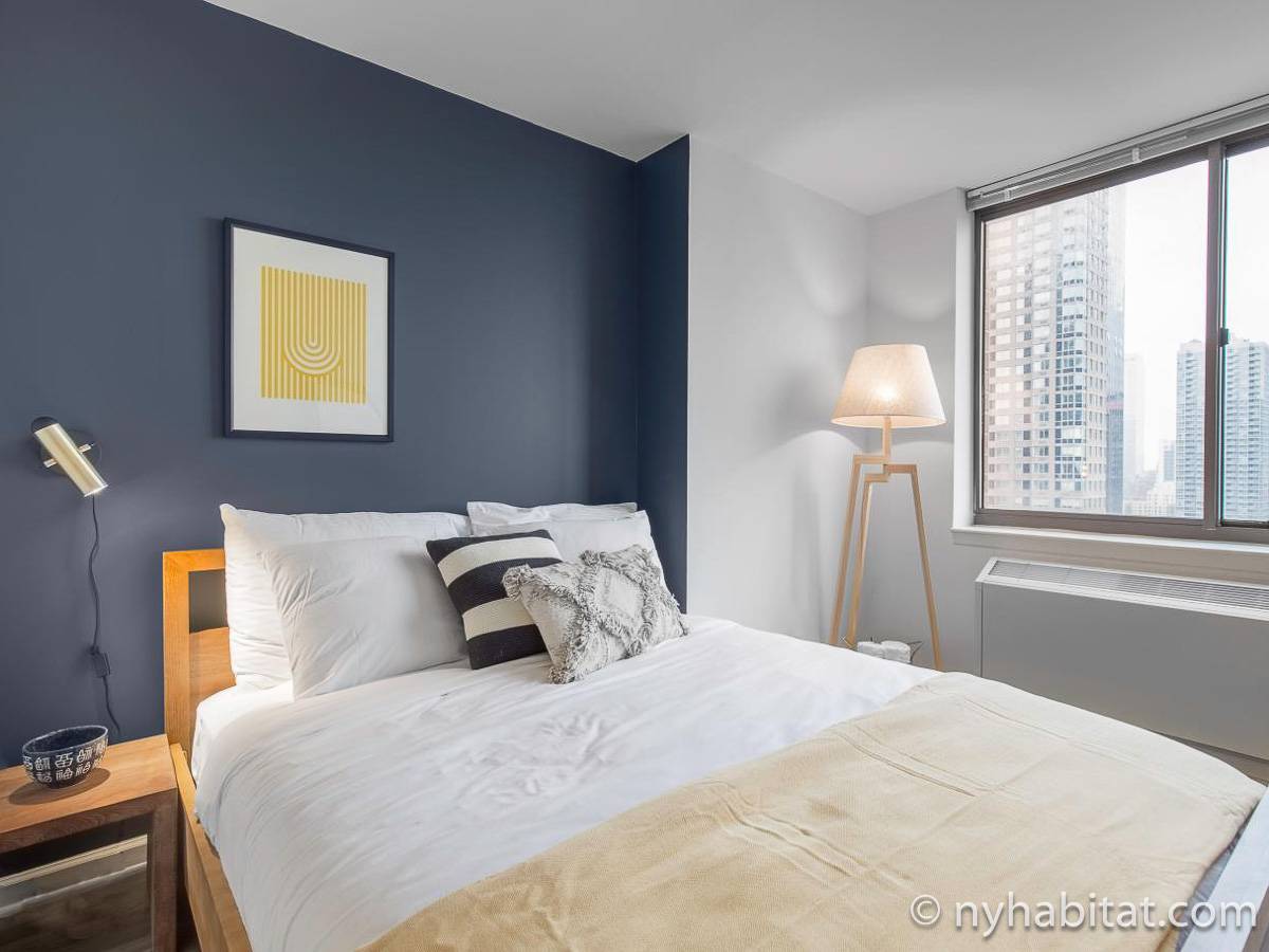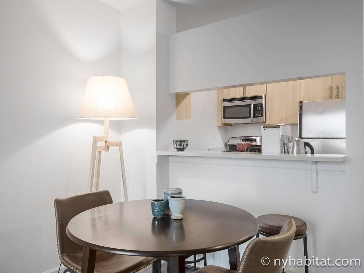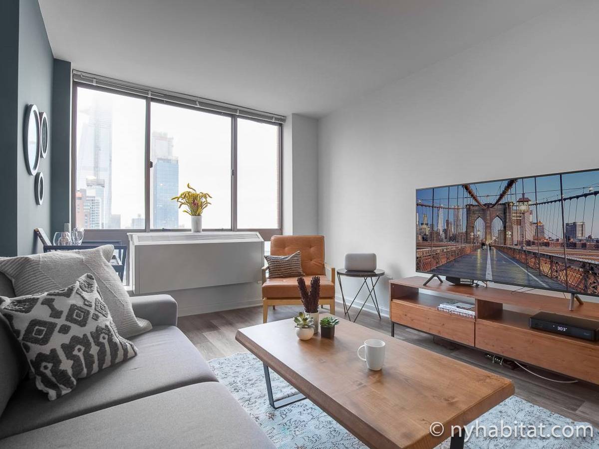 This serene 1 bedroom furnished apartment is styled with comfort in mind, with wood furnishings and a subdued color palette that exudes a relaxing ambiance even in the middle of the city. The apartment features hardwood floors and air conditioning throughout and is stylishly furnished with all the comforts of home. Picture yourself relaxing in the living room as sunlight brightens the space while you look out on views of Manhattan. Enjoy a movie night at home on the flat screen AppleTV or sit down to a home cooked meal at the dining table for two. The kitchen is equipped with all you need for preparing meals including a Nespresso machine and a handy dishwasher for quick clean-up. After a long day, sink into the queen size bed and drift off to sleep with the twinkling city lights outside your window. Plenty of closet space offers storage for your belongings. The bathroom is equipped with a combo tub/shower, mirrored vanity, a toilet, and sink with cabinet space beneath for storage.