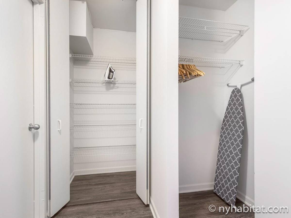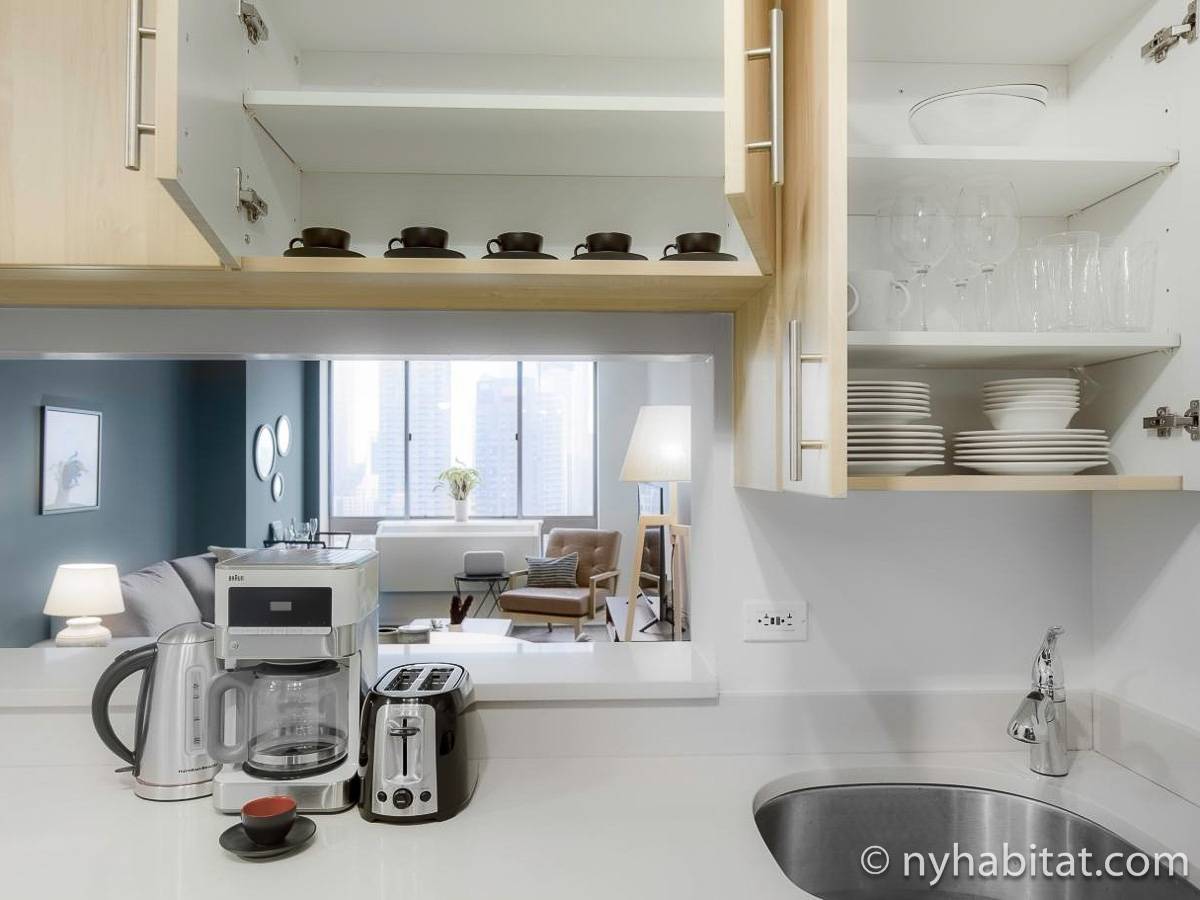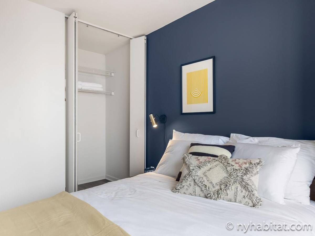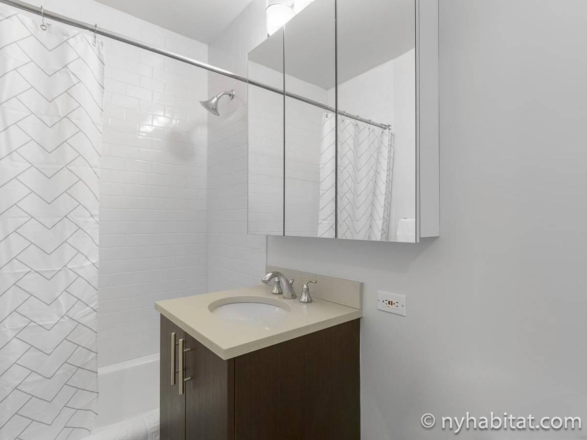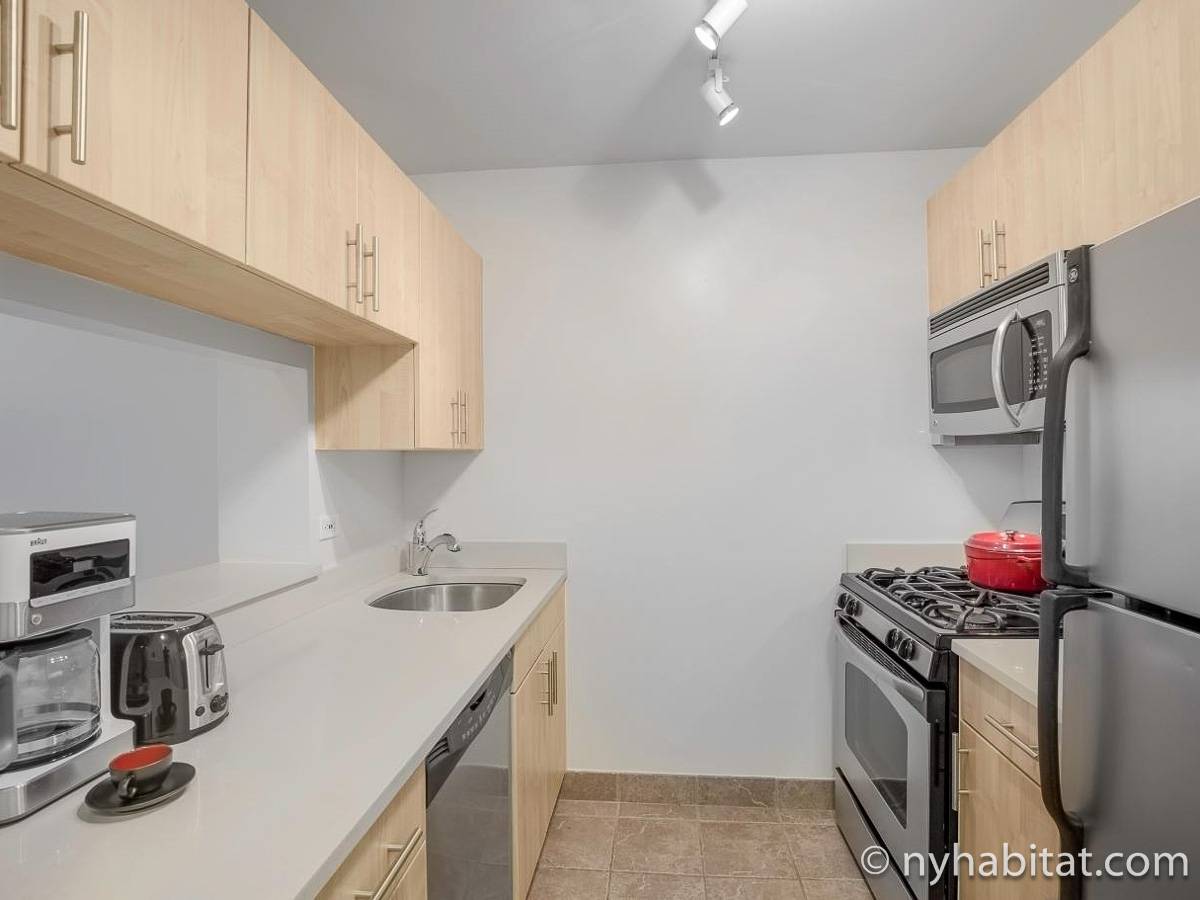This serene 1 bedroom furnished apartment is styled with comfort in mind, with wood furnishings and a subdued color palette that exudes a relaxing ambiance even in the middle of the city. The apartment features hardwood floors and air conditioning throughout and is stylishly furnished with all the comforts of home. Picture yourself relaxing in the living room as sunlight brightens the space while you look out on views of Manhattan. Enjoy a movie night at home on the flat screen AppleTV or sit down to a home cooked meal at the dining table for two. The kitchen is equipped with all you need for preparing meals including a Nespresso machine and a handy dishwasher for quick clean-up. After a long day, sink into the queen size bed and drift off to sleep with the twinkling city lights outside your window. Plenty of closet space offers storage for your belongings. The bathroom is equipped with a combo tub/shower, mirrored vanity, a toilet, and sink with cabinet space beneath for storage.