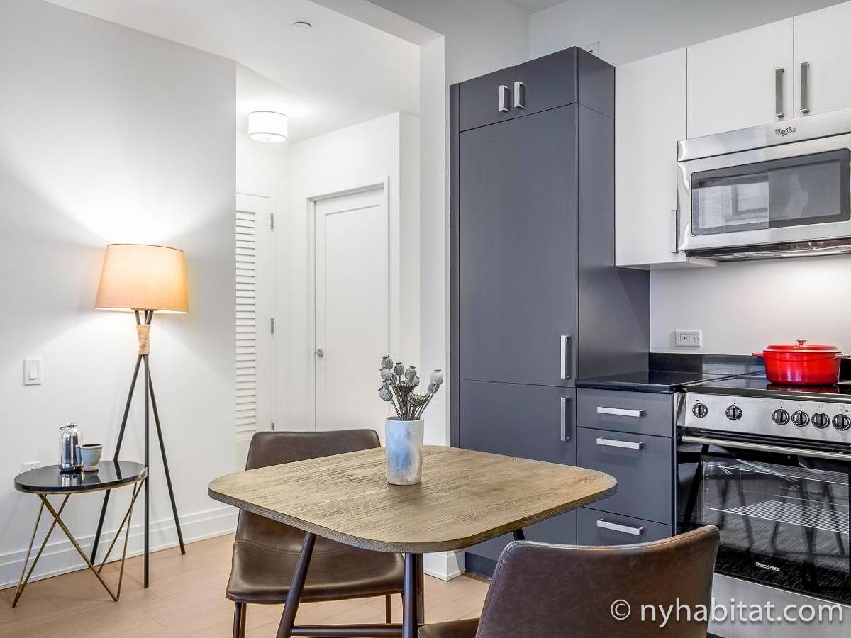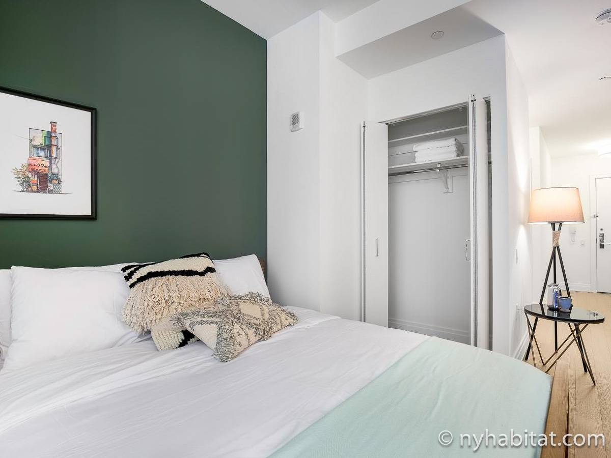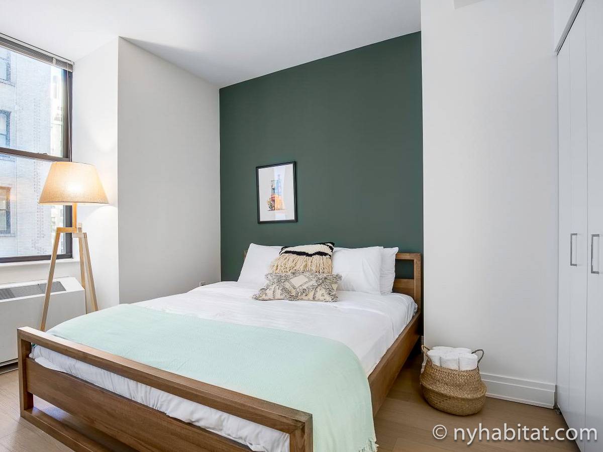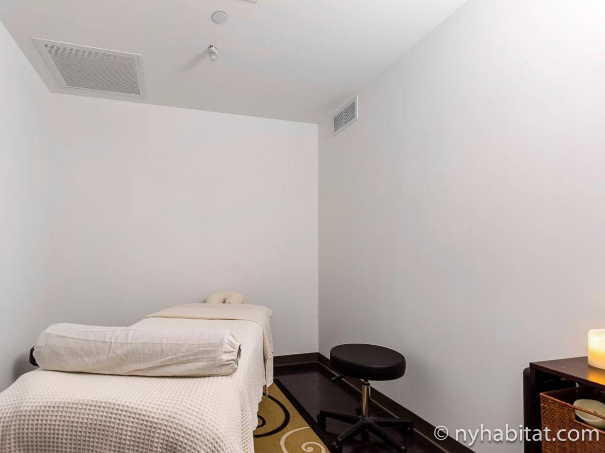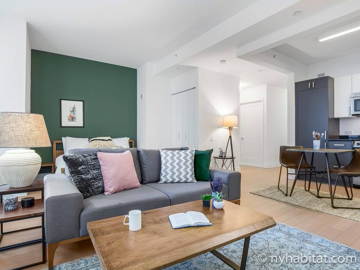 Modern and comfortable, this Murray Hill furnished studio apartment in Manhattan near East 33rd Street & Lexington Avenue has all one can ask for and then some. It is on the 16th floor (equivalent to the European 15th floor) of an elevator building. The high-rise building features laundry facilities, a fitness gym, massage center, bowling alley, and tenant meeting areas.
