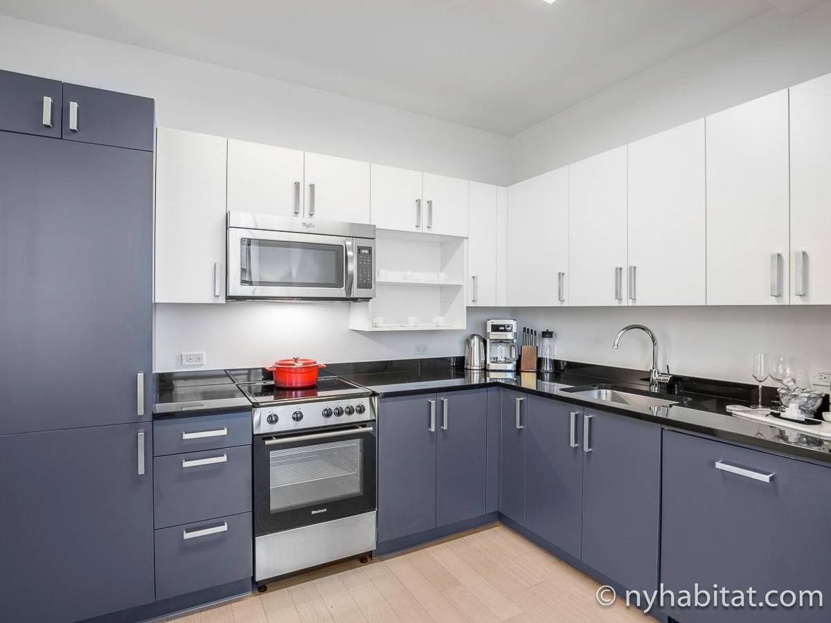 Residing at this Murray Hill furnished rental, one will be replenished after a night on the queen-sized bed. The living area features two large windows providing natural light, a comfy sofa sharing the layout with a coffee table, and an impressive flat-screen TV. Seamlessly, the open-kitchen blends in and has all the hi-tech stainless-steel appliances with ample countertop space for effortless food preparation. A small dining table fit for two is directly across.