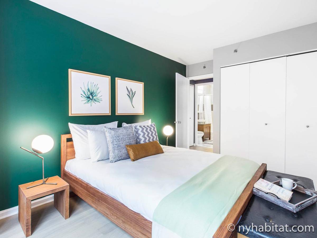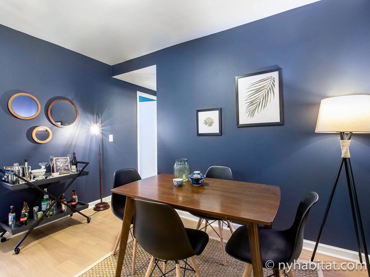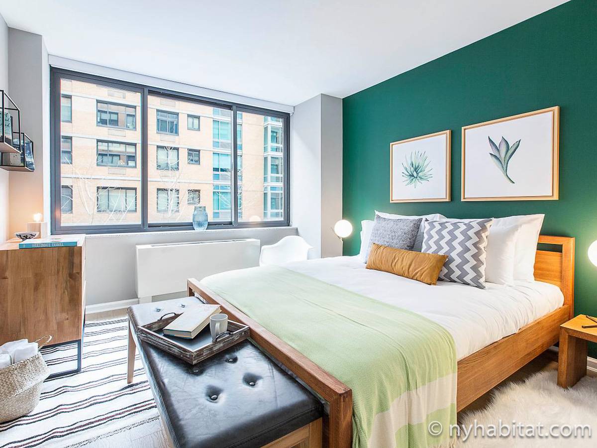 In the kitchen you have just about everything you’ll ever need: stove, oven, refrigerator, microwave, toaster, coffeemaker, blender, and even a dishwasher, a rarity in Manhattan. Then take your meals to the dining area, with a dark touch that makes the space intimate but has plenty of space for four. The bedroom creates an environment that makes it hard to leave. The accent wall adds some color, while the wooden furniture keeps it warm. After a long day, hop in the double-size bed and cuddle up in the sheets, enjoying some natural light from the large window and the view that accompanies it. Air conditioning flows throughout the apartment rental.