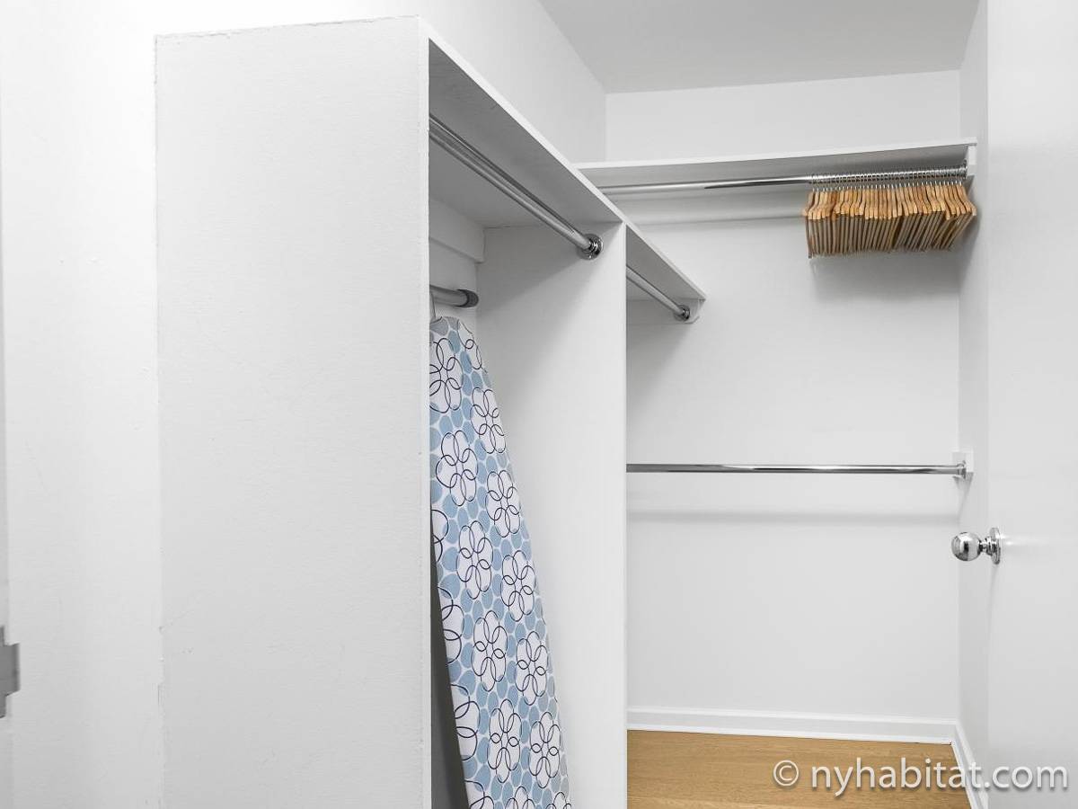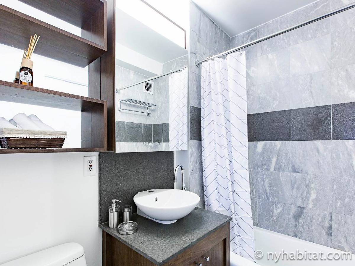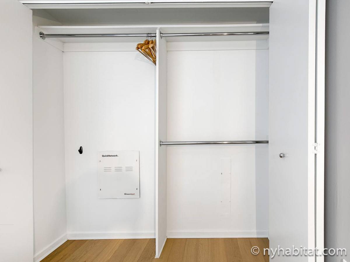 In the kitchen you have just about everything you’ll ever need: stove, oven, refrigerator, microwave, toaster, coffeemaker, blender, and even a dishwasher, a rarity in Manhattan. Then take your meals to the dining area, with a dark touch that makes the space intimate but has plenty of space for four. The bedroom creates an environment that makes it hard to leave. The accent wall adds some color, while the wooden furniture keeps it warm. After a long day, hop in the double-size bed and cuddle up in the sheets, enjoying some natural light from the large window and the view that accompanies it. Air conditioning flows throughout the apartment rental.