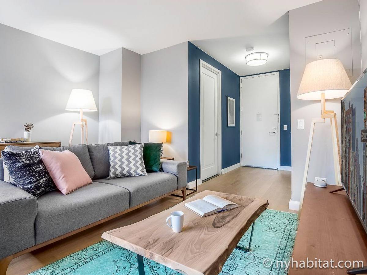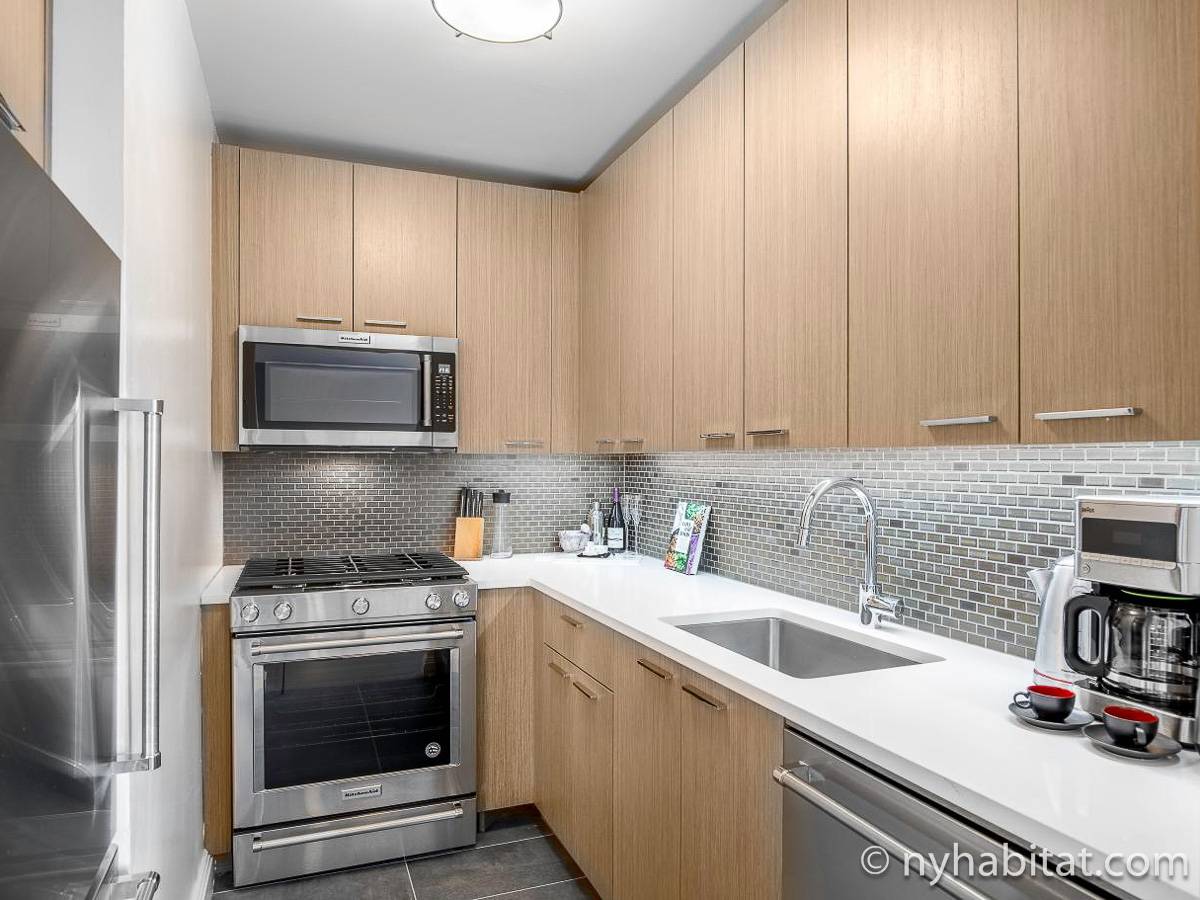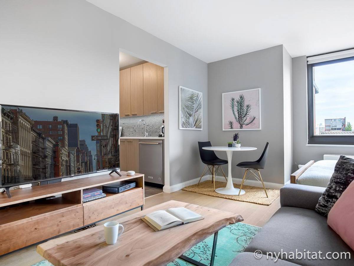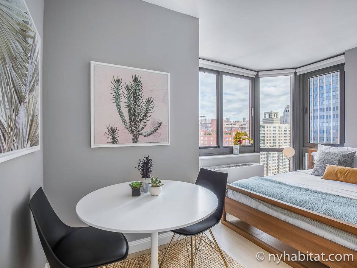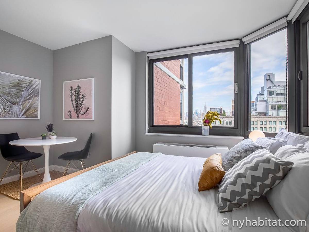 Step into the homey comfort of a rental apartment already furnished with everything you need for a comfortable stay in NYC. This studio apartment is decorated in soothing tones with natural wood furnishings that truly make it a peaceful home base amongst the energy of the city. The central living room area is an inviting space where you can kick back and socialize with friends on the sofa or watch the flat screen TV. Off this space is the kitchen where you can whip up your favorite dishes in the comfort of home. Designed with light wood cabinetry and stainless steel appliances including a dishwasher, it’s fully equipped for all your culinary endeavors. A table for two sits in the corner for a cozy spot to enjoy a meal. A double bed rests in the sleeping area near a corner of wrap around windows so you can drift off to sleep with city views. The bathroom is sleek with marble tiles, a modern sink and large vanity mirror. Laundry facilities are conveniently located in the building. An on-site fitness center and refreshing indoor pool provide options for getting your workout in. Mingle in the resident lounge or enjoy a sunny day on the rooftop sundeck. You’re sure to enjoy calling this spot home.