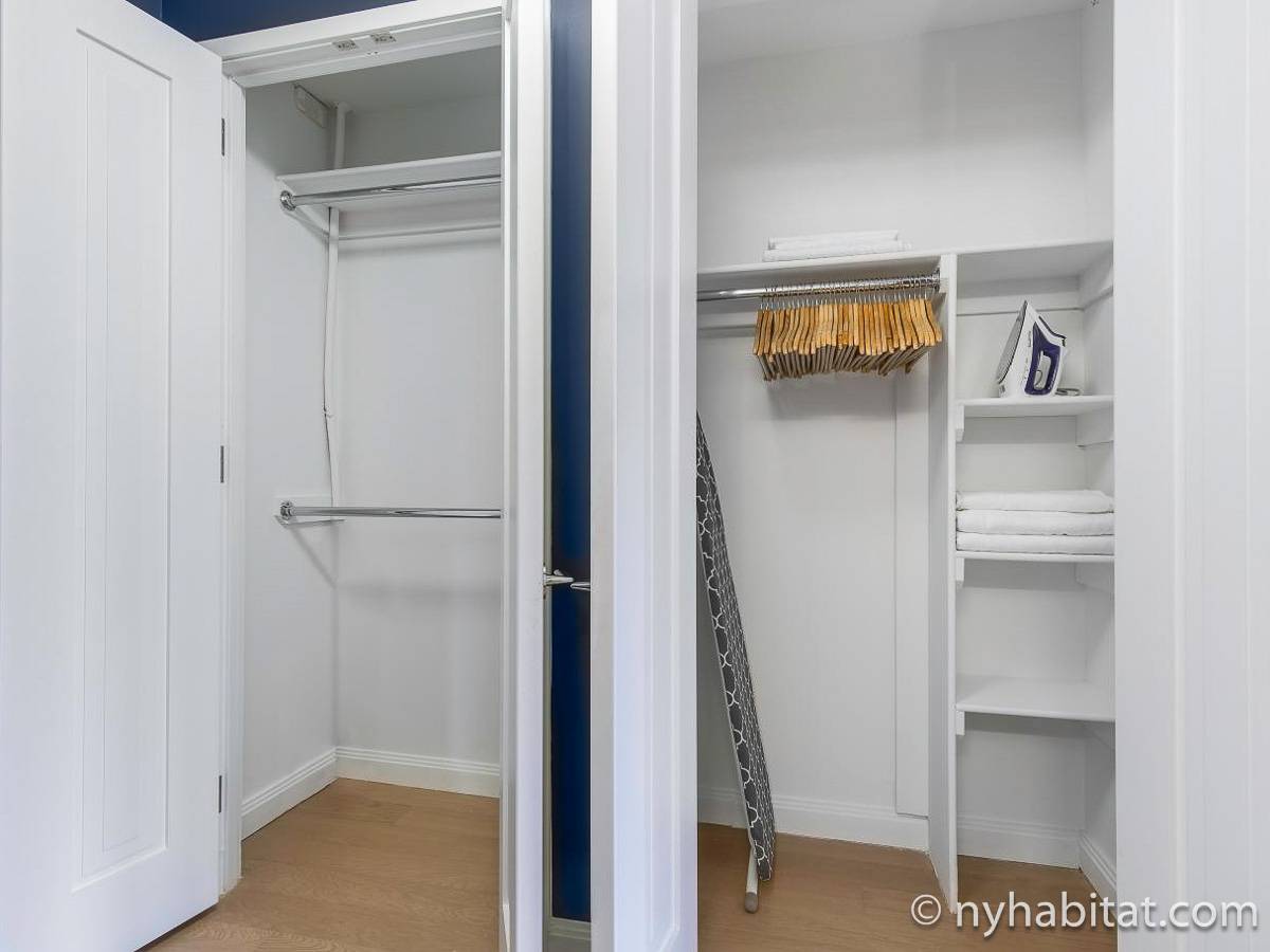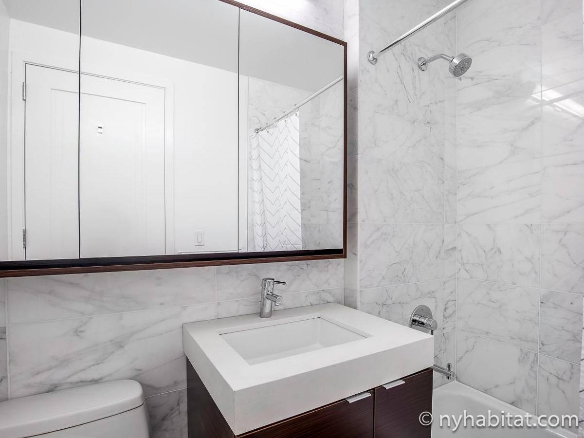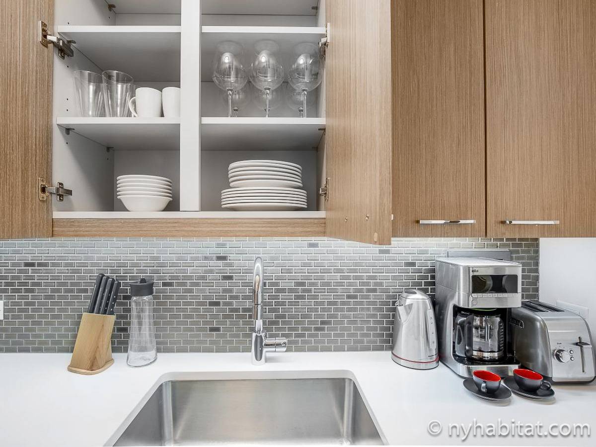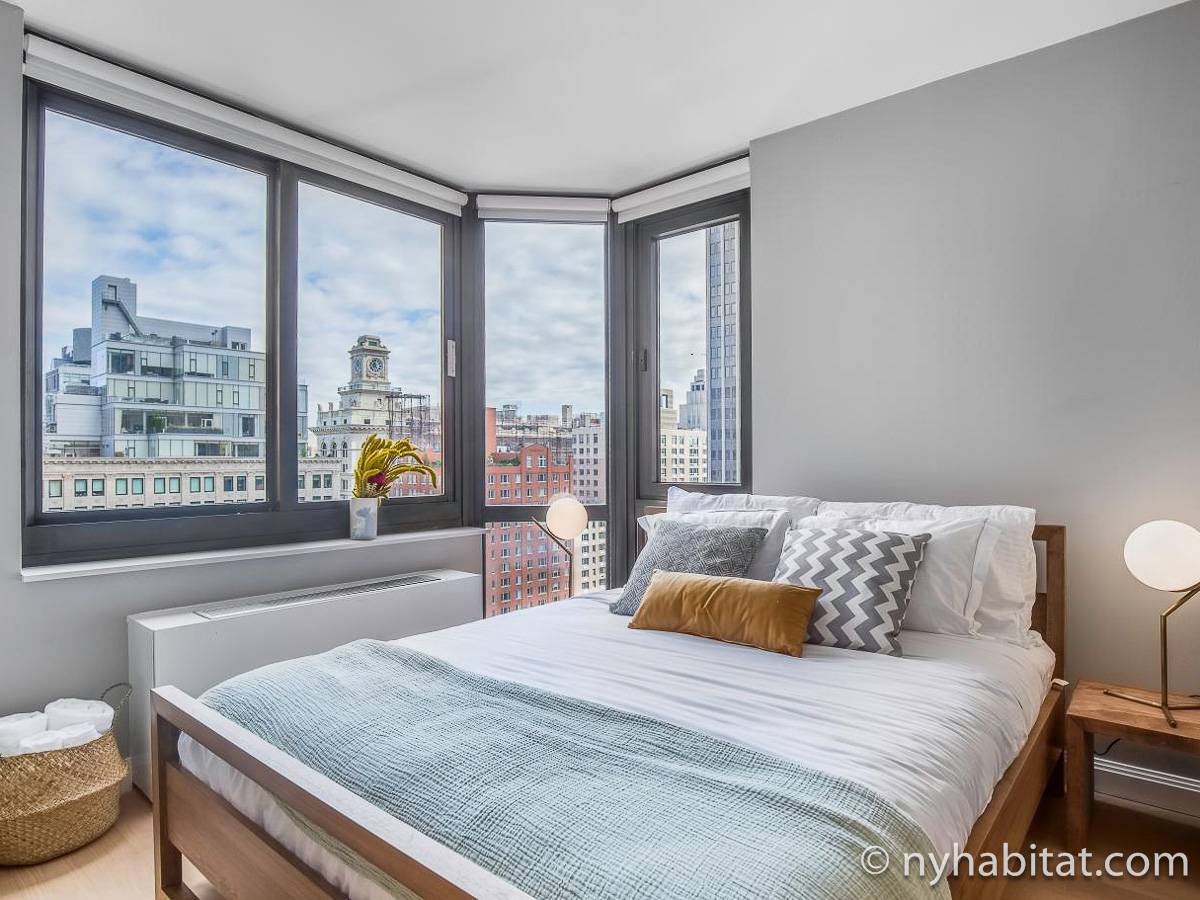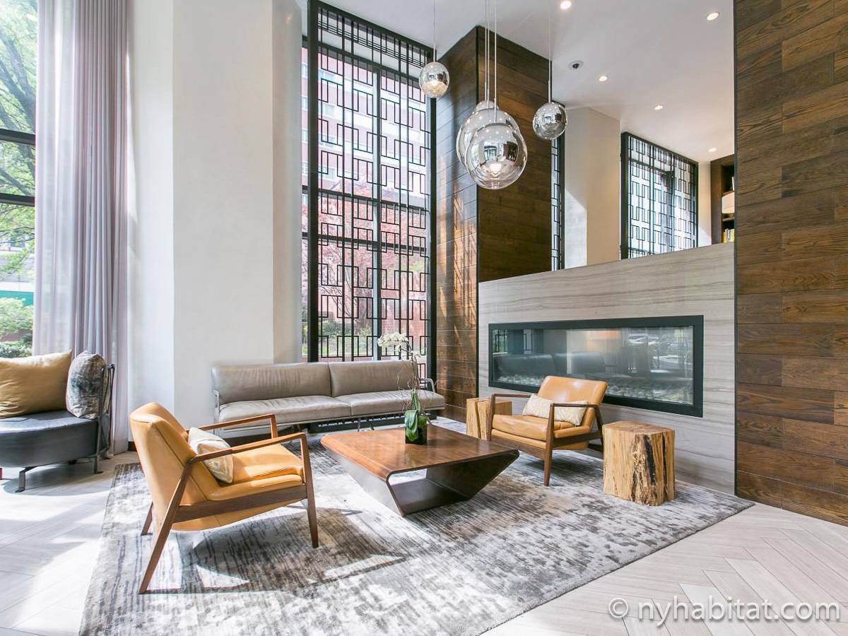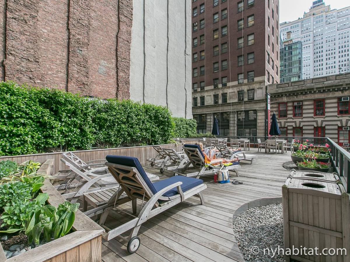 Step into the homey comfort of a rental apartment already furnished with everything you need for a comfortable stay in NYC. This studio apartment is decorated in soothing tones with natural wood furnishings that truly make it a peaceful home base amongst the energy of the city. The central living room area is an inviting space where you can kick back and socialize with friends on the sofa or watch the flat screen TV. Off this space is the kitchen where you can whip up your favorite dishes in the comfort of home. Designed with light wood cabinetry and stainless steel appliances including a dishwasher, it’s fully equipped for all your culinary endeavors. A table for two sits in the corner for a cozy spot to enjoy a meal. A double bed rests in the sleeping area near a corner of wrap around windows so you can drift off to sleep with city views. The bathroom is sleek with marble tiles, a modern sink and large vanity mirror. Laundry facilities are conveniently located in the building. An on-site fitness center and refreshing indoor pool provide options for getting your workout in. Mingle in the resident lounge or enjoy a sunny day on the rooftop sundeck. You’re sure to enjoy calling this spot home.
