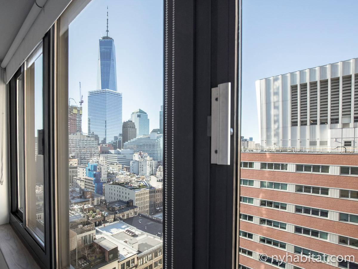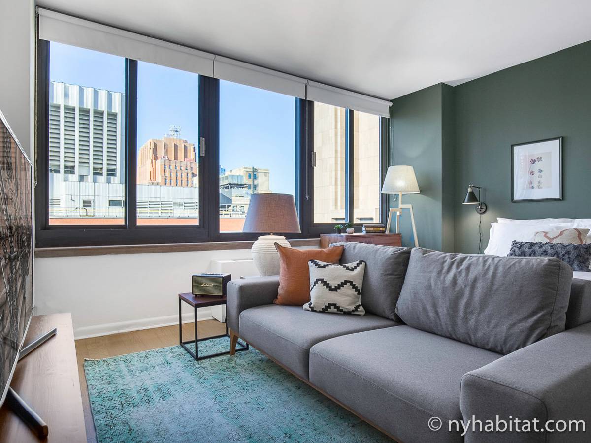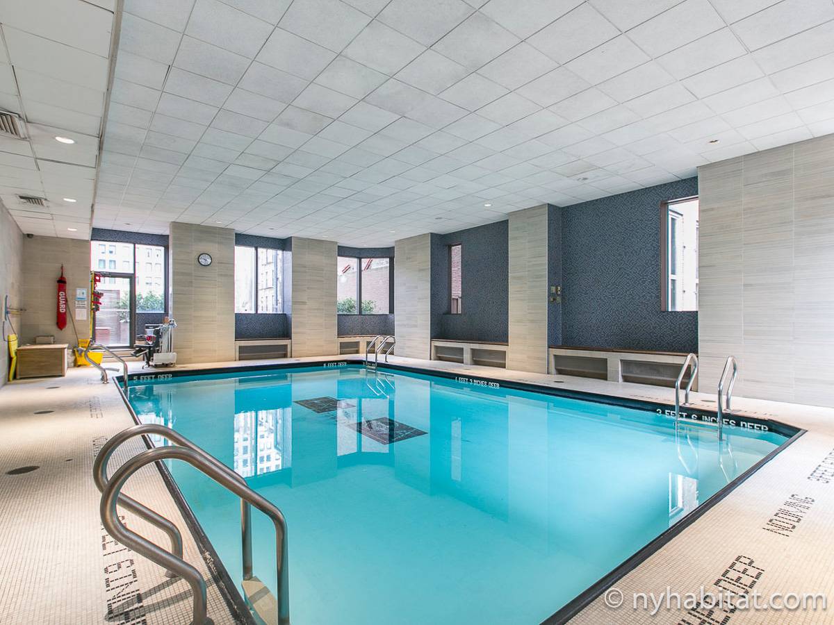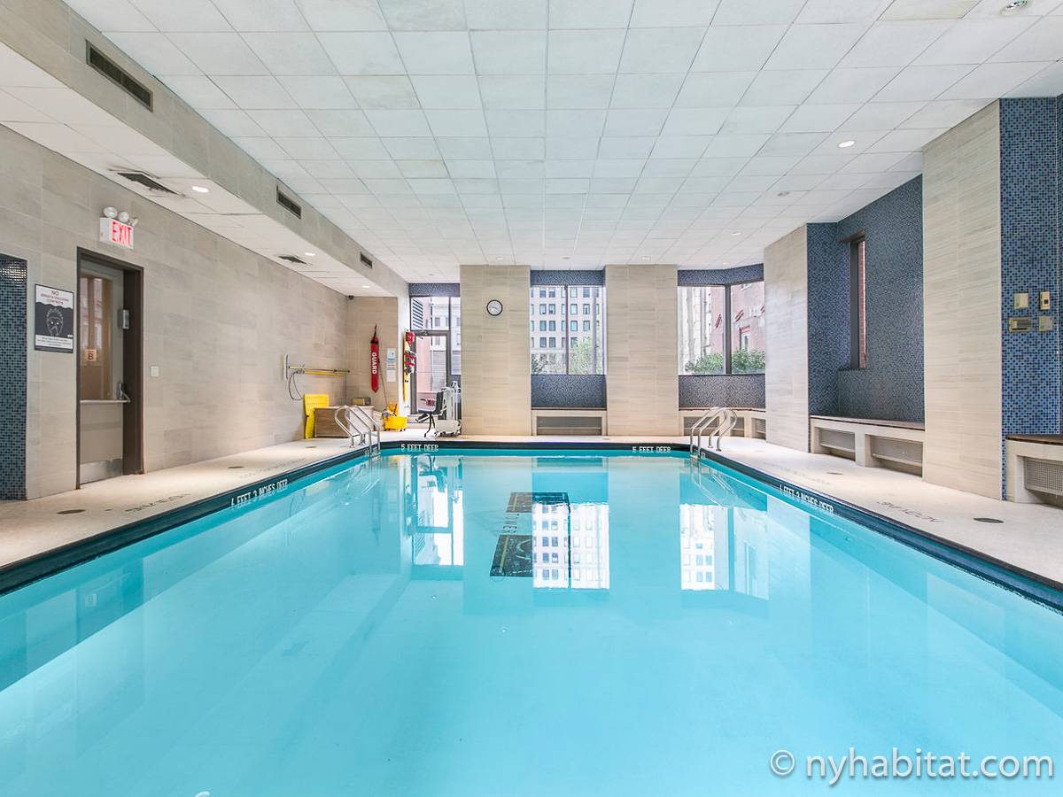 This fully furnished, 469 square feet (44 square meters) apartment is available to sublet between Duane Street & Broadway in Tribeca, New York! This high-rise apartment building is accommodated with a gym, an indoor swimming pool, and elevators at your convenience!