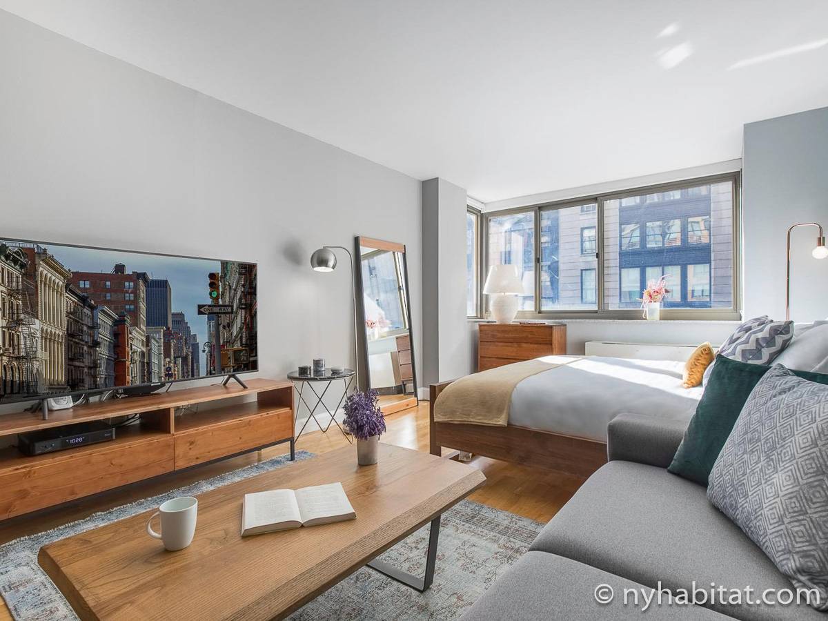 This Chelsea furnished studio apartment has wood flooring and is designed in a neutral color palette. Relax in the queen bed after a long day in the city, where you can watch the flat screen TV. Wardrobe cabinets and closets offer storage space for your belongings and a desk and chair provide a spot to work or study. The open kitchen has you covered with all the basics for cooking at home while a dining table for two provides a spot to sit and enjoy it. The bathroom is equipped with a glass enclosed shower.