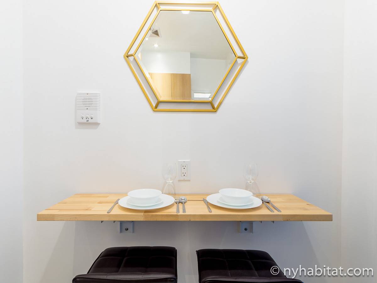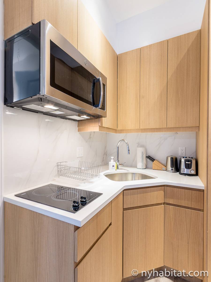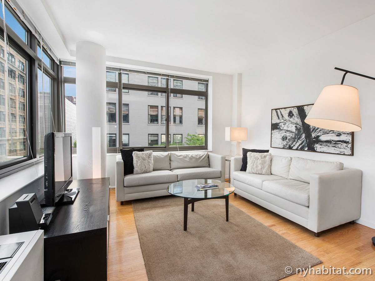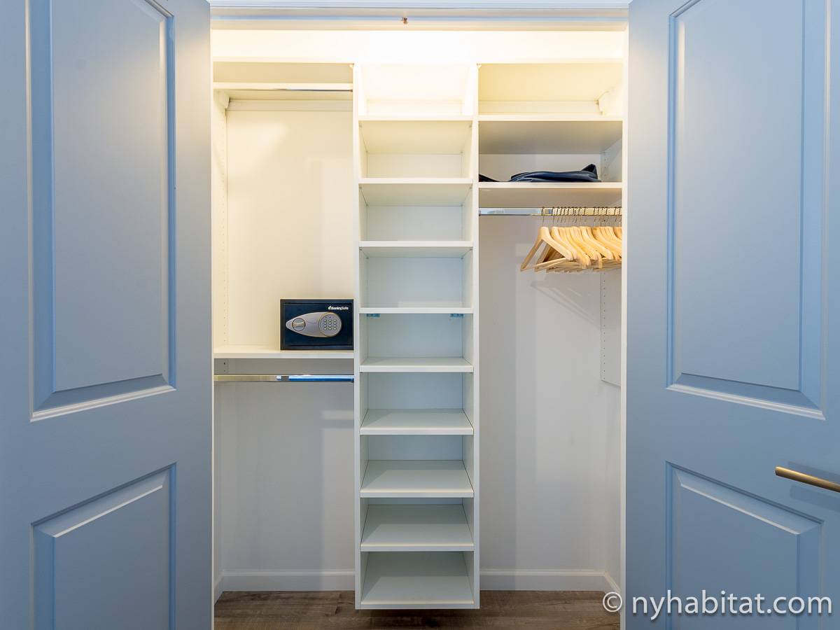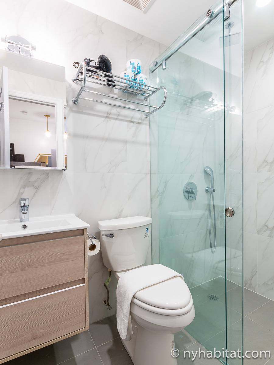 This modern style two-bedroom apartment is available at West 3rd Street & 6th Avenue in Greenwich Village, New York! It is 354 square feet (33 sqm) in size and located on the 2nd floor out of 4 total floors (equivalent to the European 1st floor). The building offers amenities such as a security system, laundry inside the apartment, and air conditioning. Please also note that this apartment can be rented both as a private apartment and as a roommate share, where the bedrooms are private and the kitchen and bathroom are shared with a roommate.