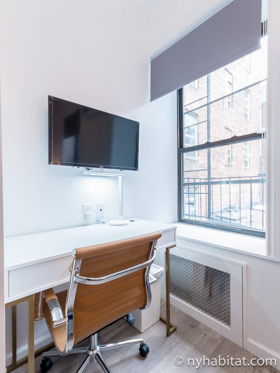 The apartment features hardwood floors and fully furnished living spaces with great organization so you can maximize your space. Each bedroom includes a full-size bed along with personal closet space. There is also a tv and desk in each room so you can work in a private and quiet space, along with a window to provide you with great natural light. The kitchen includes appliances such as the freezer, microwave, toaster, and fridge for your convenience. It has an open layout that includes a dining space to eat. It is also accented with a beautiful marble backsplash so you can keep it looking fresh and clean! The bathroom continues this marble theme on its walls, and has a glass-door shower with smooth tiling.
